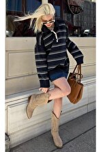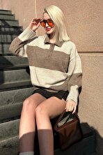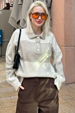 JeepBisiklet Yaka Relaxed Jakarlı Ekru - Lacivert Kazak Kadın J5WL-KZK7050