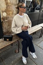 Bisiklet Yaka Relaxed Jakarlı Ekru - Lacivert Kazak Kadın J5WL-KZK7050