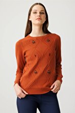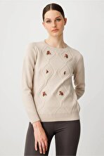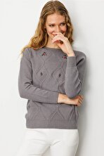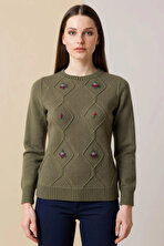 KazeeKadın Taş Detaylı Kısa Kollu Triko Kazak 30792 Haki