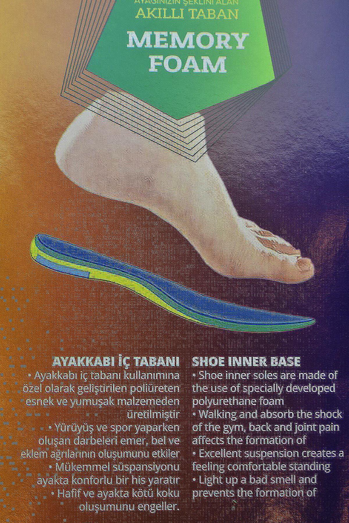 %100 ORJİNAL OLUP ADINIZA FATURALI GÖNDERİM KALIPLAR NORMALDİR. MEVCUT NUMARANIZI SİPARİŞ EDEBİLİRSİNİZ. ORTOPEDİ TABAN YAPISINA SAHİPTİR.DIŞ YÜZEY 1.SINIF FİLE MALZEMEDİR.ÜRÜN TABANI EVA TABAN OLUP AYAK YAPISINA GÖRE ÜRETİLMİŞTİR. TABAN HAFİF HAZIR EVA TABANDIR.GÜNLÜK KULLANIM VE YÜRÜYÜŞ,KOŞU İÇİN UYGUNDUR