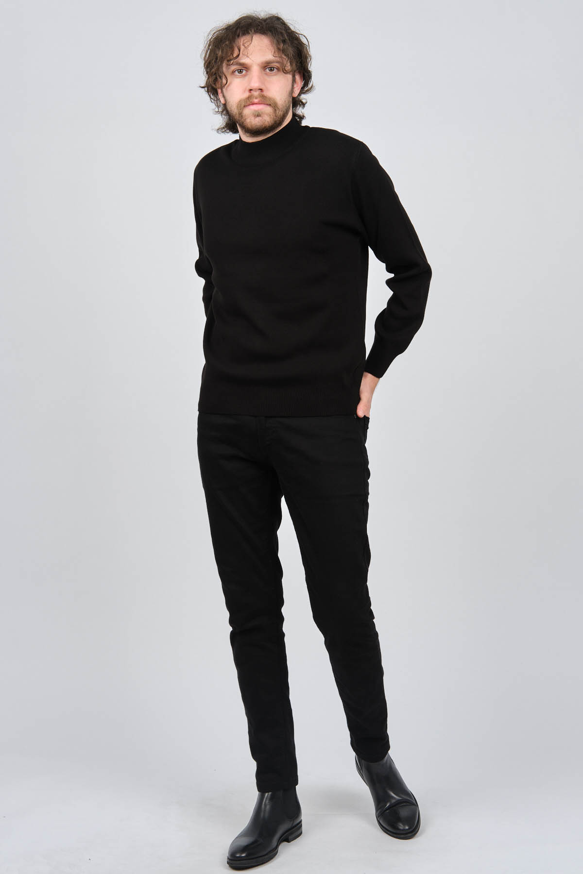 Ürün Tipi: Kazak;Materyal Bilgisi: %100 Akrilik;Kalıp Bilgisi: Standart;Detay: Yarım balıkçı yaka, Uzun kollu, Düz kazak;Model Ölçüleri(cm) / Üzerindeki Ürün: Boy - 188, Göğüs - 102, Bel - 90, Kalça - 103, / M Beden