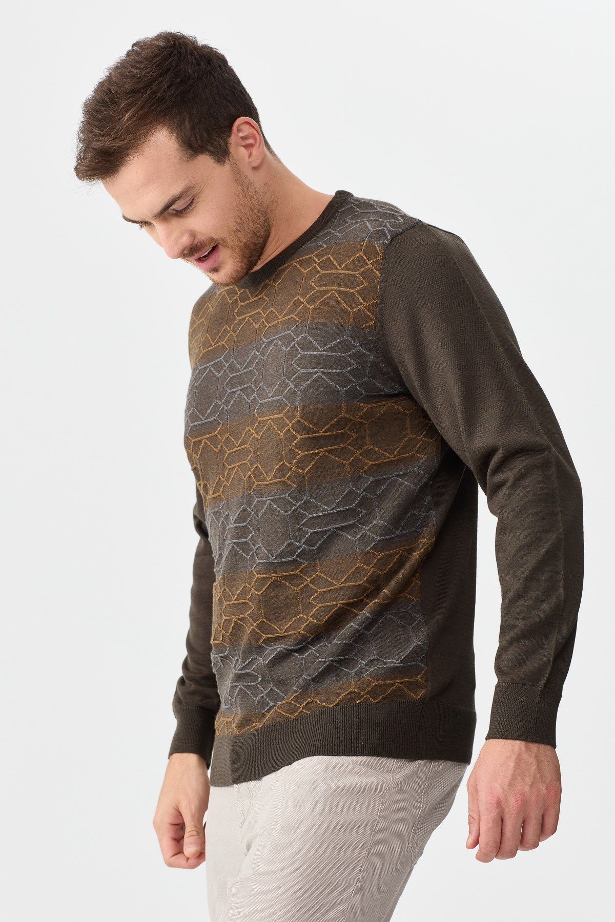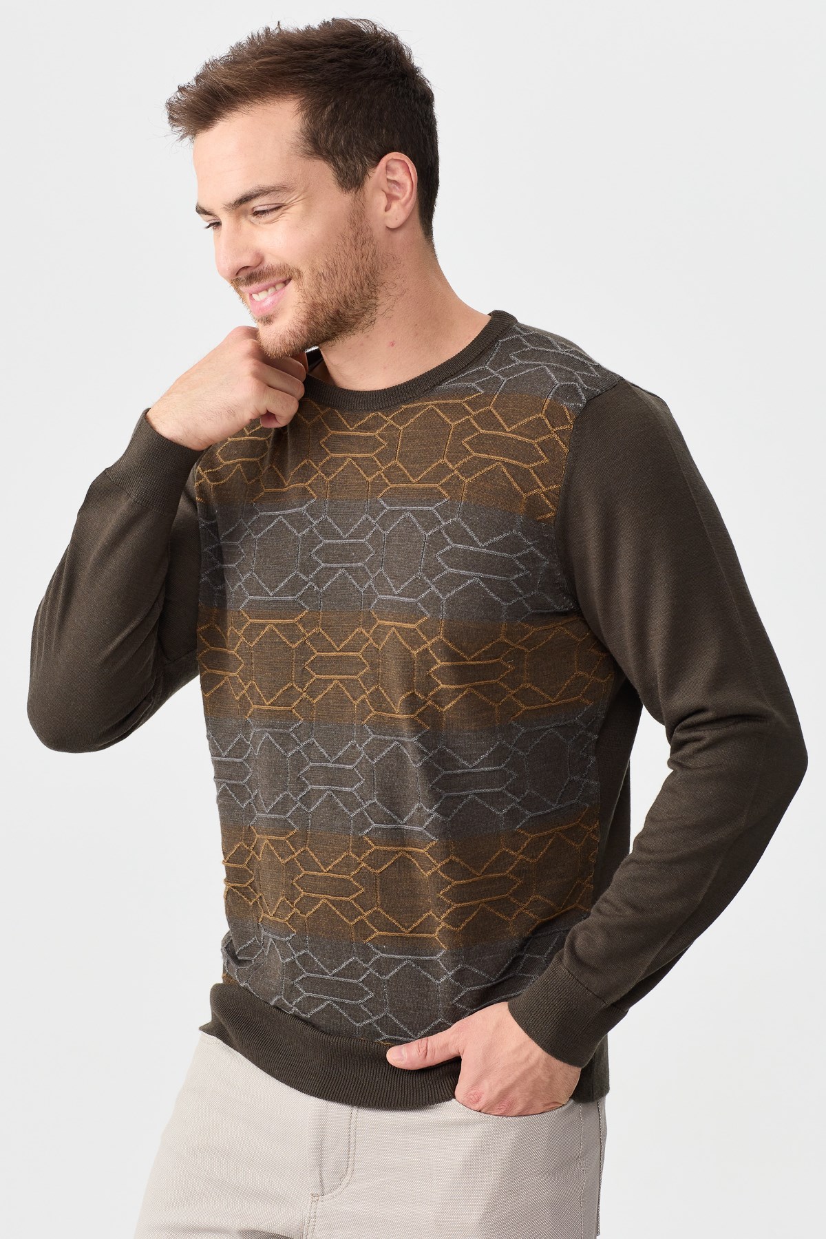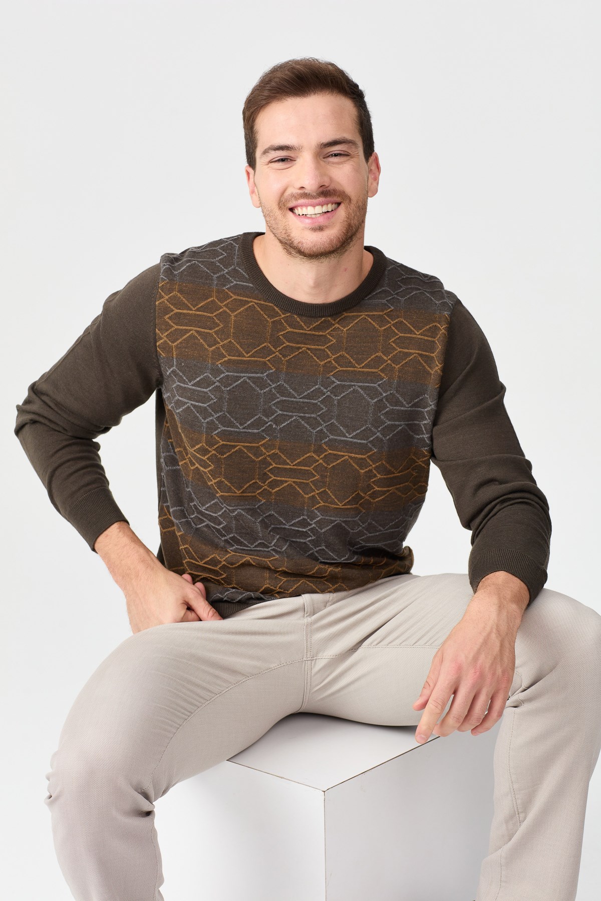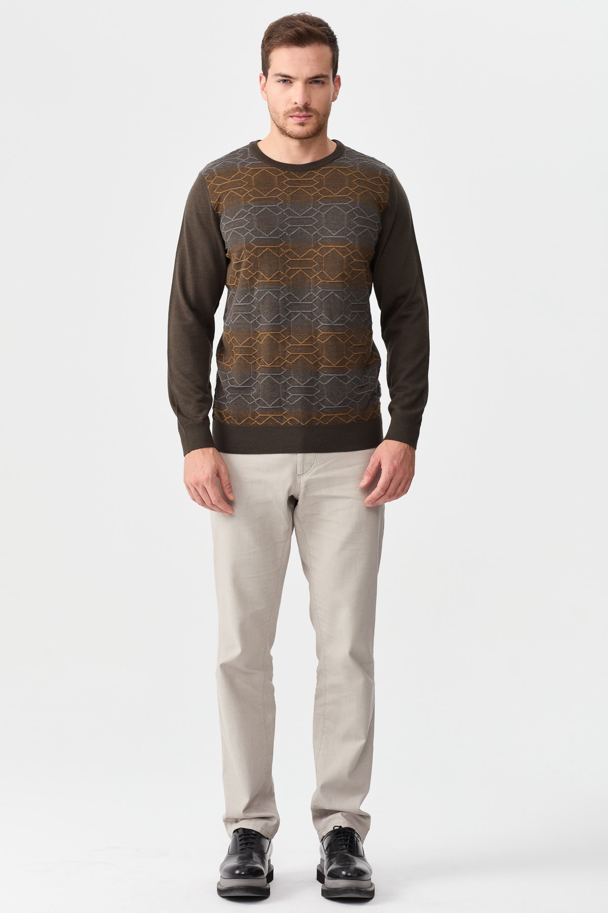 Ürün Tipi: Kazak;Kalıp Bilgisi: Tam kalıp;Detay: Sıfır yaka, desenli kazak;Model Ölçüleri(cm) / Üzerindeki Ürün: Boy - 184, Göğüs - 98, Bel – 80, Basen - 95 / M beden;