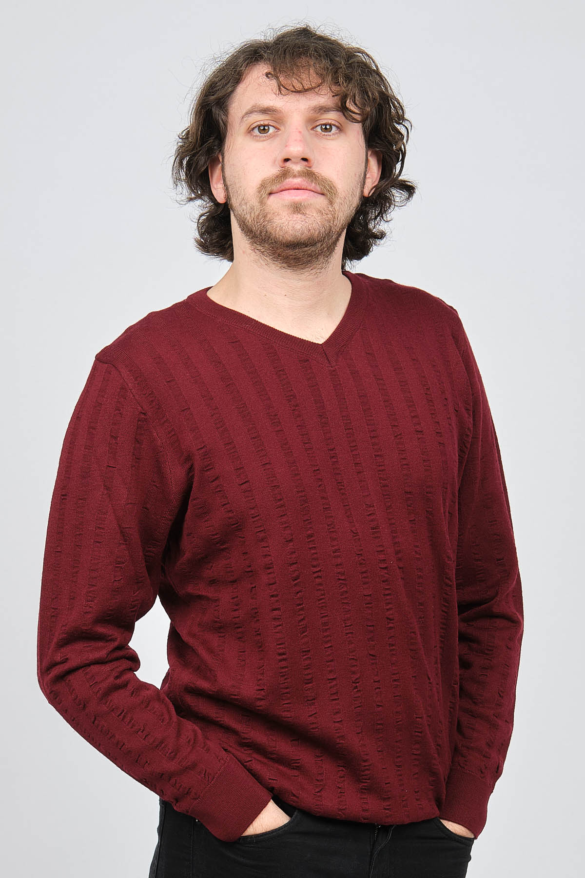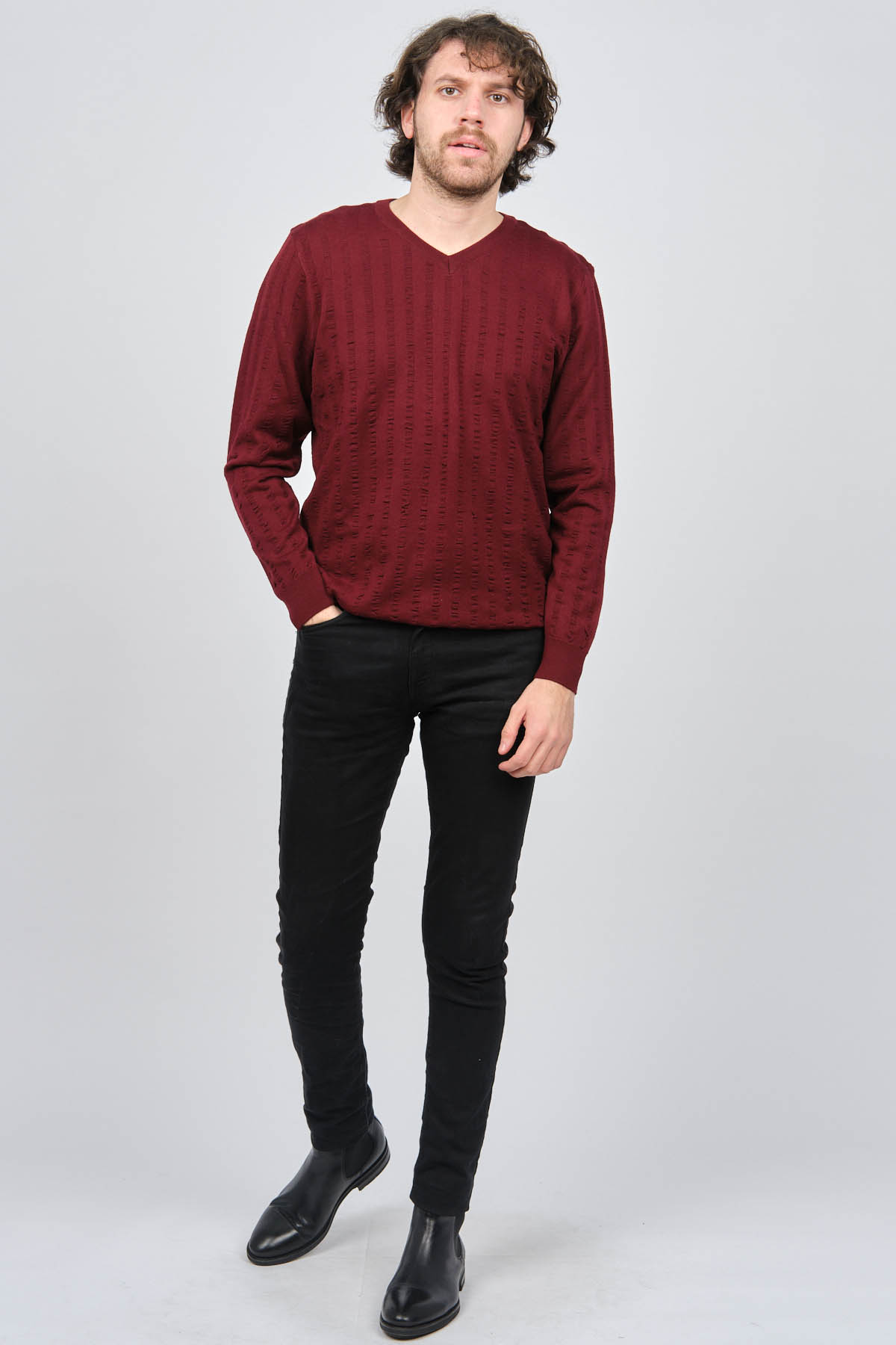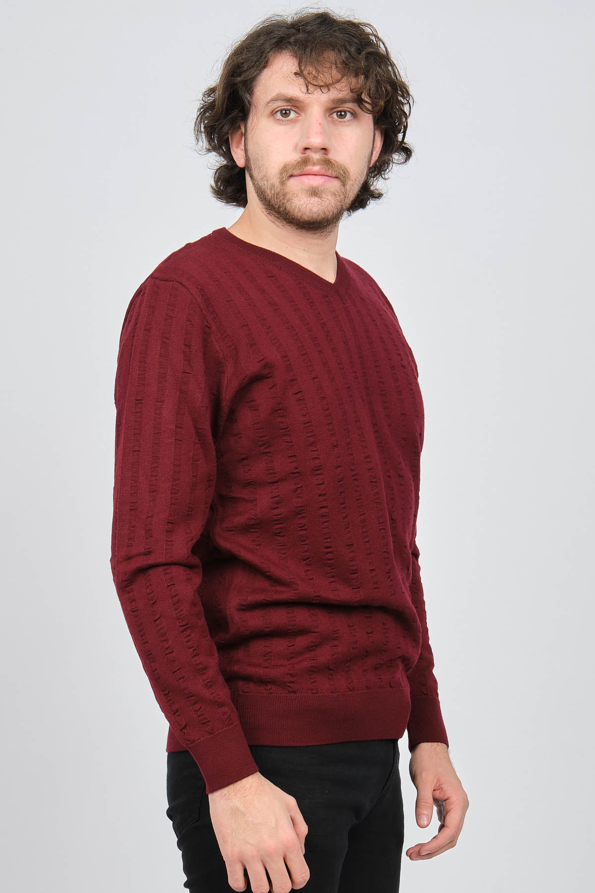 Ürün Tipi: Kazak;Materyal Bilgisi : %50 Yün, %50 Akrilik;Kalıp Bilgisi: Standart;Detay: V yaka, Desenli, Uzun kollu, Yün Kazak;Model Ölçüleri(cm) / Üzerindeki Ürün: Boy - 188, Göğüs - 102, Bel - 90, Kalça - 103, / M Beden