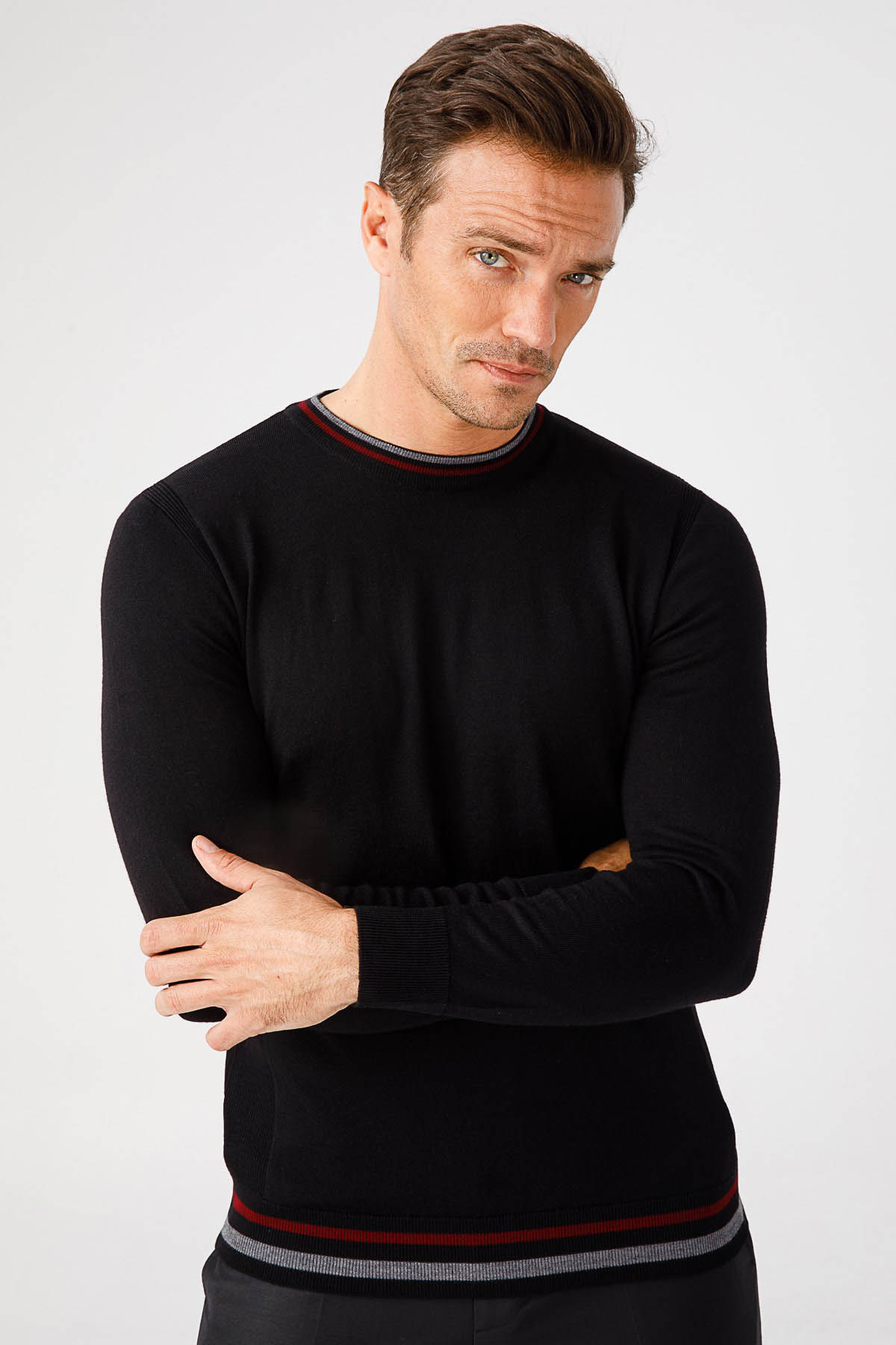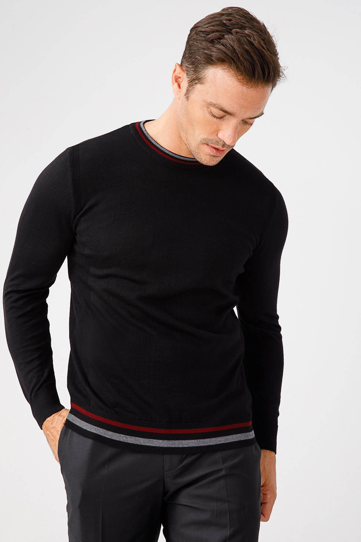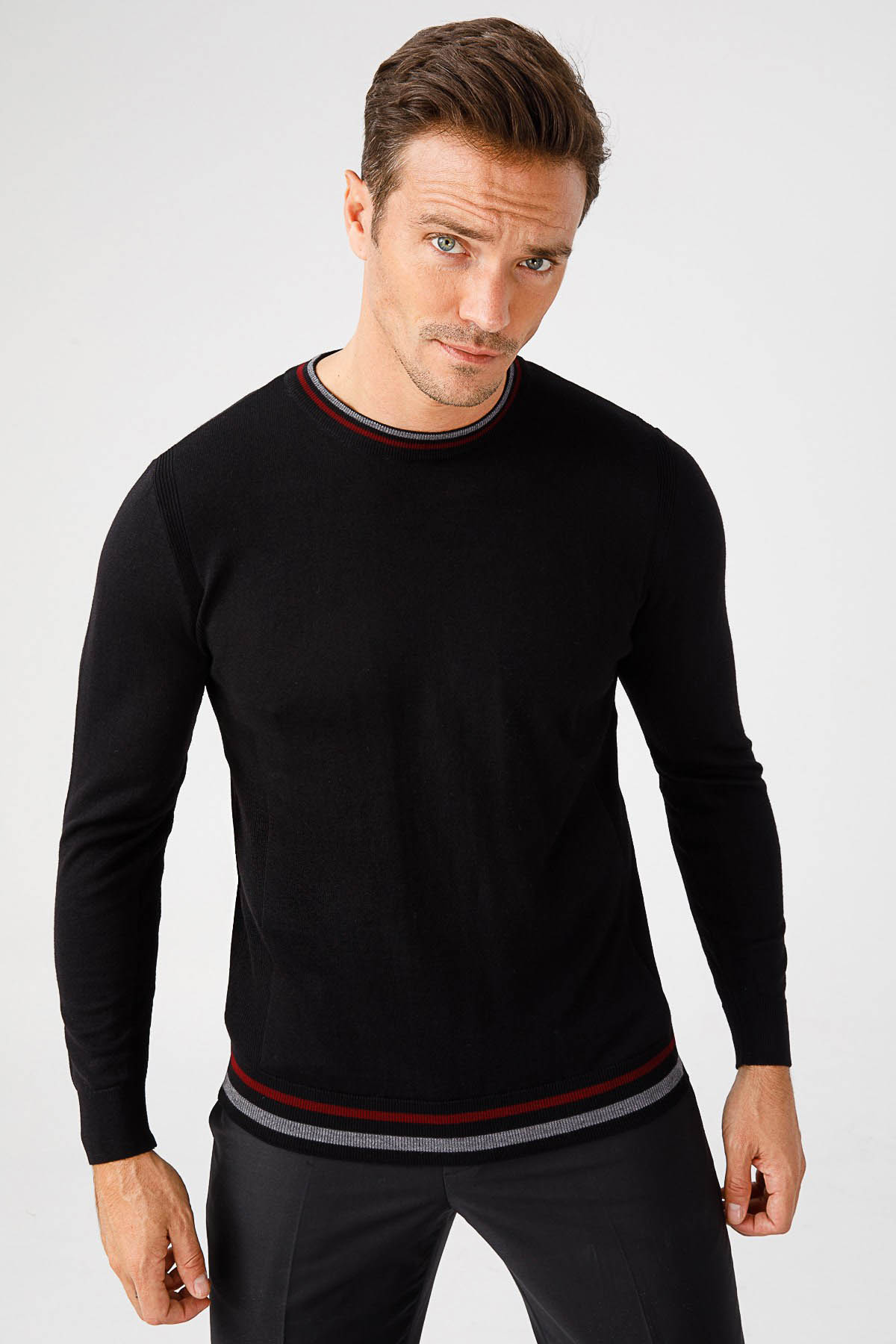 Ürün Tipi: Kazak;Materyal Bilgisi: %50 Yün, %50 Akrilik;Kalıp Bilgisi: Standart;Detay: Bisiklet yaka, yaka kenarı ve etek ucu çizgili, uzun kollu yün kazak;Model Ölçüleri(cm) / Üzerindeki Ürün: Boy - 189, Göğüs - 106, Bel - 85, Kalça - 99, / M Beden