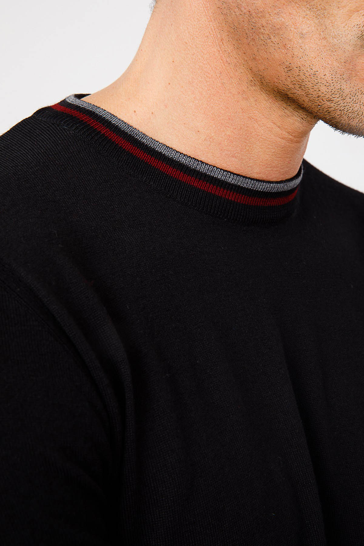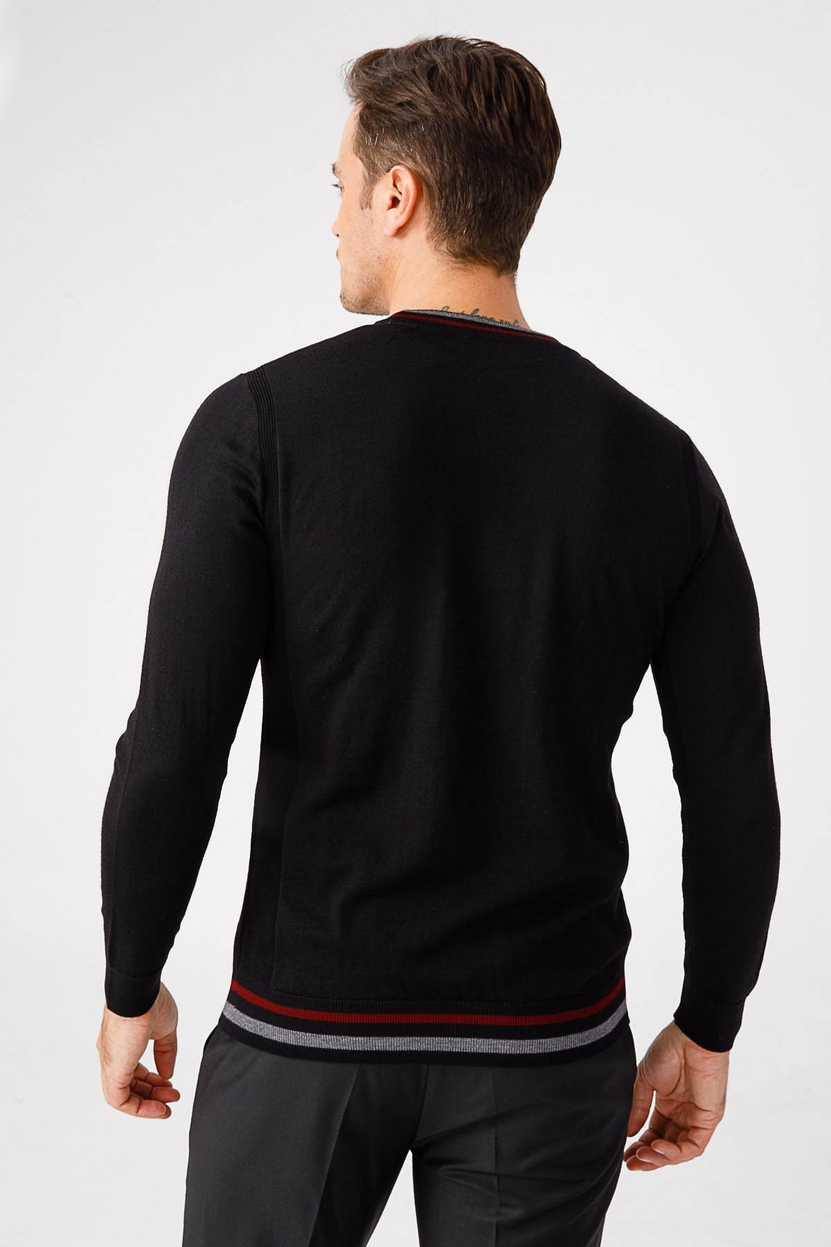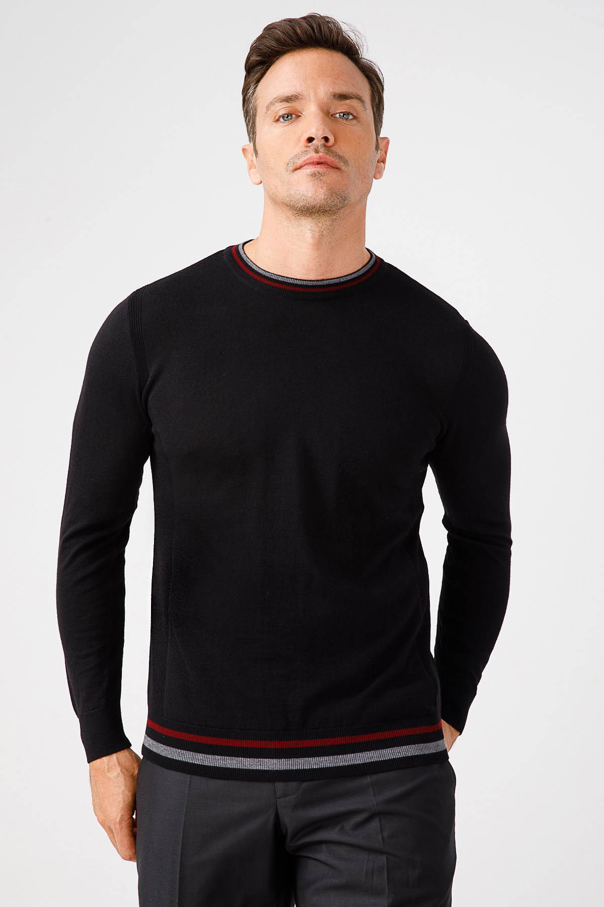 Ürün Tipi: Kazak;Materyal Bilgisi: %50 Yün, %50 Akrilik;Kalıp Bilgisi: Standart;Detay: Bisiklet yaka, yaka kenarı ve etek ucu çizgili, uzun kollu yün kazak;Model Ölçüleri(cm) / Üzerindeki Ürün: Boy - 189, Göğüs - 106, Bel - 85, Kalça - 99, / M Beden