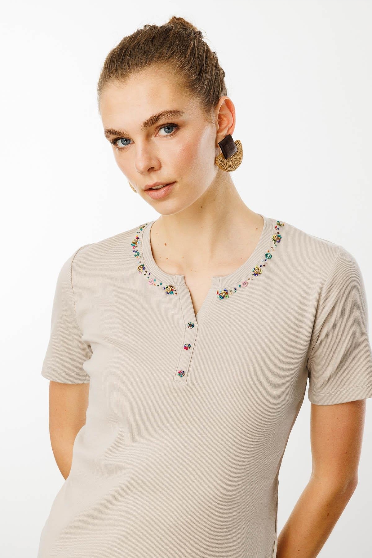 Ürün Tipi: T-Shirt;Kalıp Bilgisi: Standart kalıp;Materyal Bilgisi: 95% Pamuk, 5% Elastan;Menşei : Türkiye (TR);Detay: Açma yaka t-shirt, düz renk tasarımı ve standart kalıbıyla sade bir şıklık sunar. Kısa kollu yapısı ve pamuklu materyali, sıcak günlerde ferahlık ve konfor sağlar. Minimalist detaylarıyla günlük kombinlerin vazgeçilmez bir parçası olabilecek bu t-shirt, hem rahat hem de fonksiyonel bir seçenek olarak öne çıkar;Model Ölçüleri(cm) Boy - 180, Göğüs - 83, Bel – 60, Kalça - 88;Numune Beden: Modelimiz ürünün en küçük bedenini denemiştir.