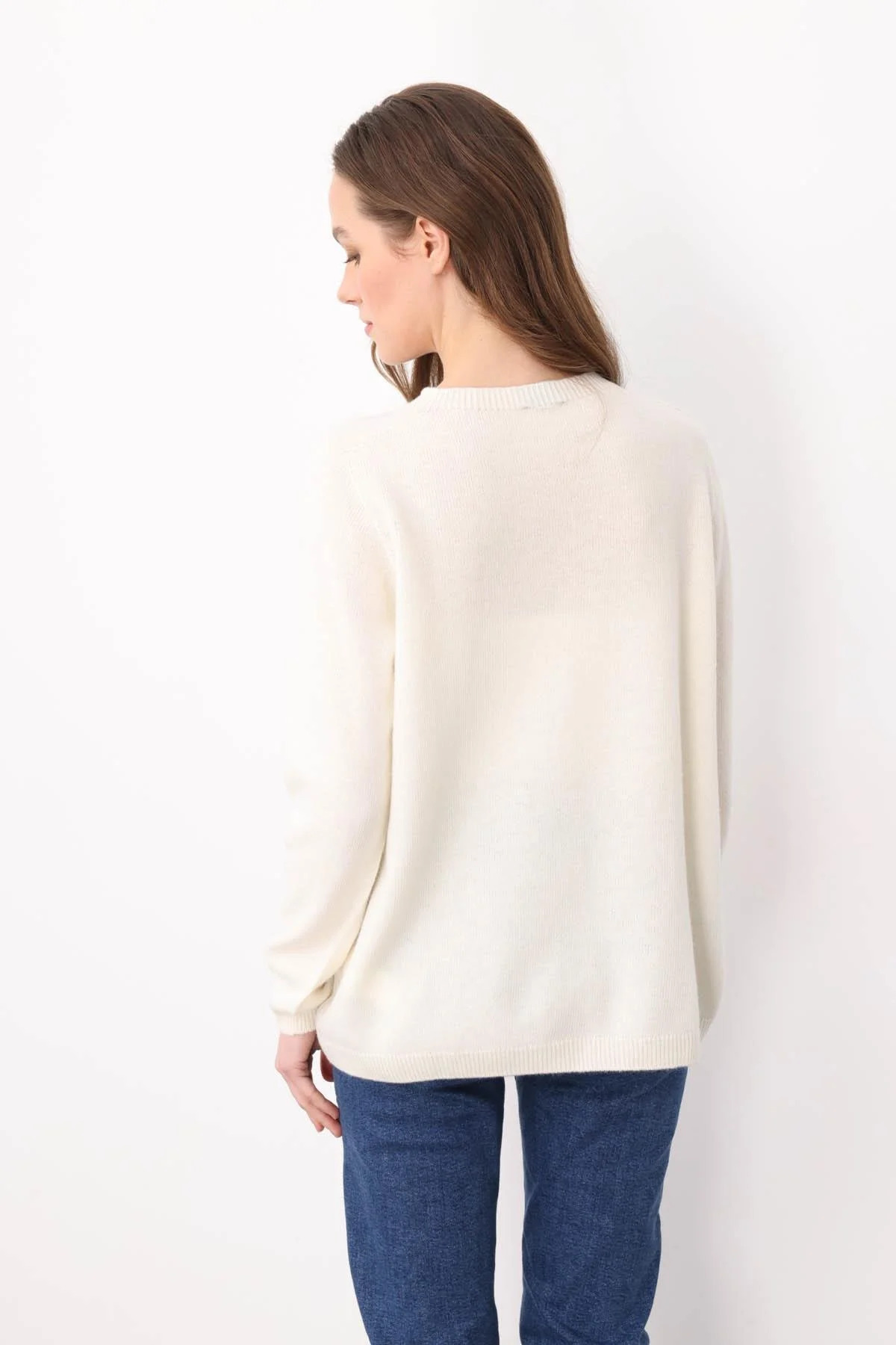 Desen Triko Kadın Sıfır Yaka Klasik Yün Kazak 23163 Kemik