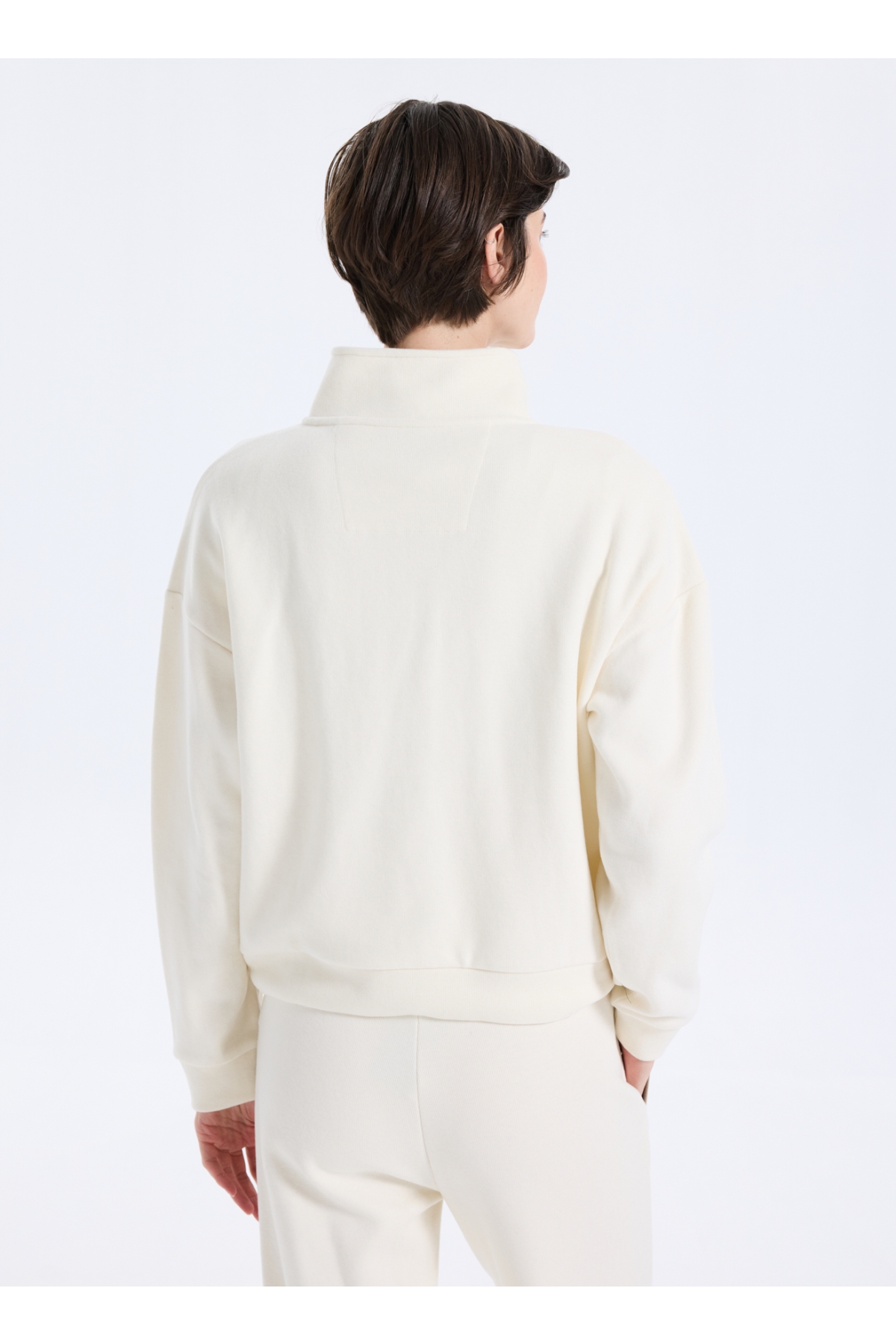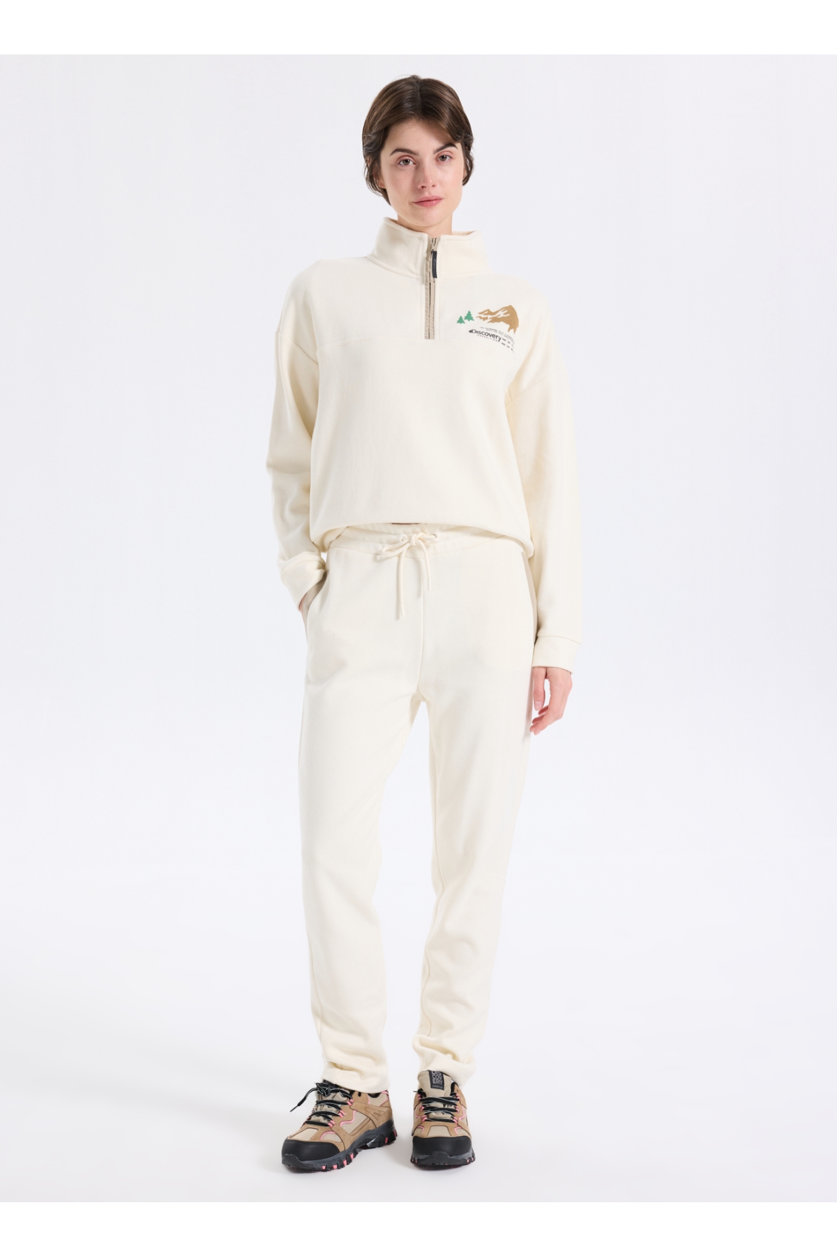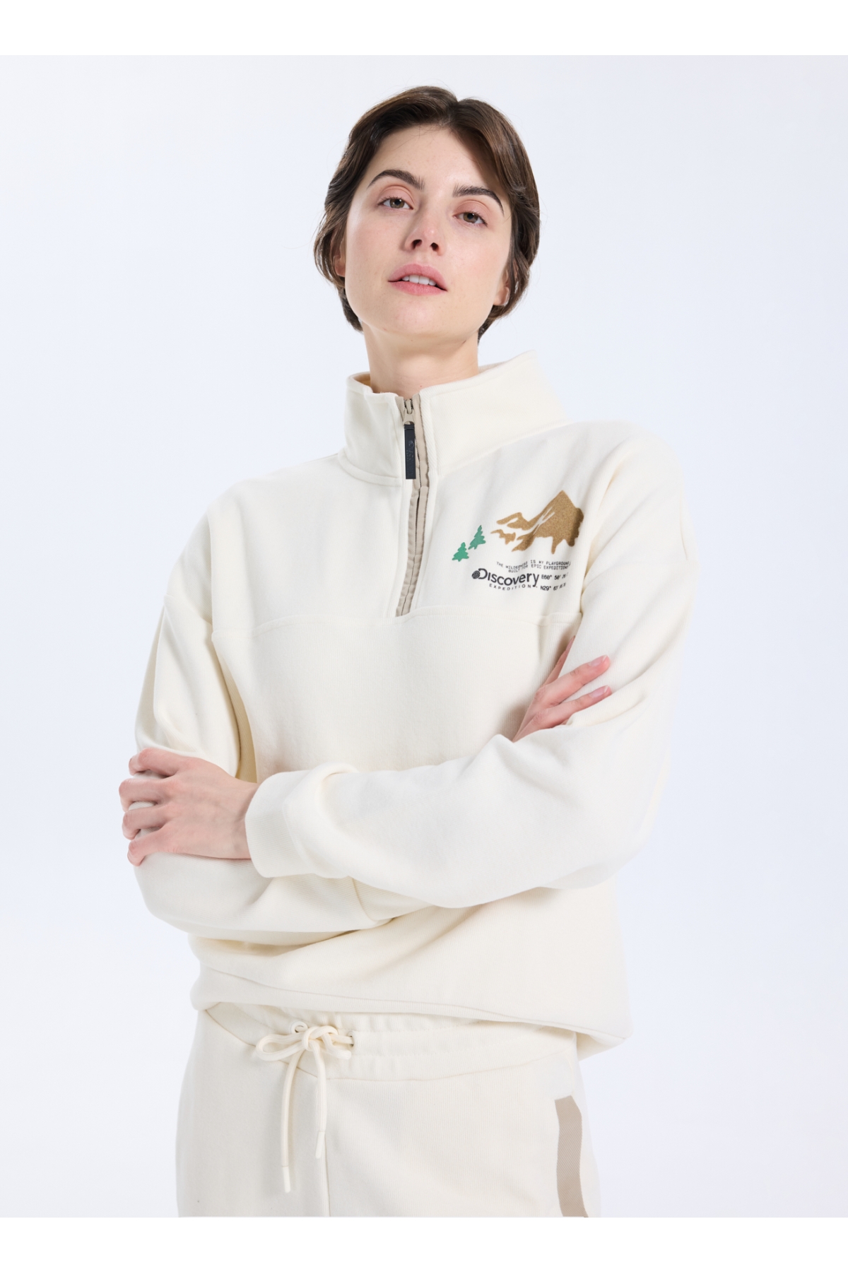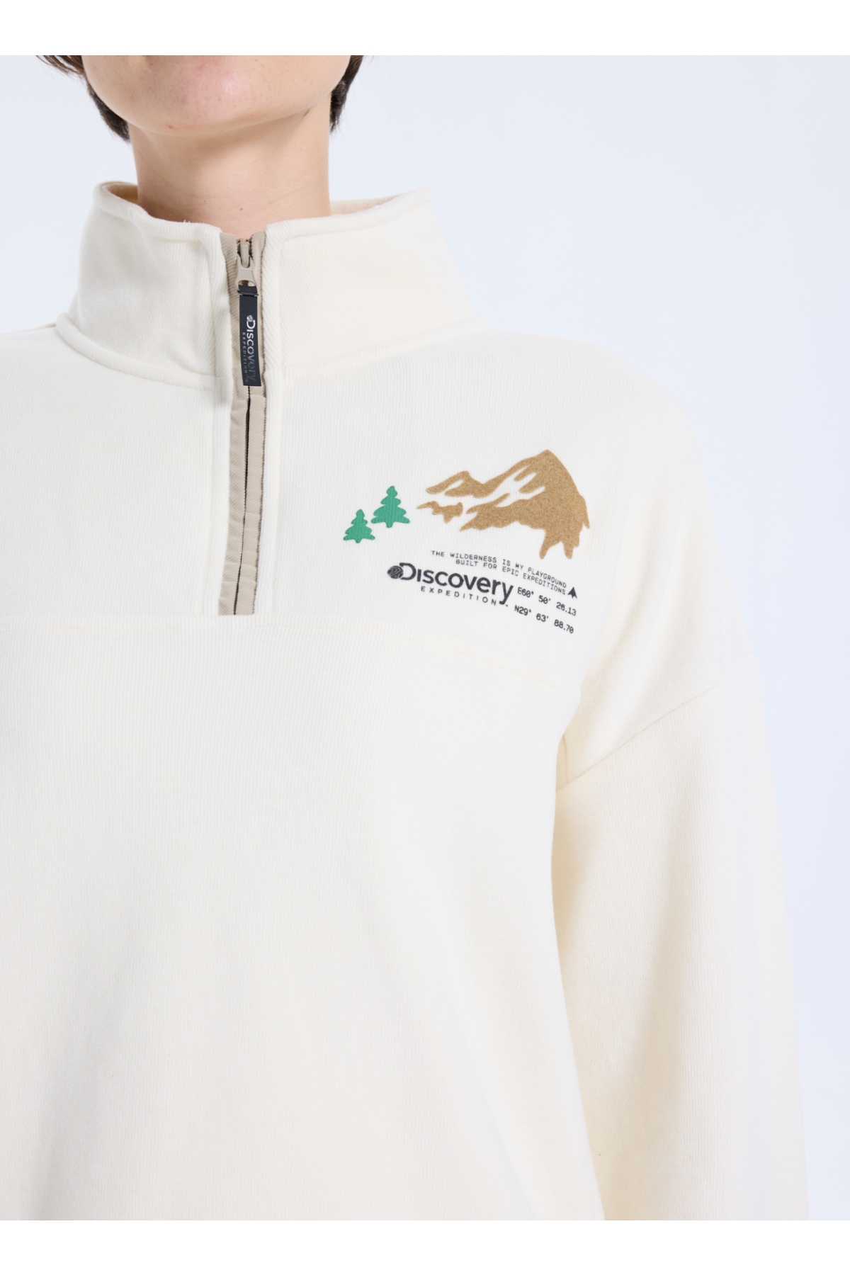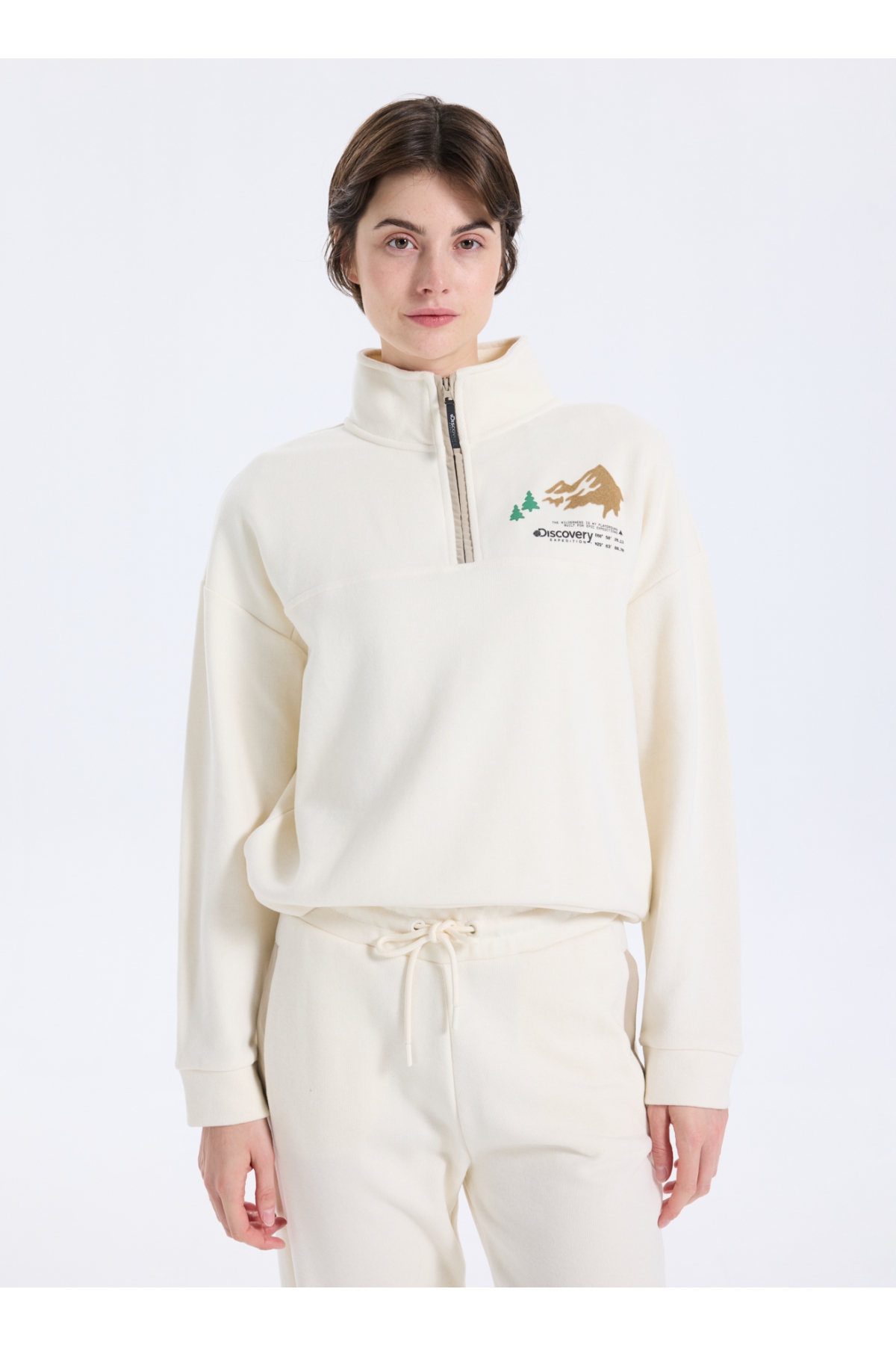 Discovery Expedition D5WL-SWT3595 Krem Dik Yaka Relaxed Baskılı Kadın Sweatshırt