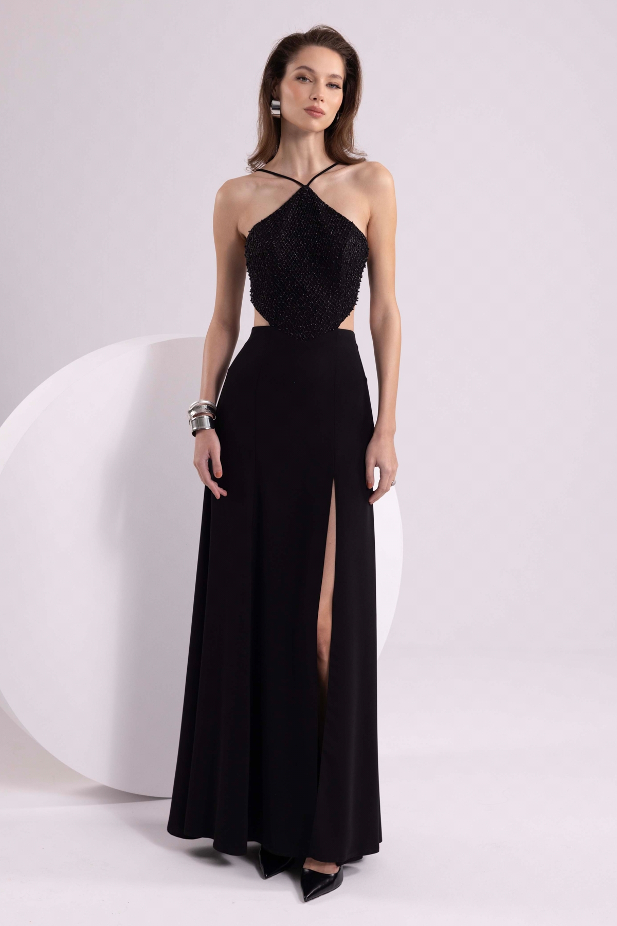 Ürün Tipi: Abiye Elbise;Kalıp Bilgisi: Dar kalıp;Materyal Bilgisi: 100% Polyester;Menşei : Türkiye (TR);Detay: Üst kısmı tamamen taş işlemeli, alt kısmı krep kumaştan tasarlanmış bu maxi abiye elbise; derin yırtmacı, sırttan bağlamalı detayı, astarlı yapısı ve fermuar kapamasıyla göz alıcı bir şıklık sunar. Özel gecelerde zarafeti ve iddiayı bir arada taşımak isteyenler için ideal bir seçimdir;Model Ölçüleri(cm) : Boy - 173, Göğüs - 86, Bel- 68, Kalça –96, Kilo - 56;Numune Beden: Modelimiz ürünün en küçük bedenini denemiştir;