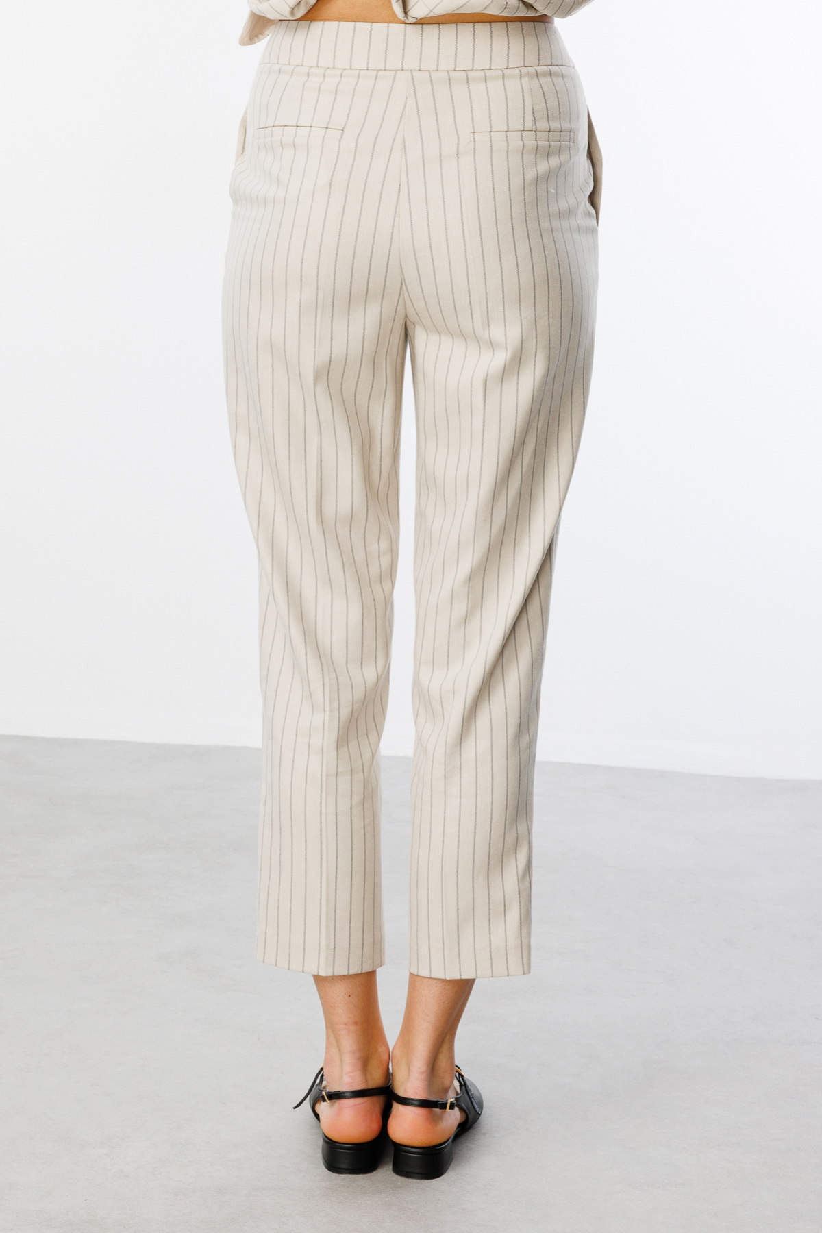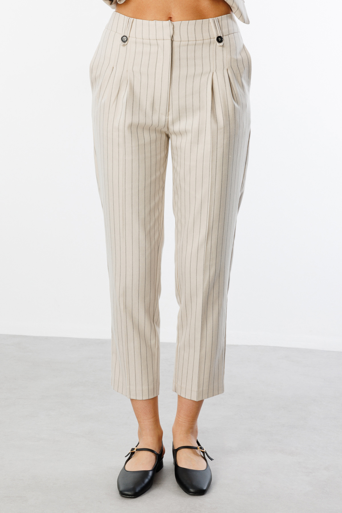 Ürün Tipi: Pantolon;Kalıp Bilgisi: Tam kalıp;Materyal Bilgisi: 47% Polyester, 20% Pamuk, 18% Viskon, 12% Linen, 3% Elastan;Menşei : Türkiye (TR);Detay: Yüksek bel ve dar paça tasarımıyla öne çıkan bu tam kalıp ince pantolon, modern ve şık bir görünüm sunuyor. Çizgili deseni, klasik bir dokunuş sağlarken, köprülü detayları tasarıma özgünlük katıyor. Yandan cepli yapısı sayesinde hem estetik hem de işlevsel bir kullanım sunuyor. Günlük kombinlerden özel davetlere kadar geniş bir kullanım alanına sahip olan bu pantolon, tarzınızı tamamlamak için ideal.Takım Yelek Kodu: 04050;Model Ölçüleri(cm) : Boy - 176, Göğüs - 84, Bel – 61, Kalça - 89;Numune Beden: Modelimiz ürünün en küçük bedenini denemiştir.Ürün Boyu(cm): 95;
