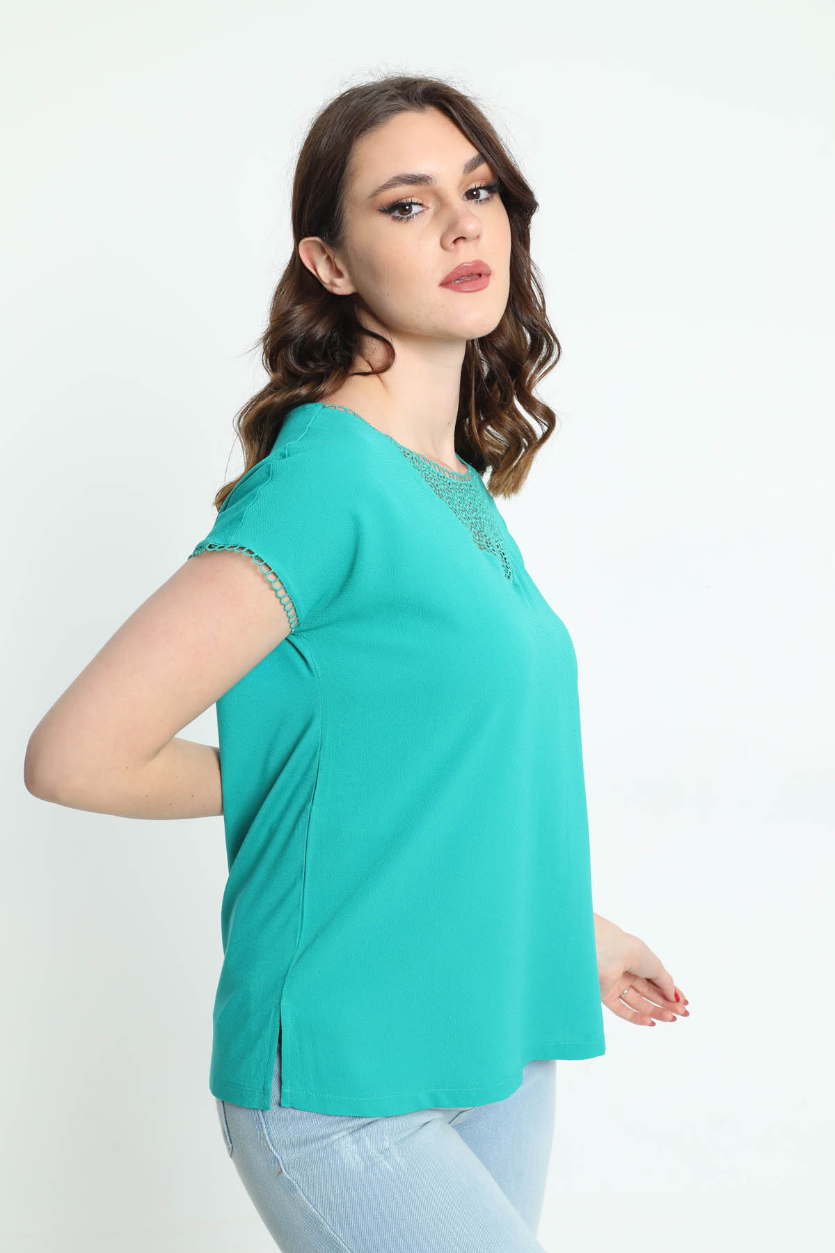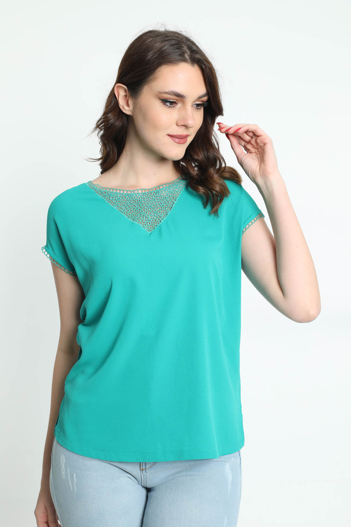 Ürün Tipi: Bluz;Kalıp Bilgisi: Standart; Detay: Yuvarlak yaka, kısa kollu, dantel detaylı bluz; Model Ölçüleri(cm) / Üzerindeki Ürün: Boy - 179, Göğüs - 89, Bel - 65, Kalça - 98 / 1 (M) Beden