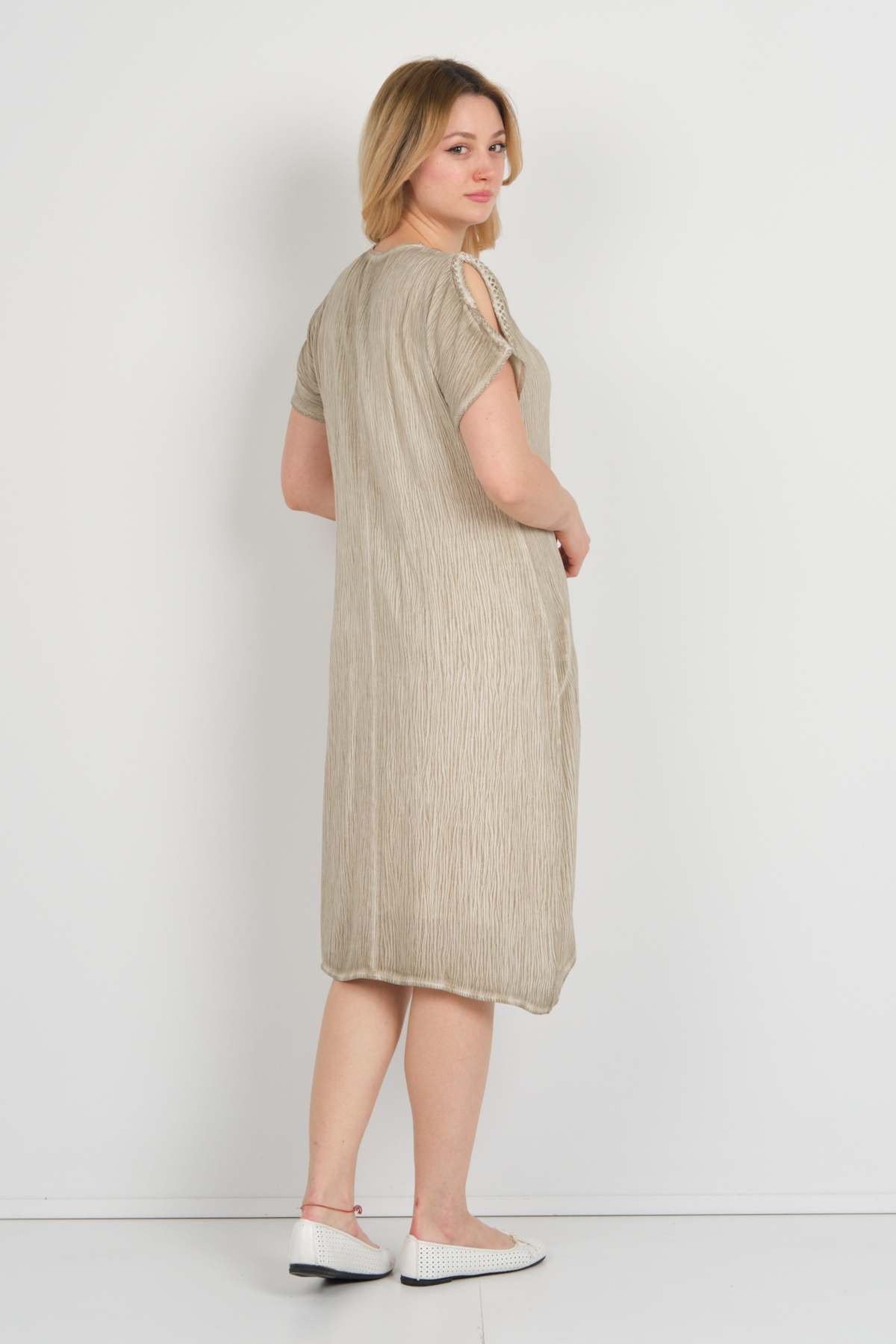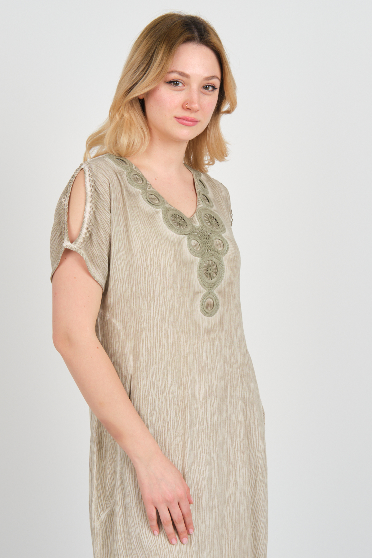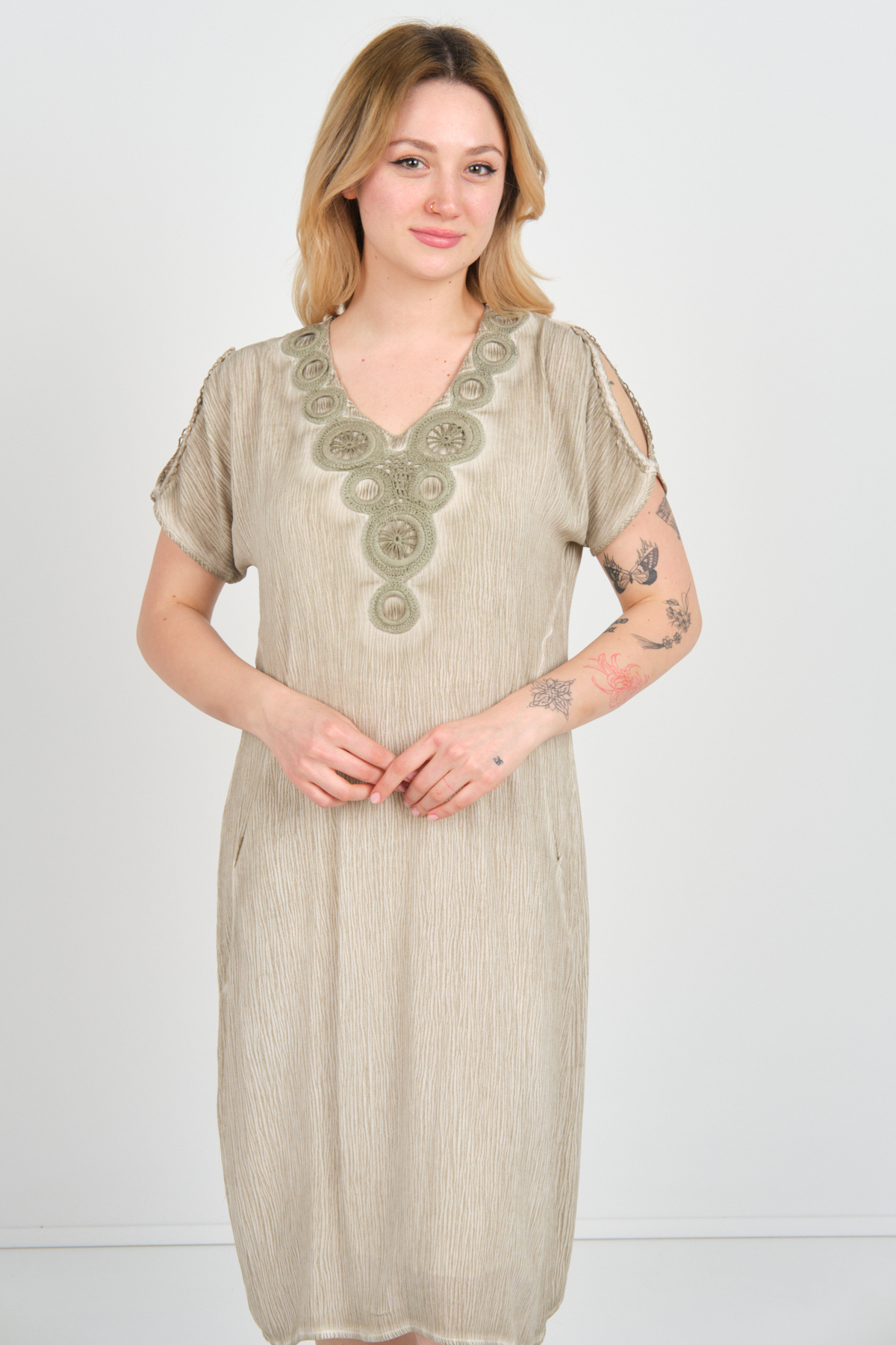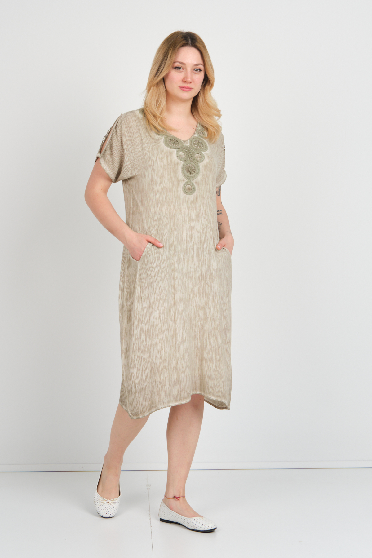 Ürün Tipi: Elbise;Kalıp Bilgisi: Tam kalıp;Materyal Bilgisi: 100% Viskon;Menşei : Türkiye (TR);Detay: Çift cepli tasarımıyla pratiklik sunan, astarsız yapısıyla hafiflik sağlayan, kendinden desenli dokusuyla zarif bir görünüm kazandıran, yakası ve kollarındaki örgü desen detaylarıyla şıklığı tamamlayan, düşük kollu ve omzu açık tasarımıyla modern bir dokunuş sağlayan, V yaka kesimiyle stilinizi öne çıkaran bu elbise, hem günlük kullanımda hem de özel davetlerde tercih edilebilecek ideal bir parçadır. Tarzınıza sofistike bir hava katmak için mükemmel bir seçimdir;Model Ölçüleri(cm) : Boy - 175, Göğüs - 94, Bel - 72, Kalça –99 / Kilo: 64 Kg;Manken Üzerindeki Beden: S beden;Ürün Boyu(cm): 105;