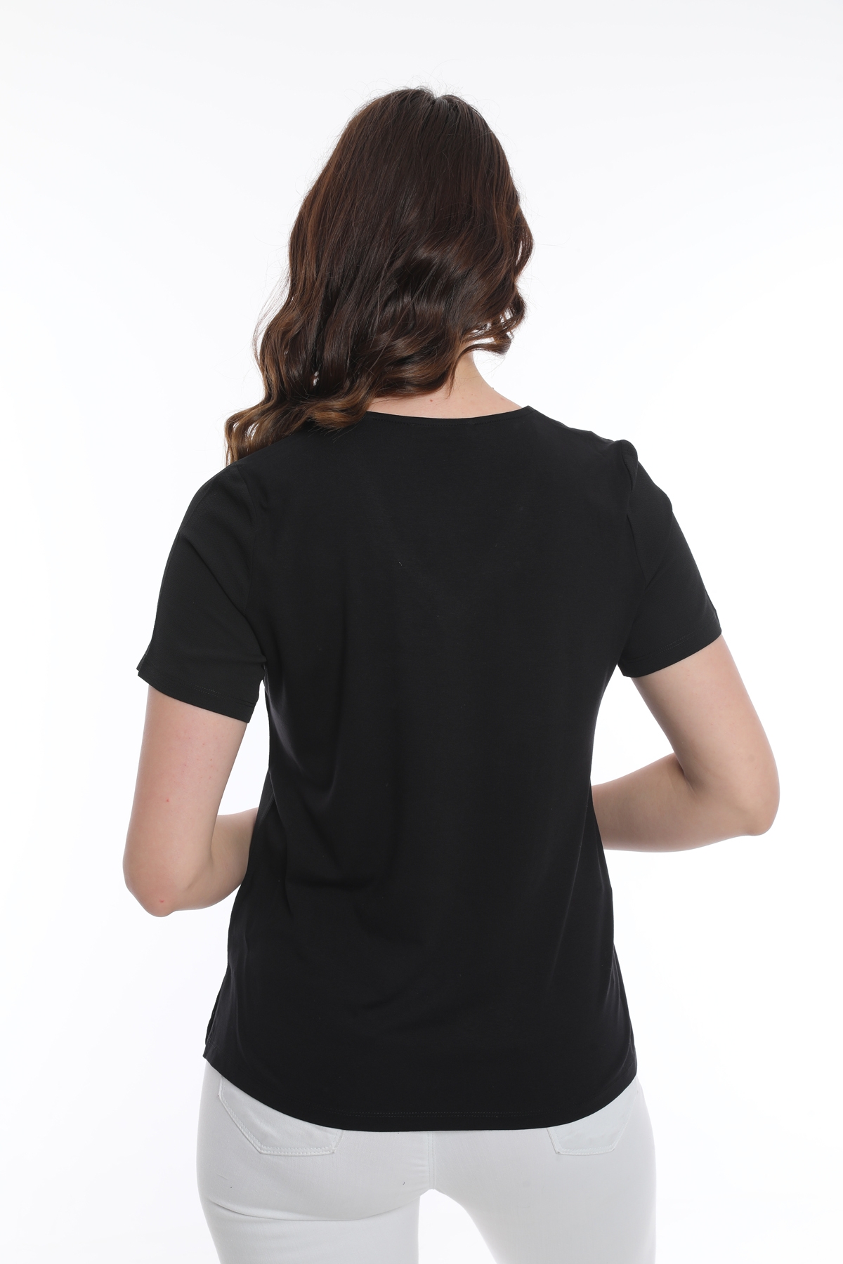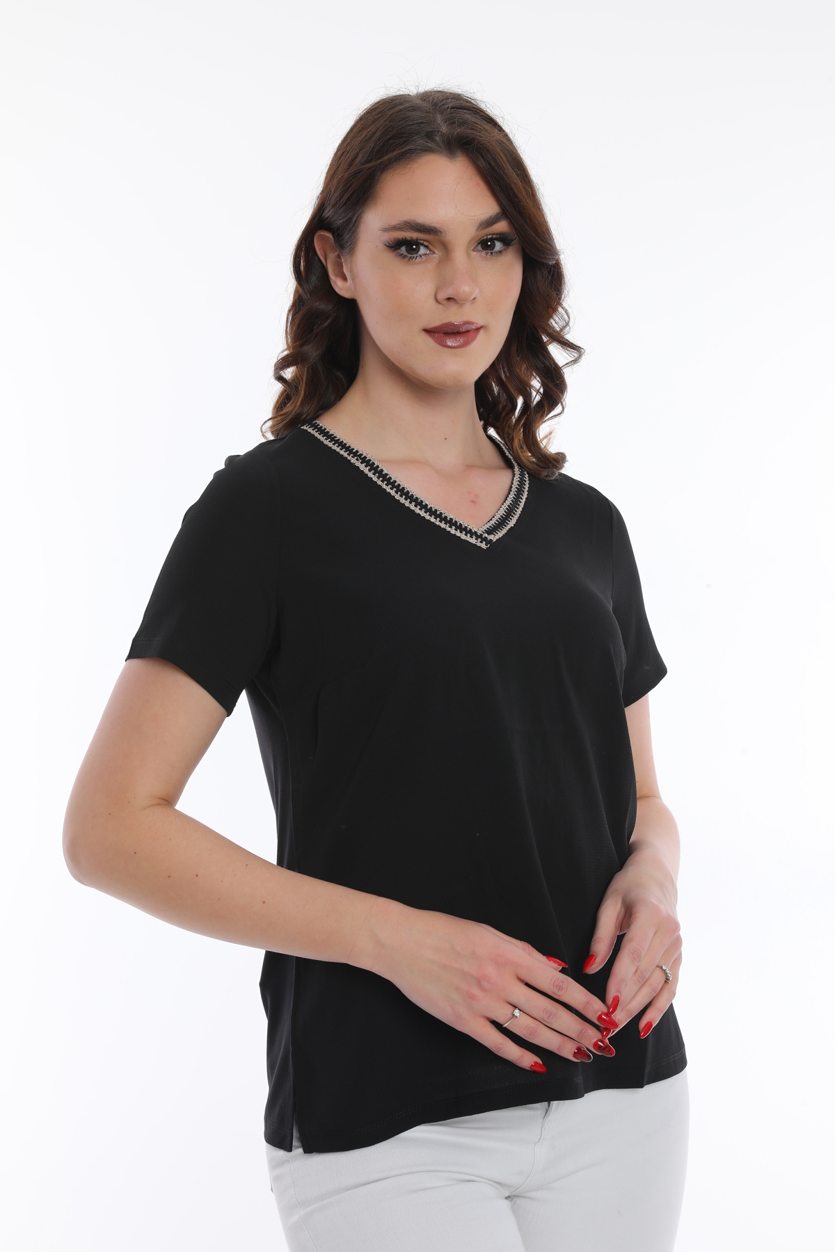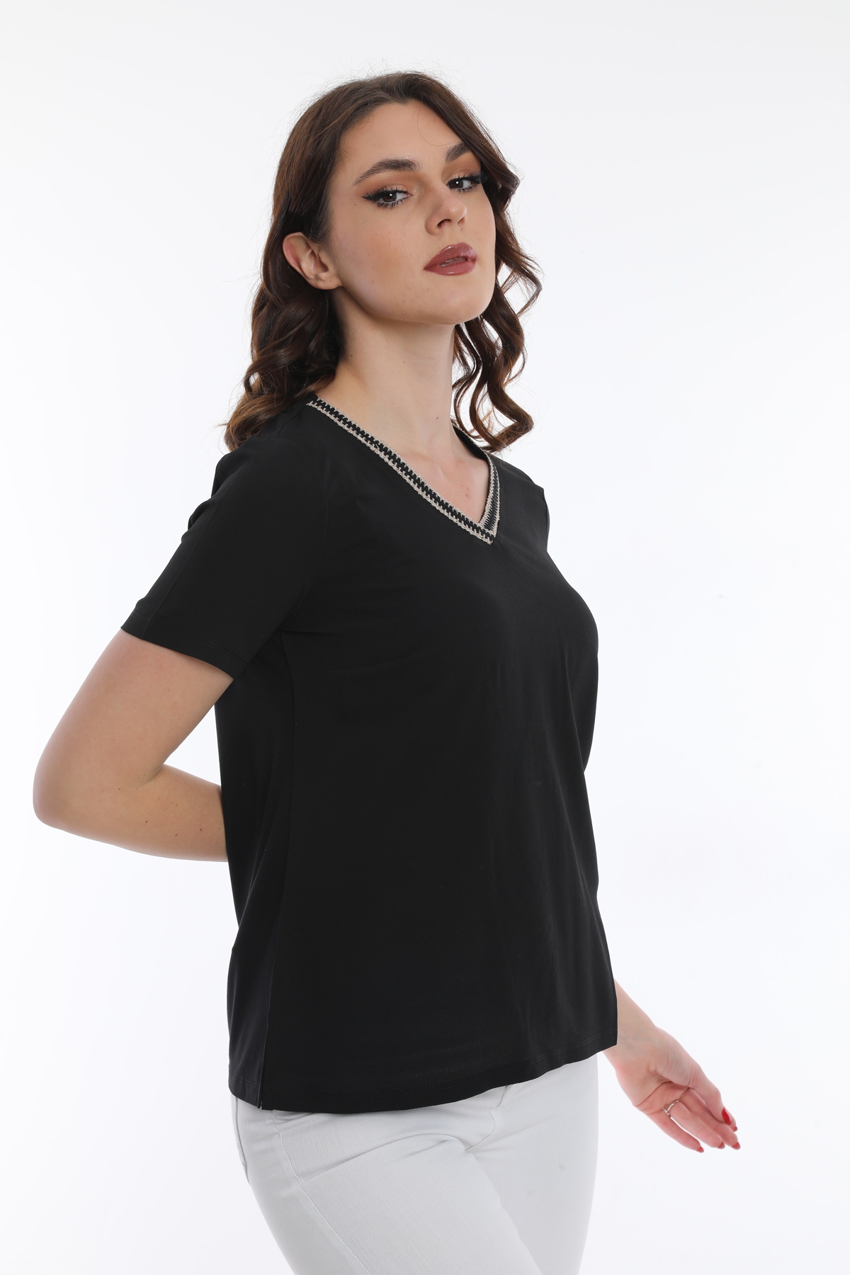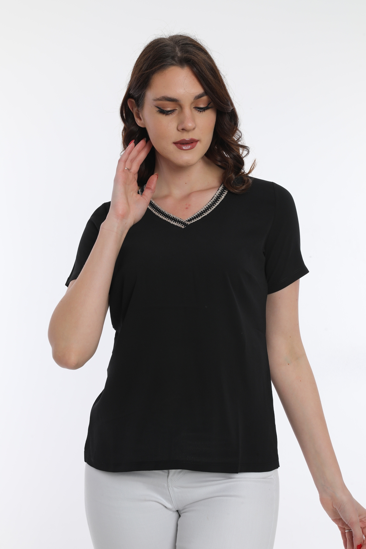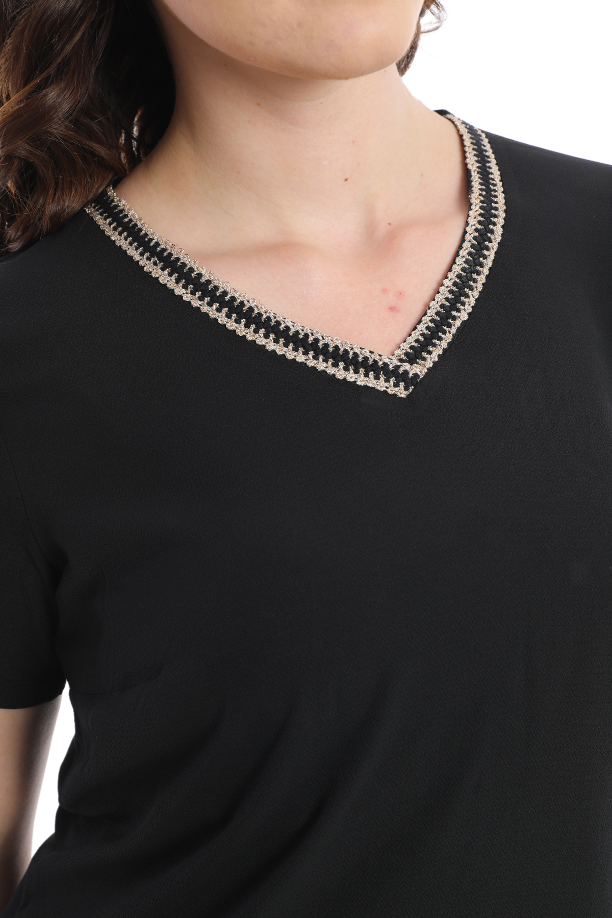Ürün Tipi: Bluz;Kalıp Bilgisi: Standart; Detay: V yaka, kısa kollu, yaka detaylı bluz; Model Ölçüleri(cm) / Üzerindeki Ürün: Boy - 179, Göğüs - 89, Bel - 65, Kalça - 98 / 1 (M) Beden