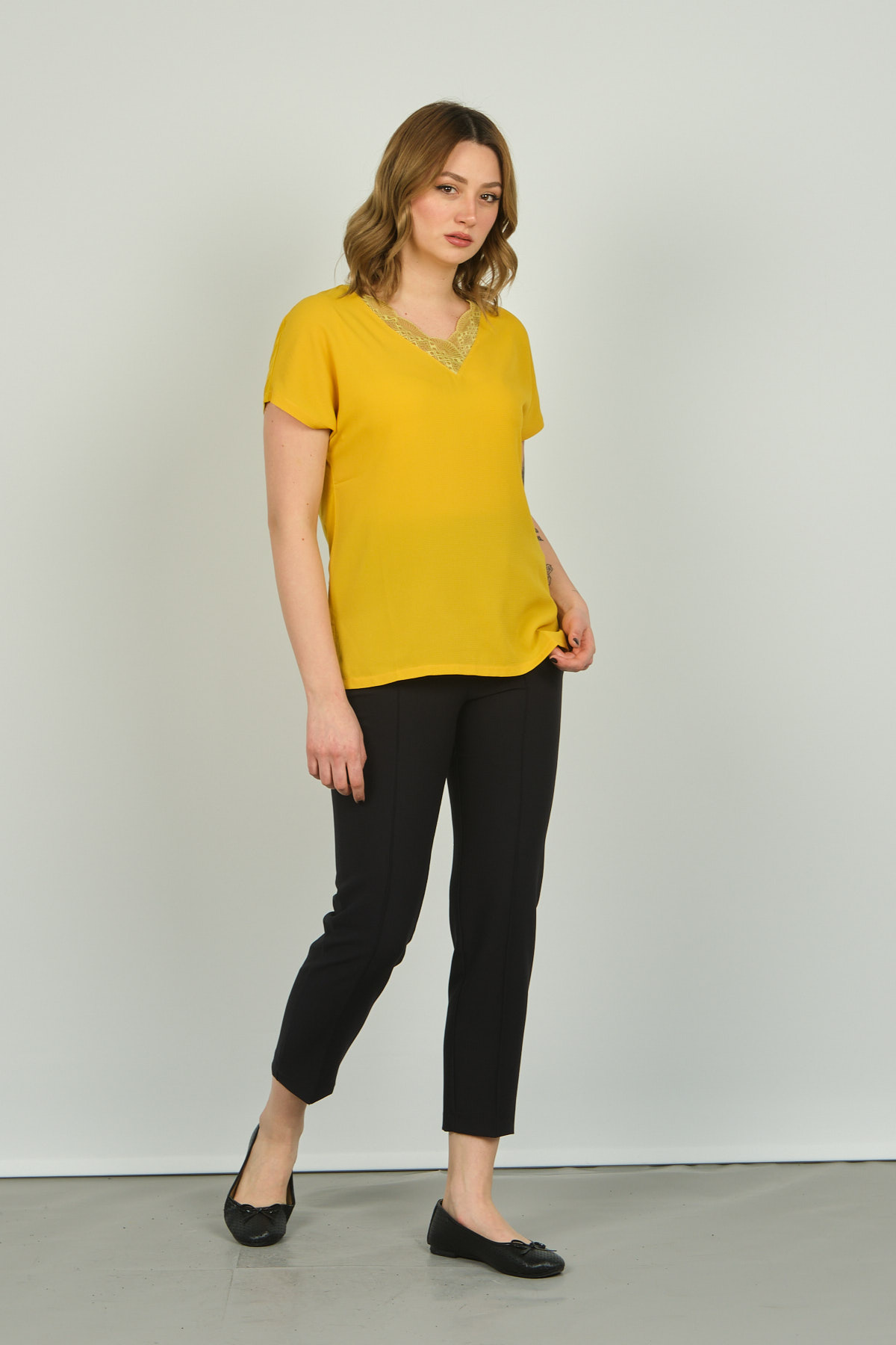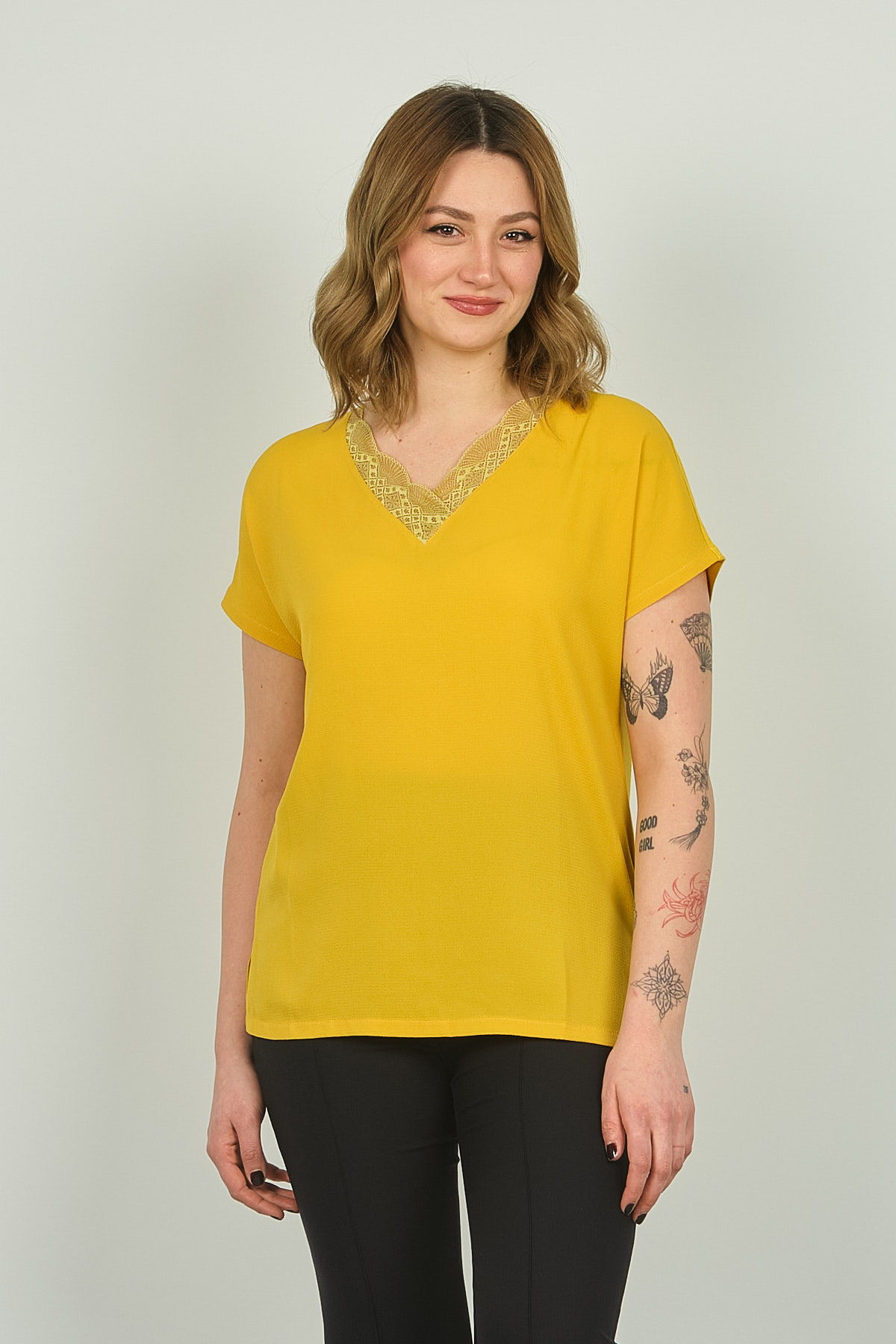 Ürün Tipi: Bluz;Kalıp Bilgisi: Standart; Detay: Dantelli yaka, kısa kollu bluz; Model Ölçüleri(cm) / Üzerindeki Ürün: Boy - 179, Göğüs - 89, Bel - 65, Kalça - 98 / 1 (M) Beden