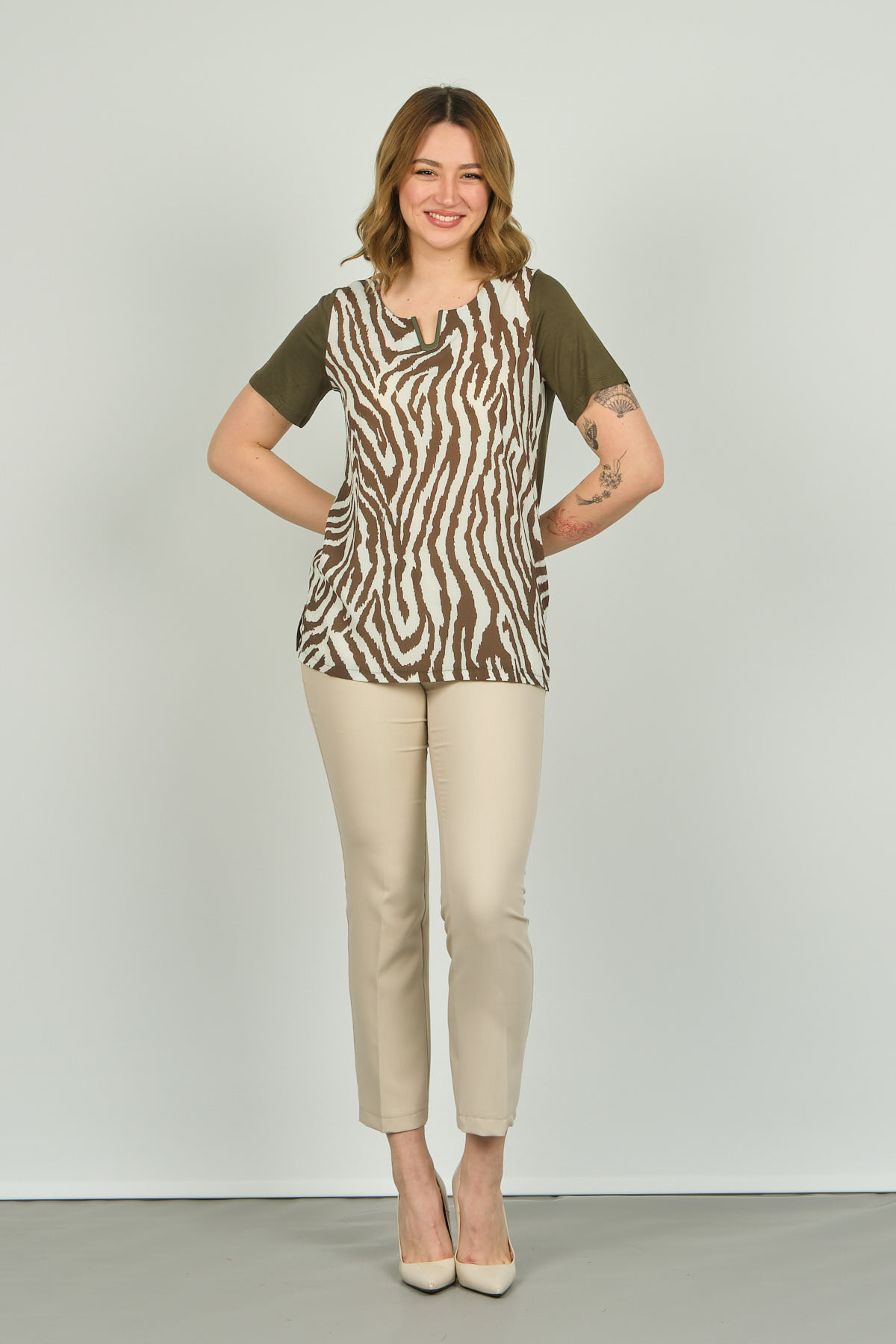 Ürün Tipi: Bluz;Kalıp Bilgisi: Standart;Materyal Bilgisi: %95 Viskon %5 Elastan;Detay: Kısa kol, desenli bluz;Model Ölçüleri(cm) / Üzerindeki Ürün: Boy - 175, Göğüs - 87, Bel – 65, Kalça - 93 / S beden;