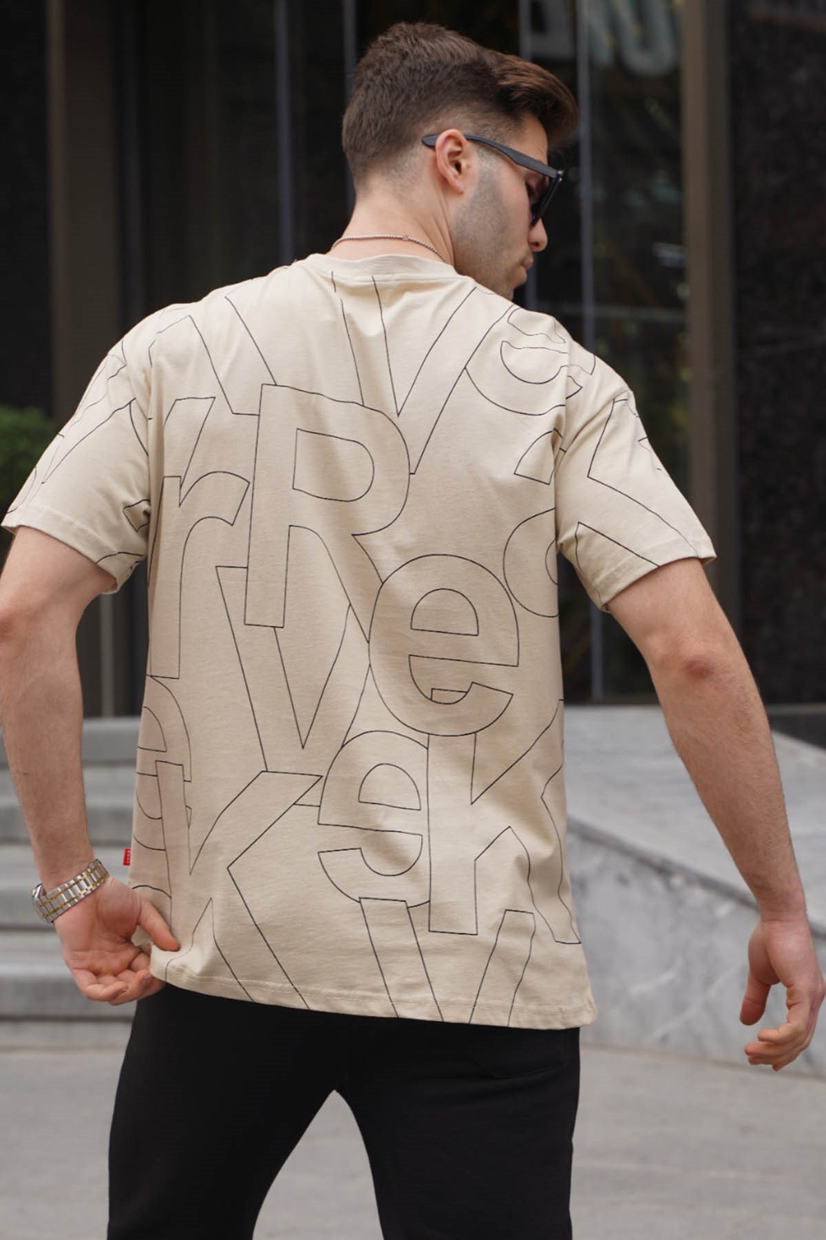 Madmext Erkek Bej Harf Desenli Bisiklet Yaka  Tişört 6061