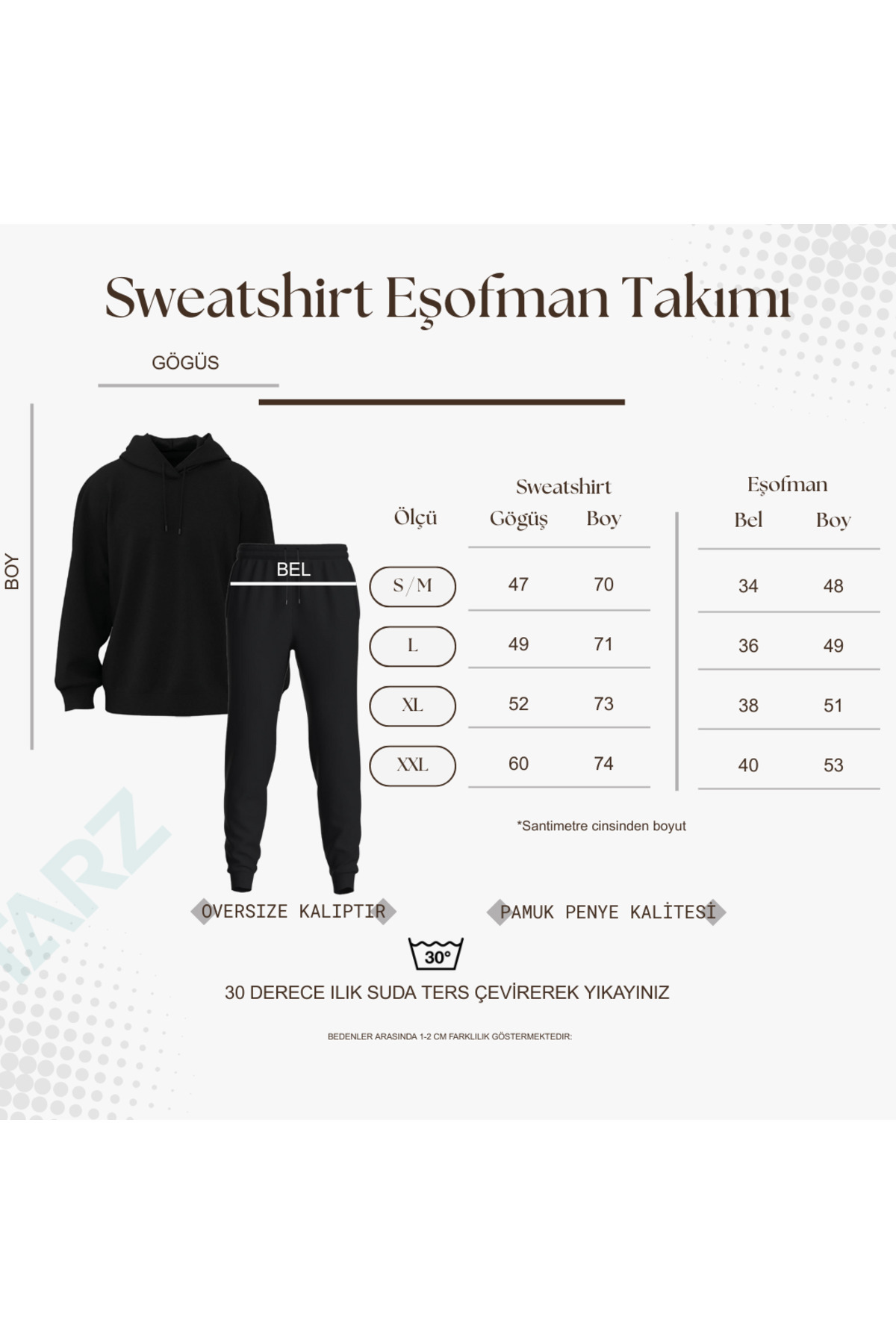 Ürün Özellikleri; Ürünlerimiz %80 pamuk, %20 Polyester üretimdir. Oversize kalıptır. 2 iplik şardonlu kumaş özelliğine sahiptir. Yıkama Önerisi; 30 derece sıcaklıkta ılık suda ve baskılı ürünleri ters çevirerek yıkanması tavsiye edilir. Sweatshirt; | S-M | Göğüs: 47 | Boy:70 | | L | Göğüs: 49 | Boy:71 | | XL | Göğüs: 52 | Boy:73 | | XXL | Göğüs: 55 | Boy:74 | Eşofman Altı; | S-M | Bel: 42 | Boy:97 | | L | Bel: 45 | Boy:99 | | XL | Bel: 49 | Boy:100 | | XXL | Bel: 52 | Boy:101 | Not: Ürün fotoğraflarında kullanılan cihazların ekran ayarları ve ışık koşulları nedeniyle renk tonlarında ufak farklılıklar görülebilir.