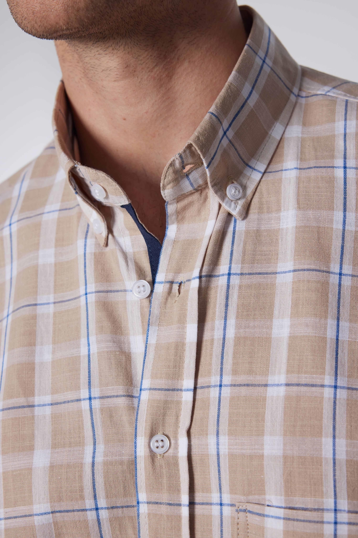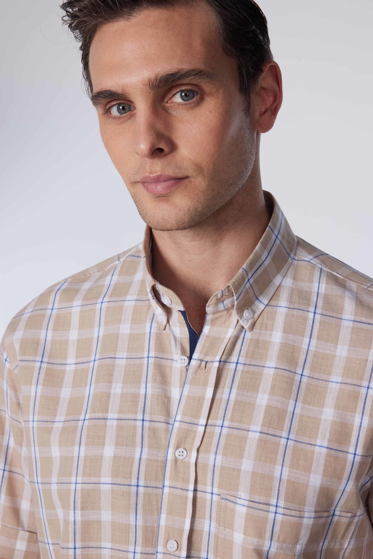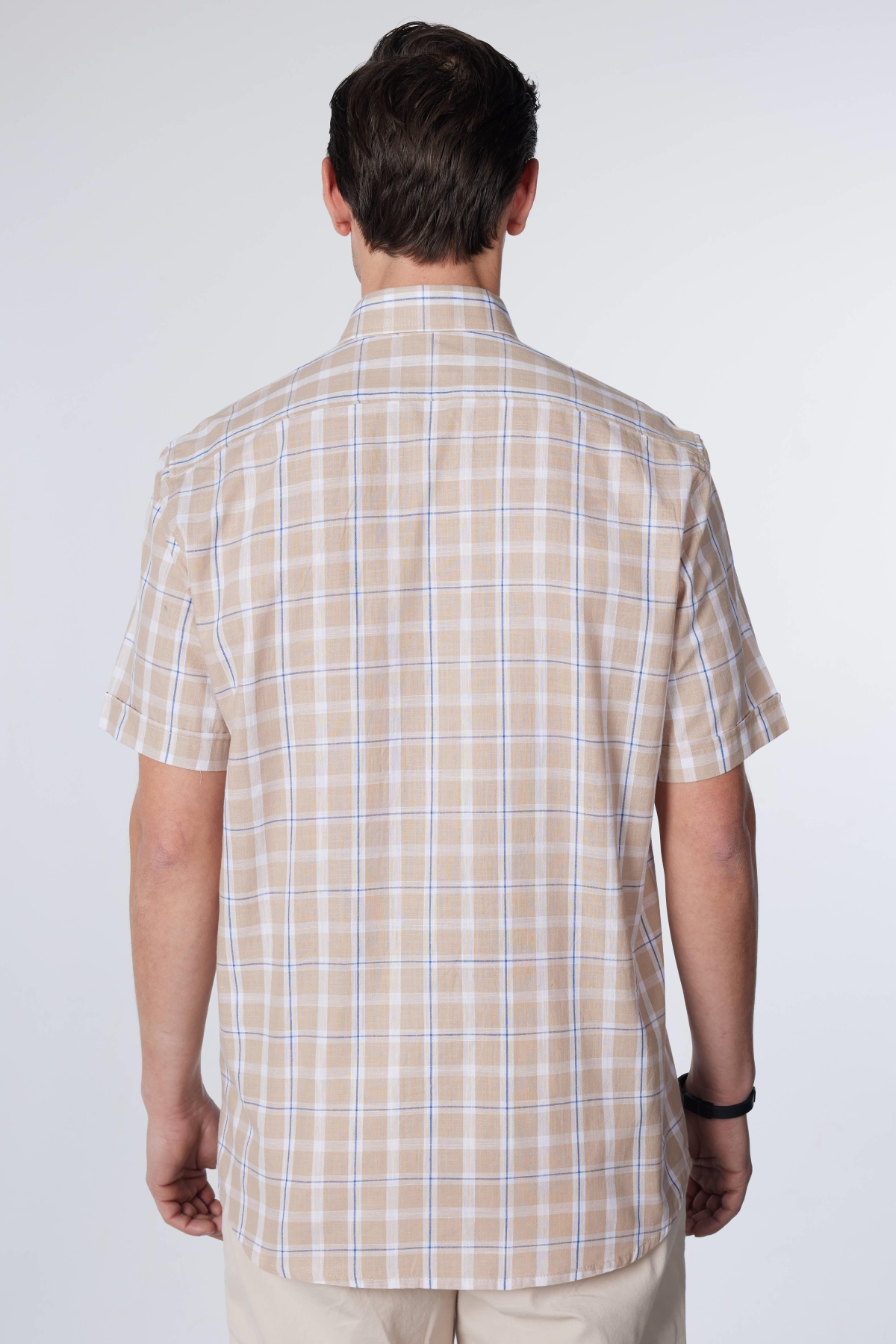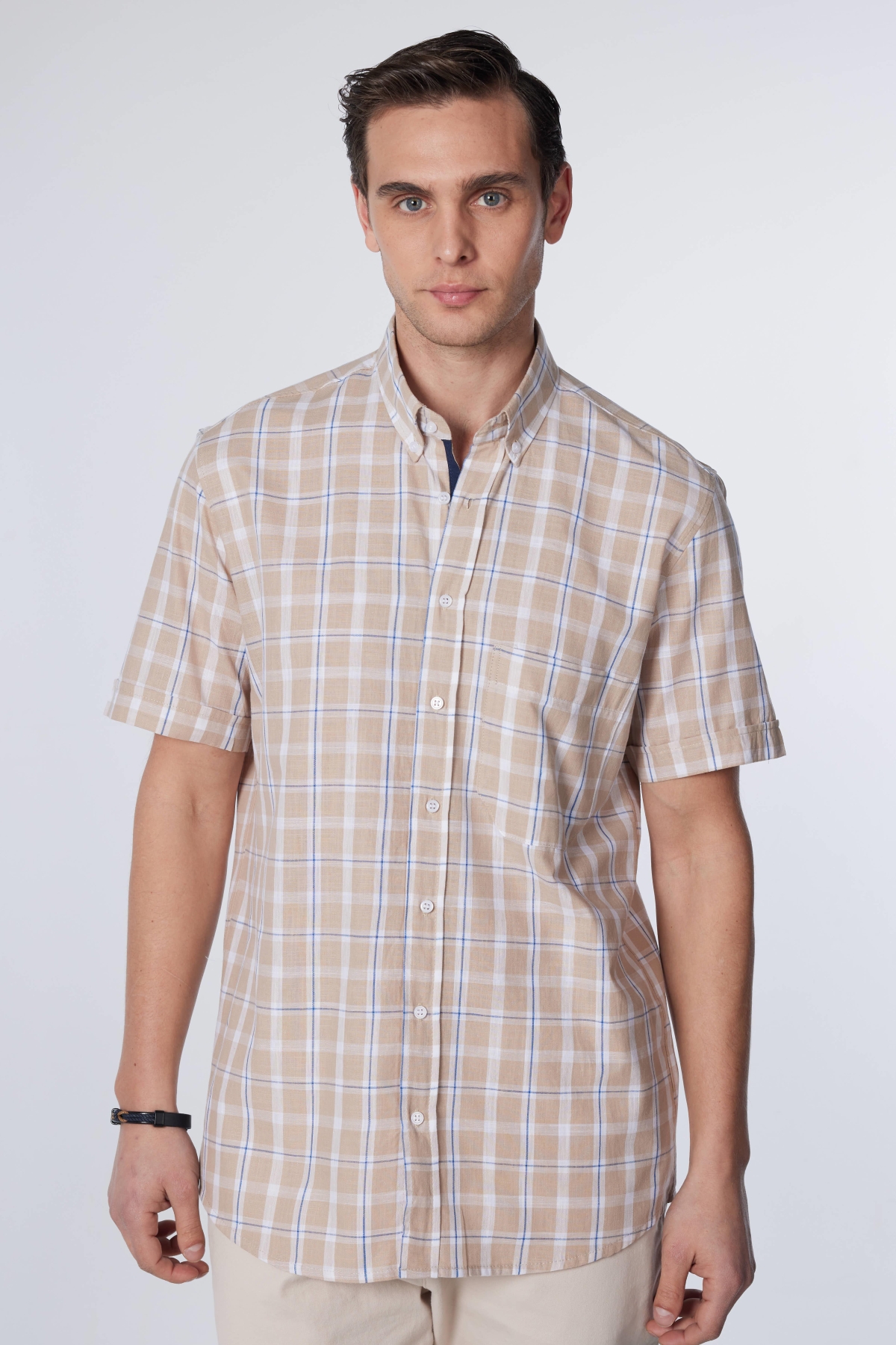 Tudors Erkek Klasik Fit Normal Kesim Kısa Kollu %100 Pamuk Keten Doku Tek Cepli Kareli Düğmeli Yaka Gömlek