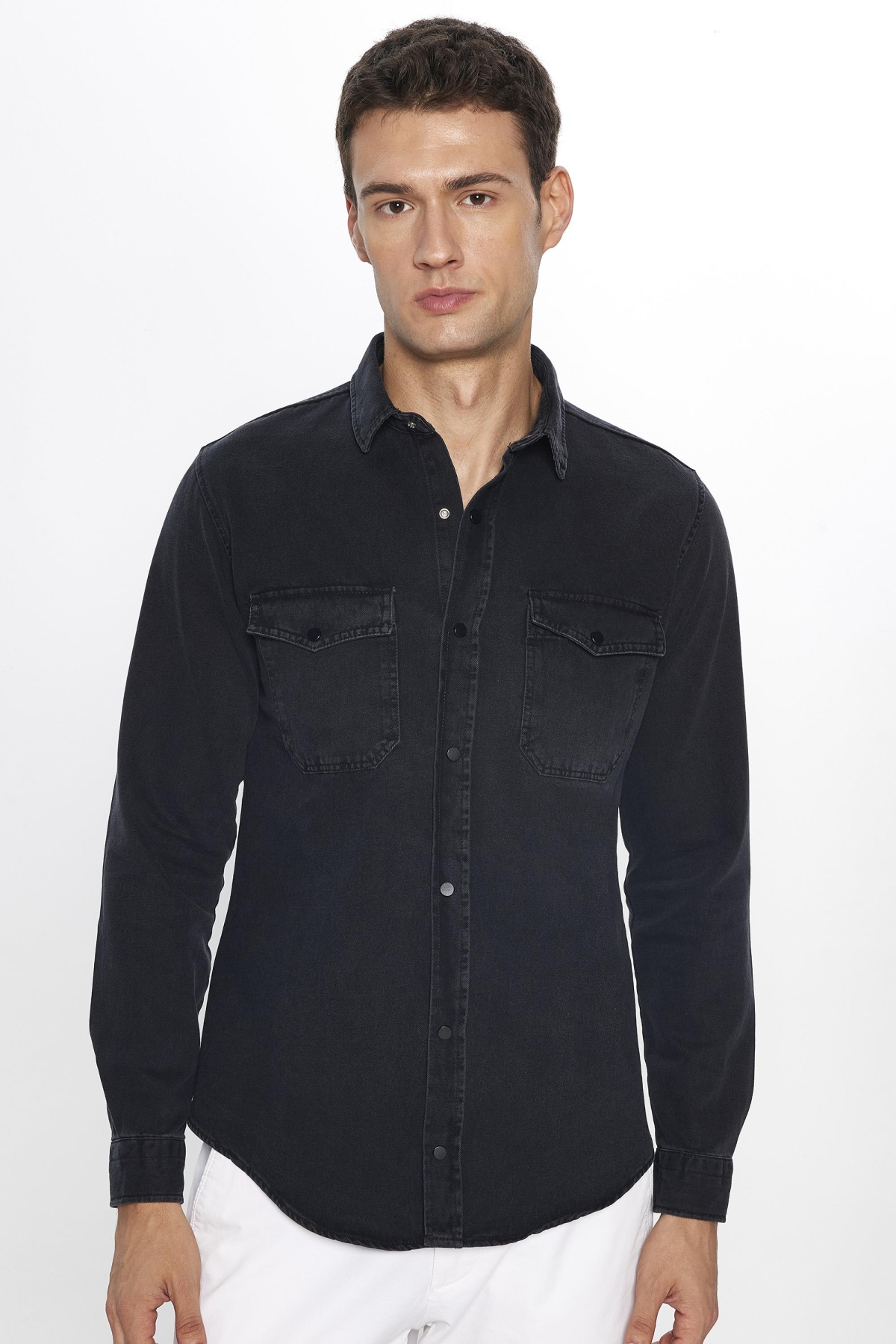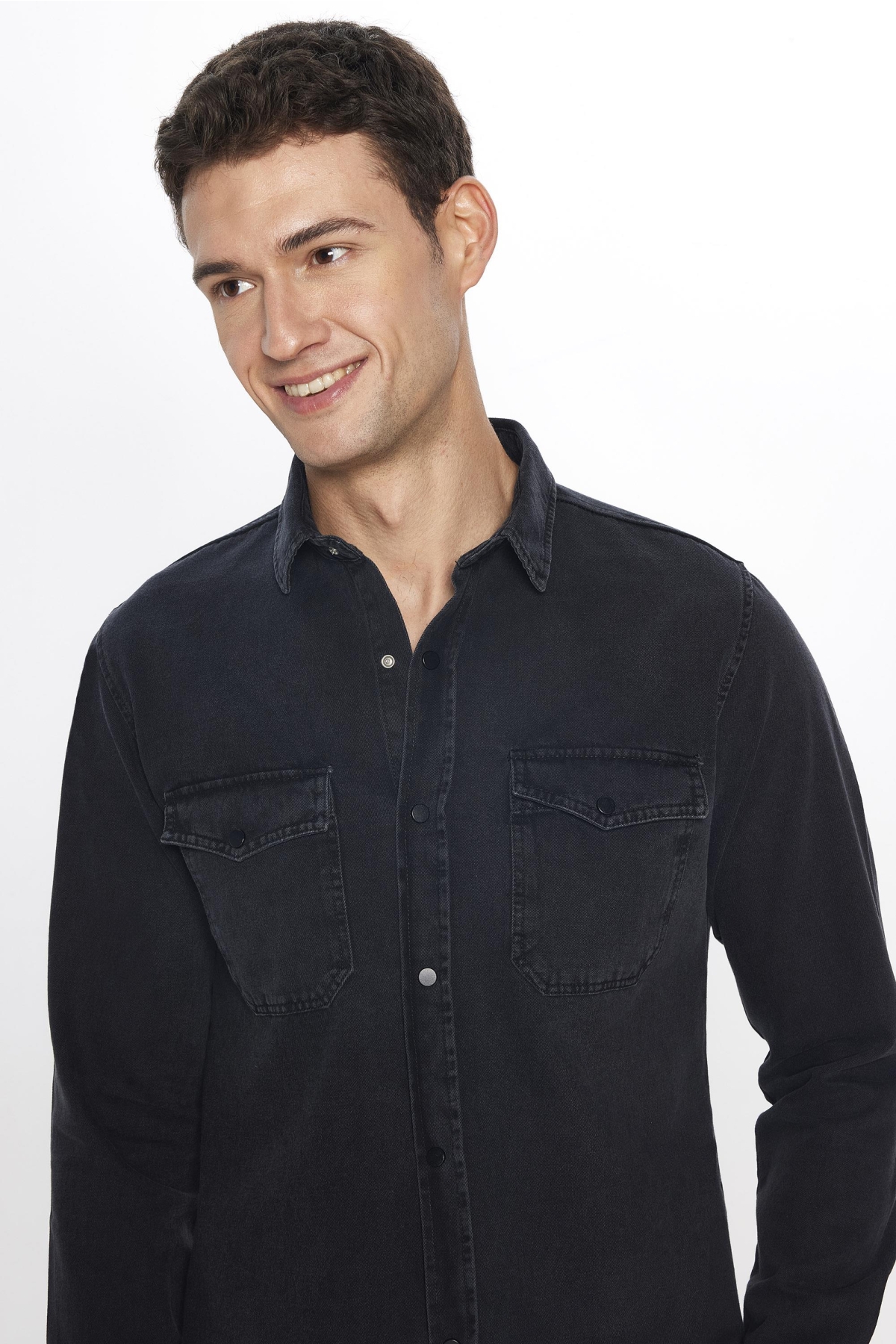 AnasayfaGiyimGömlekGünlük gömlekErkek slim fit dar kesim uzun kollu denim çift cep çıtçıtlı siyah gömlek