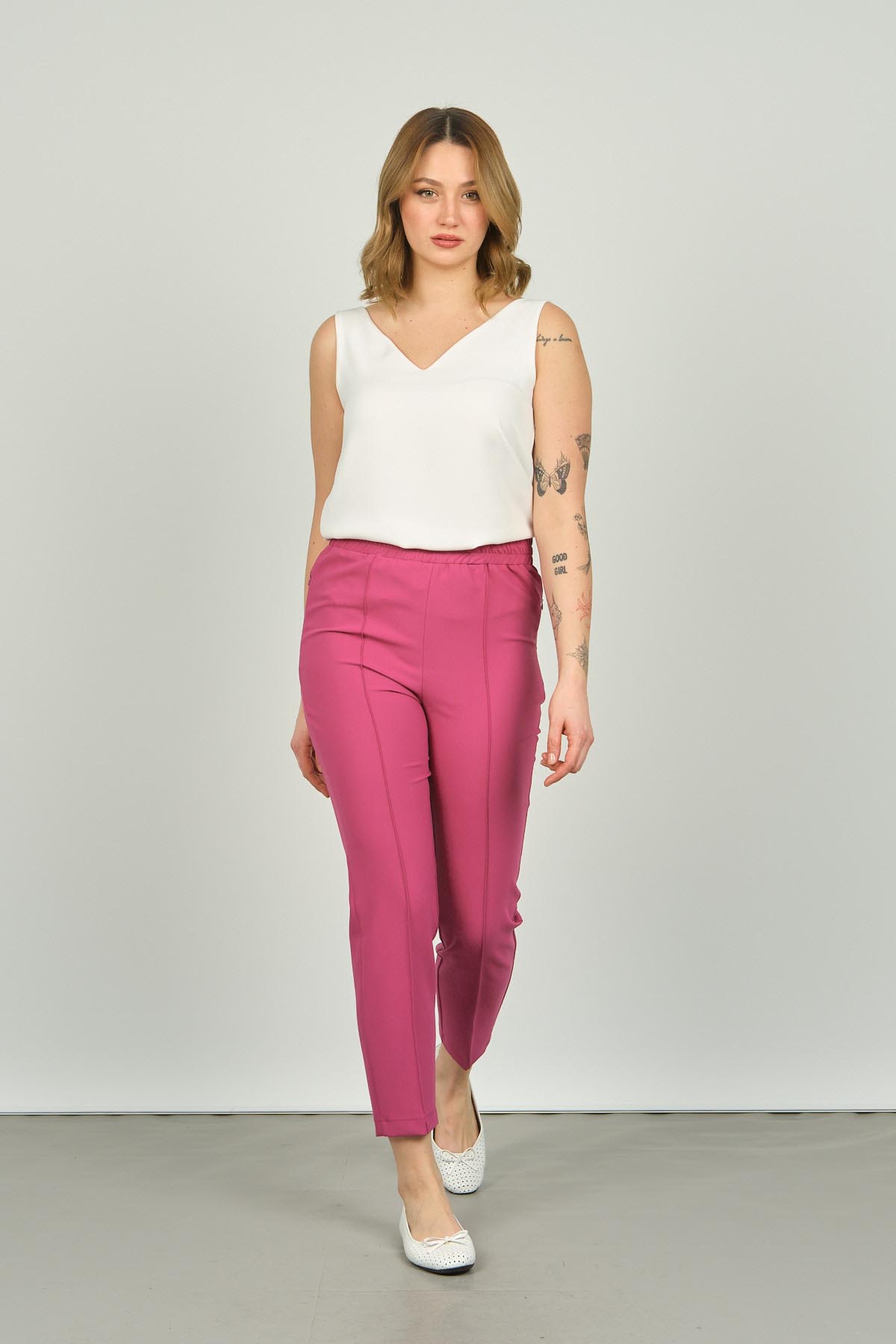 Ürün Tipi: Pantolon;Kalıp Bilgisi: Dar kalıp;Materyal Bilgisi: %90 Polyester %10 Likra;Detay: Ön kısmı dikiş detaylı, bilek boy, beli lastikli, normal bel, yandan fermuarlı pantolon;Model Ölçüleri(cm) / Üzerindeki Ürün: Boy - 175, Göğüs - 87, Bel – 65, Kalça - 93 / 38 beden;