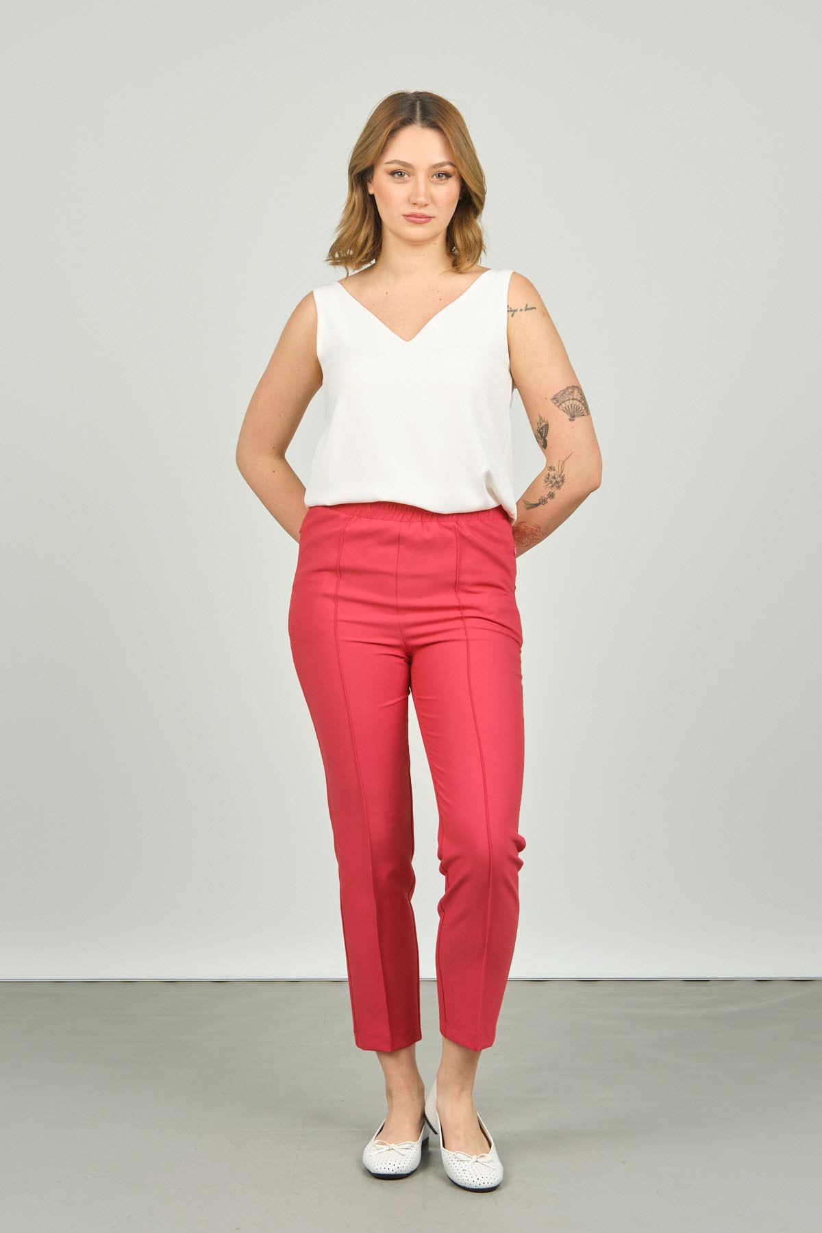 Ürün Tipi: Pantolon;Kalıp Bilgisi: Dar kalıp;Materyal Bilgisi: %90 Polyester %10 Likra;Detay: Ön kısmı dikiş detaylı, bilek boy, beli lastikli, normal bel, yandan fermuarlı pantolon;Model Ölçüleri(cm) / Üzerindeki Ürün: Boy - 175, Göğüs - 87, Bel – 65, Kalça - 93 / 38 beden;