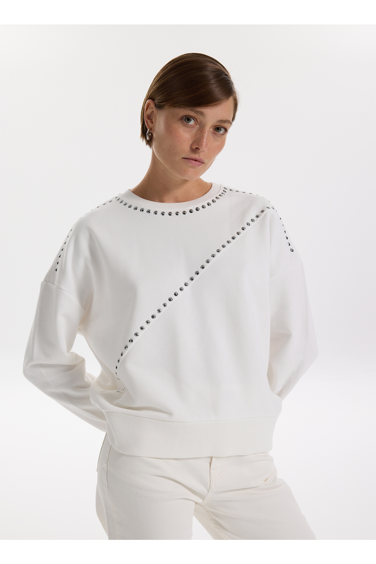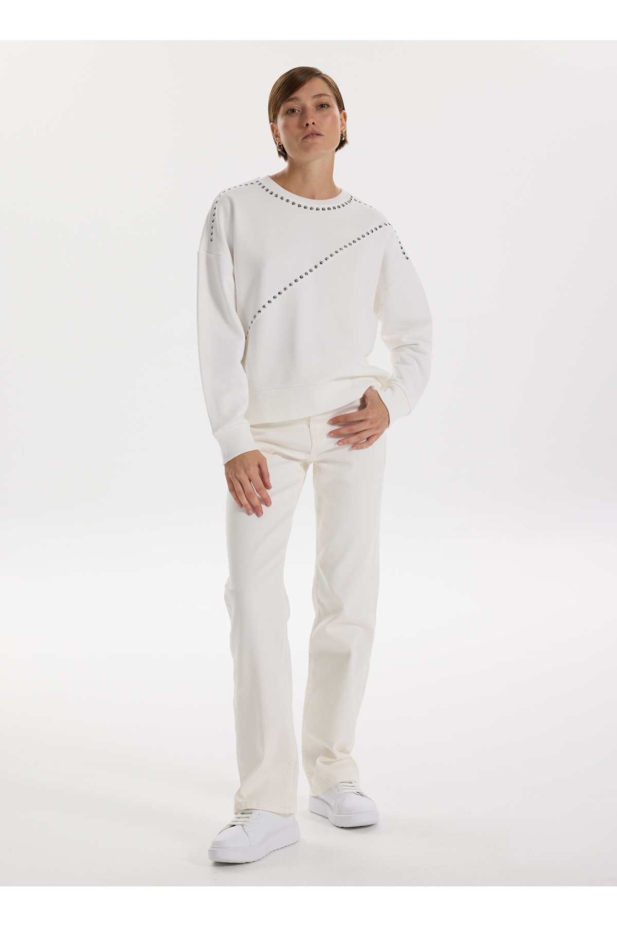 Fabrika Bisiklet Yaka Taşlı Beyaz Kadın Sweatshırt F5WL-SWT0033
