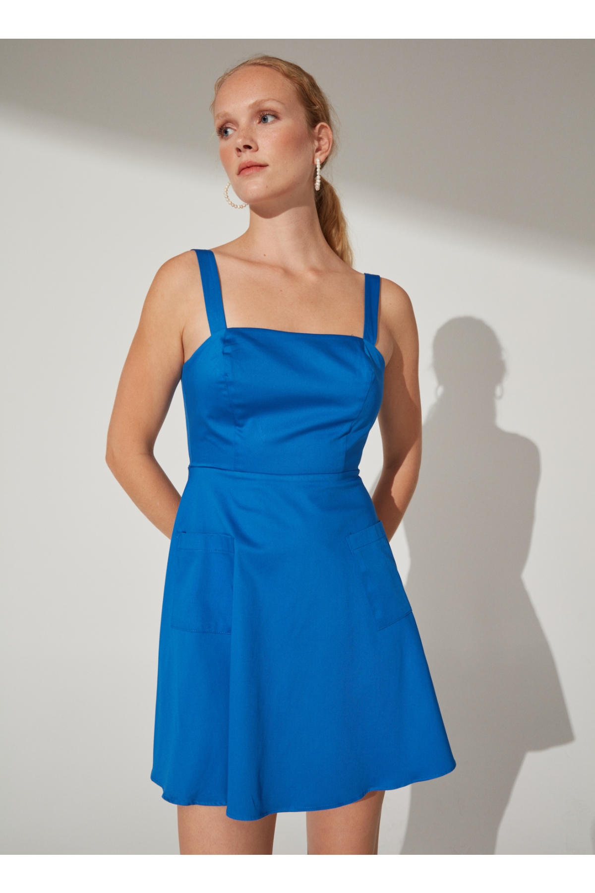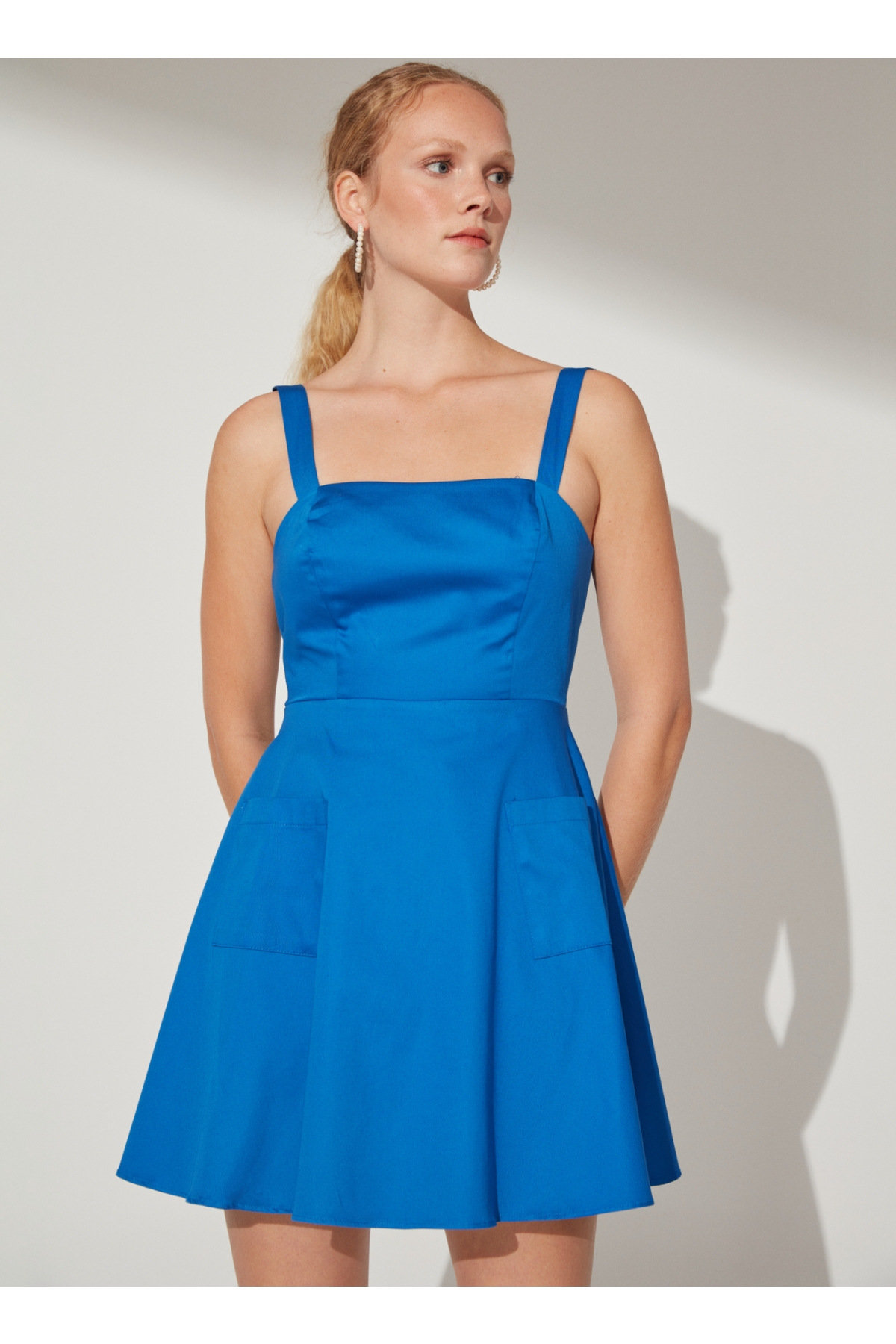 Bu çivit rengi Fabrika elbise, dolabınızın vazgeçilmezi olacak. Sade ve şık tasarımıyla her zaman göz alıcı olmanızı sağlayacak bu parça, kare yaka detayı ile zarif bir görünüm sunuyor. Askılı kol yapısı ise yaz aylarında rahatlıkla tercih edebileceğiniz bir seçenek haline getiriyor.A-Form fit kalıbının sunduğu konforlu kullanım deneyimiyle gün boyunca kendinizi iyi hissedeceksiniz. Cepli tasarımına ek olarak dekoltesiz ve yırtmaçsız özellikleri sayesinde hem günlük hayatta hem de özel davetlerde rahatlıkla giyebilirsiniz.Düz deseni sayesinde kombin yaparken zorlanmayacağınız bu elbiseyi beyaz spor ayakkabılara veya sandaletlere eşlik ettirebilirsiniz. Ayrıcana küpe ya da bilezik gibi minimal aksesuarlarla tamamlayabilirsiniz.