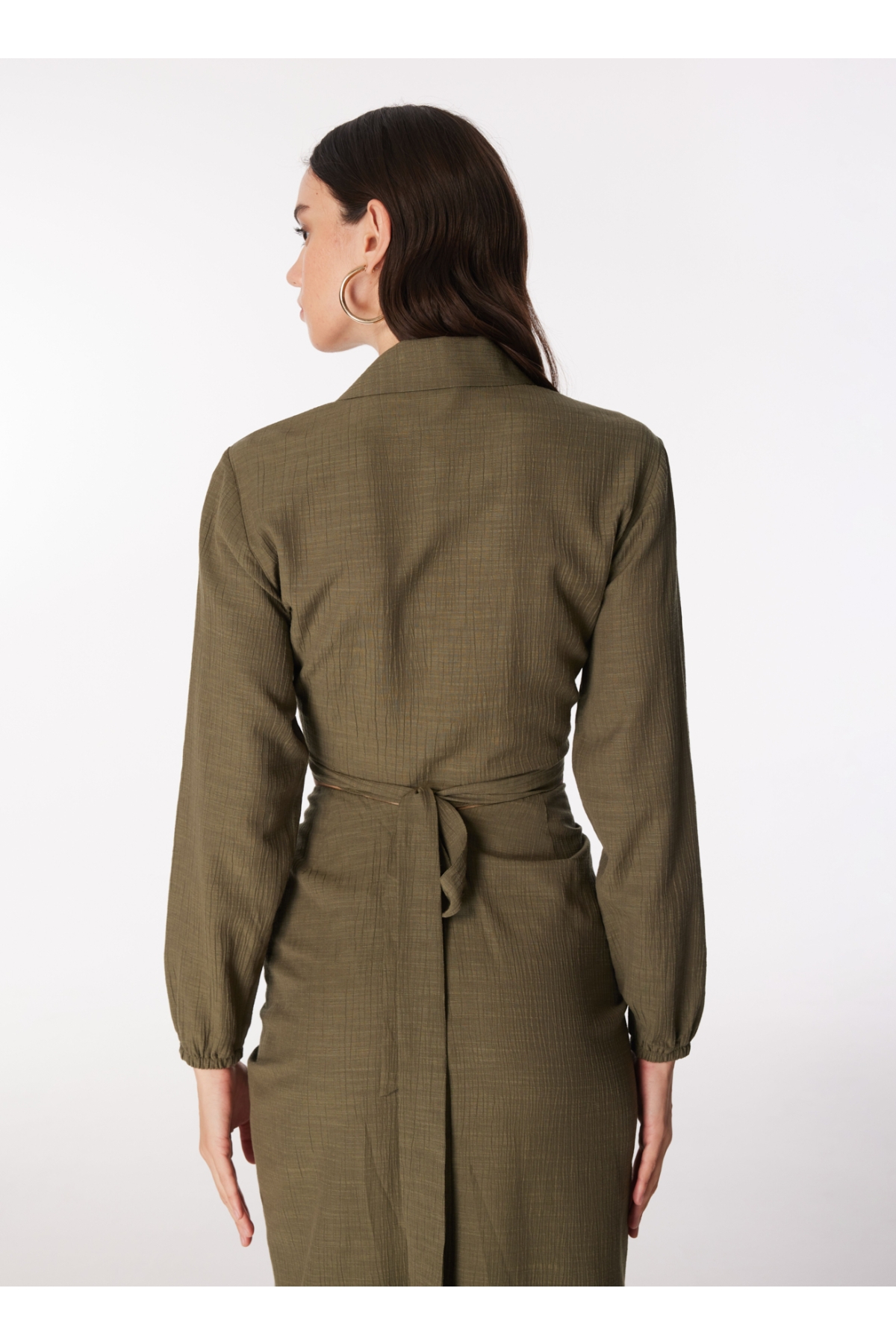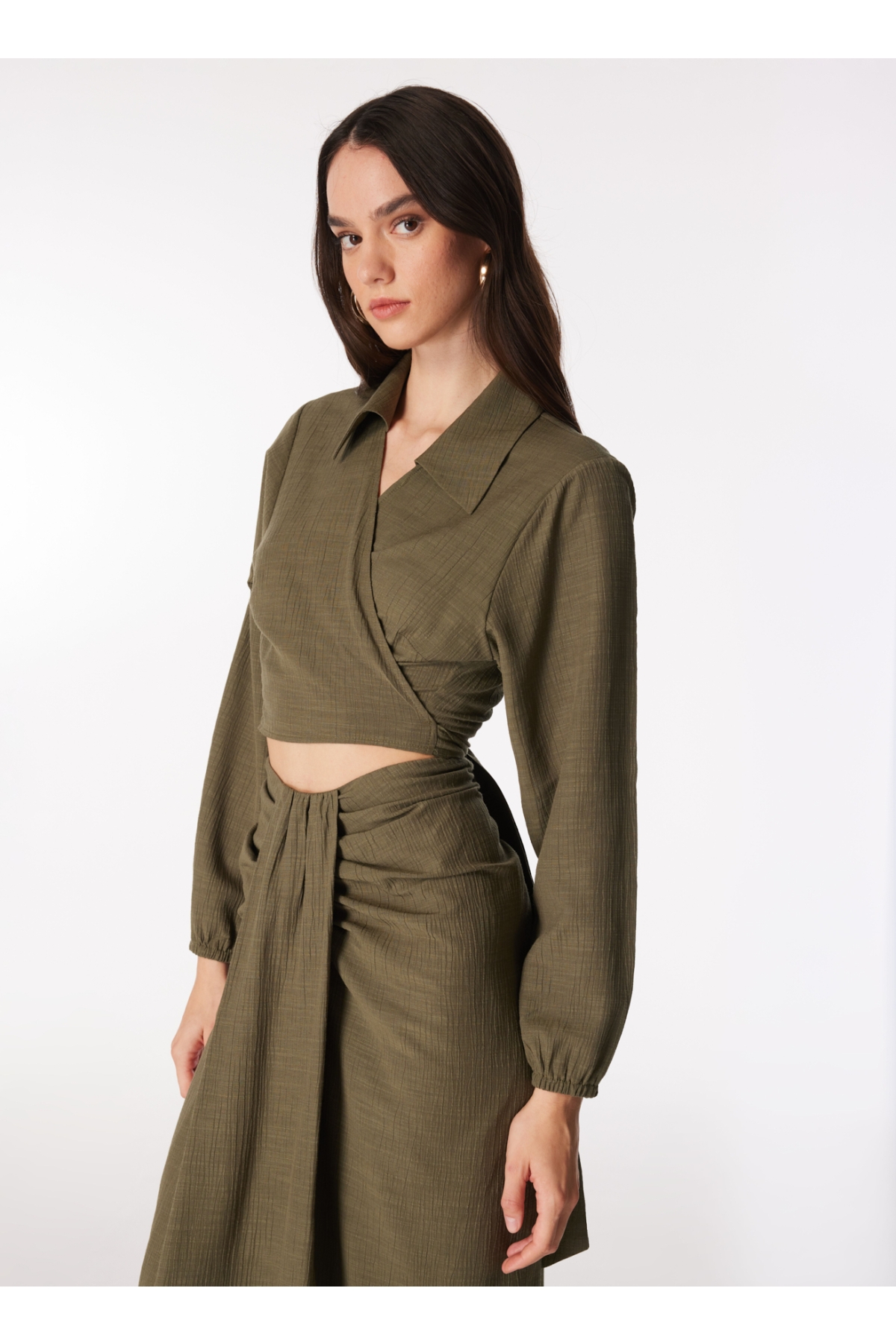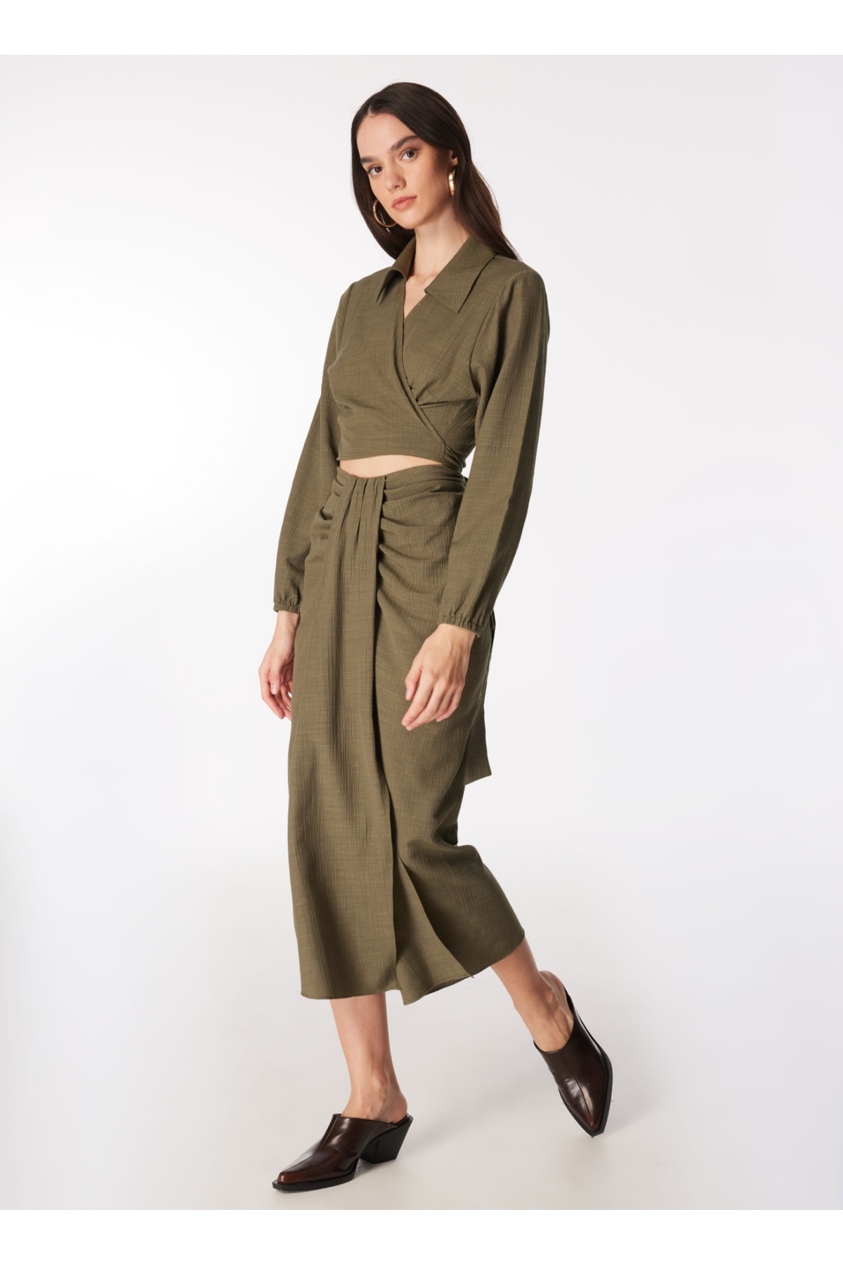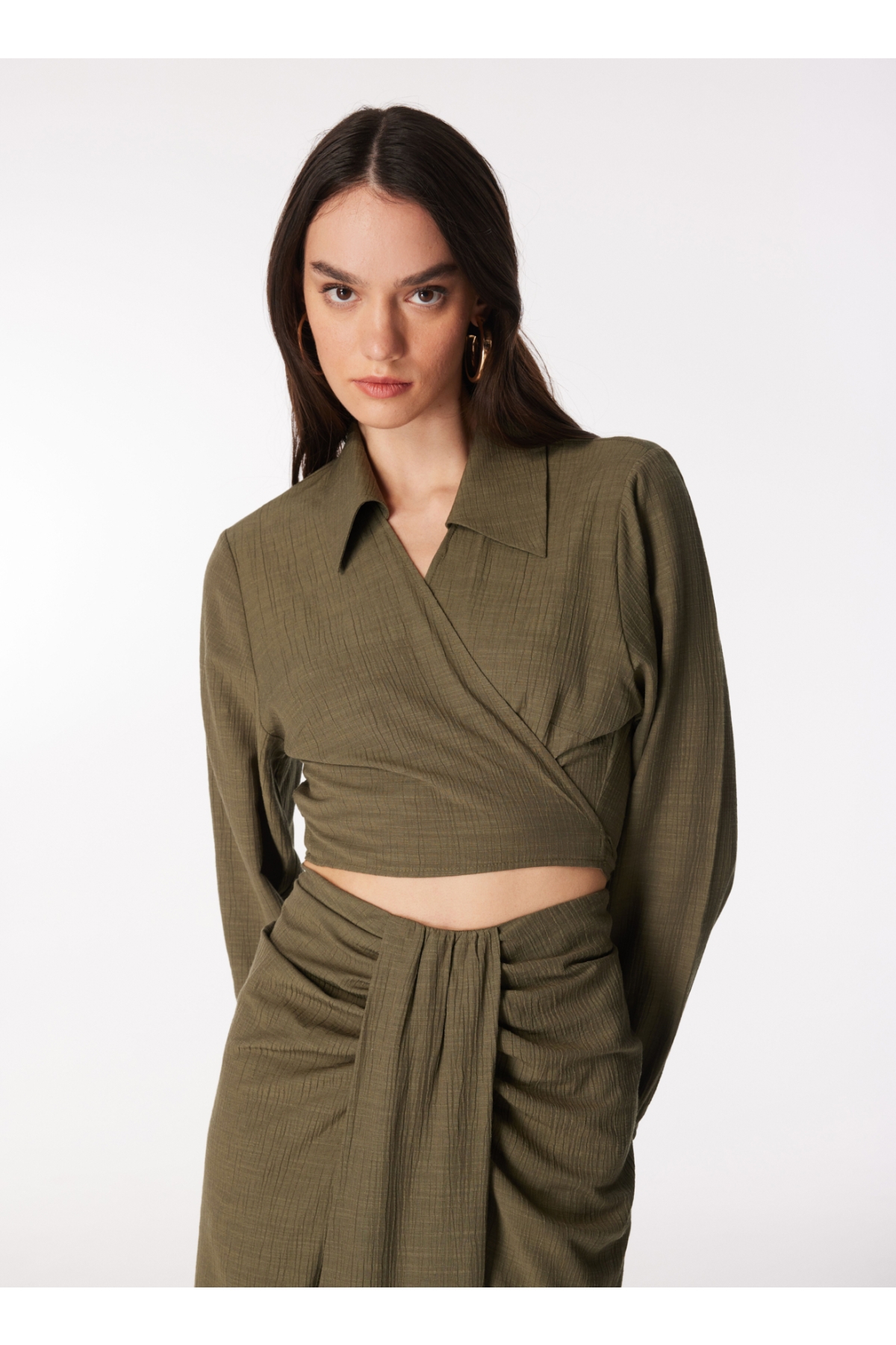 Haki rengiyle dikkat çeken Fabrika bluz, modern ve şık bir görünüm arayan kadınlar için mükemmel bir tercih sunuyor. Kruvaze yaka detayı, zarif bir siluet oluştururken uzun kolları ile hem rahatlık hem de şıklığı aynı anda sağlıyor. Crop kesimi sayesinde belinizi vurgularken, farklı kombinlerle stilinize hareket katma imkanı tanıyor.Bu bluzu yüksek bel pantolonlarla veya eteklerle kombinleyerek günlük hayatta rahatça kullanabilirsiniz. Özellikle yaz aylarında hafif dokusu ile serin tutan bu parça, akşam davetlerinde de göz alıcı olmanızı sağlayacak şekilde tasarlandı. Haki tonlarıyla uyumlu aksesuarlar seçerek görünümünüzü tamamlayabilir altın ya da gümüş takılarla ışıltınızı artırabilirsiniz.Fabrika'nın bu özel tasarımıyla her ortamda kendinizi özgür hissedecek ve tarzınızı ön plana çıkaracaksınız. Şimdi dolabınıza yeni bir soluk getirmek için harekete geçme zamanı! Bu eşsiz bluzu kaçırmayın!