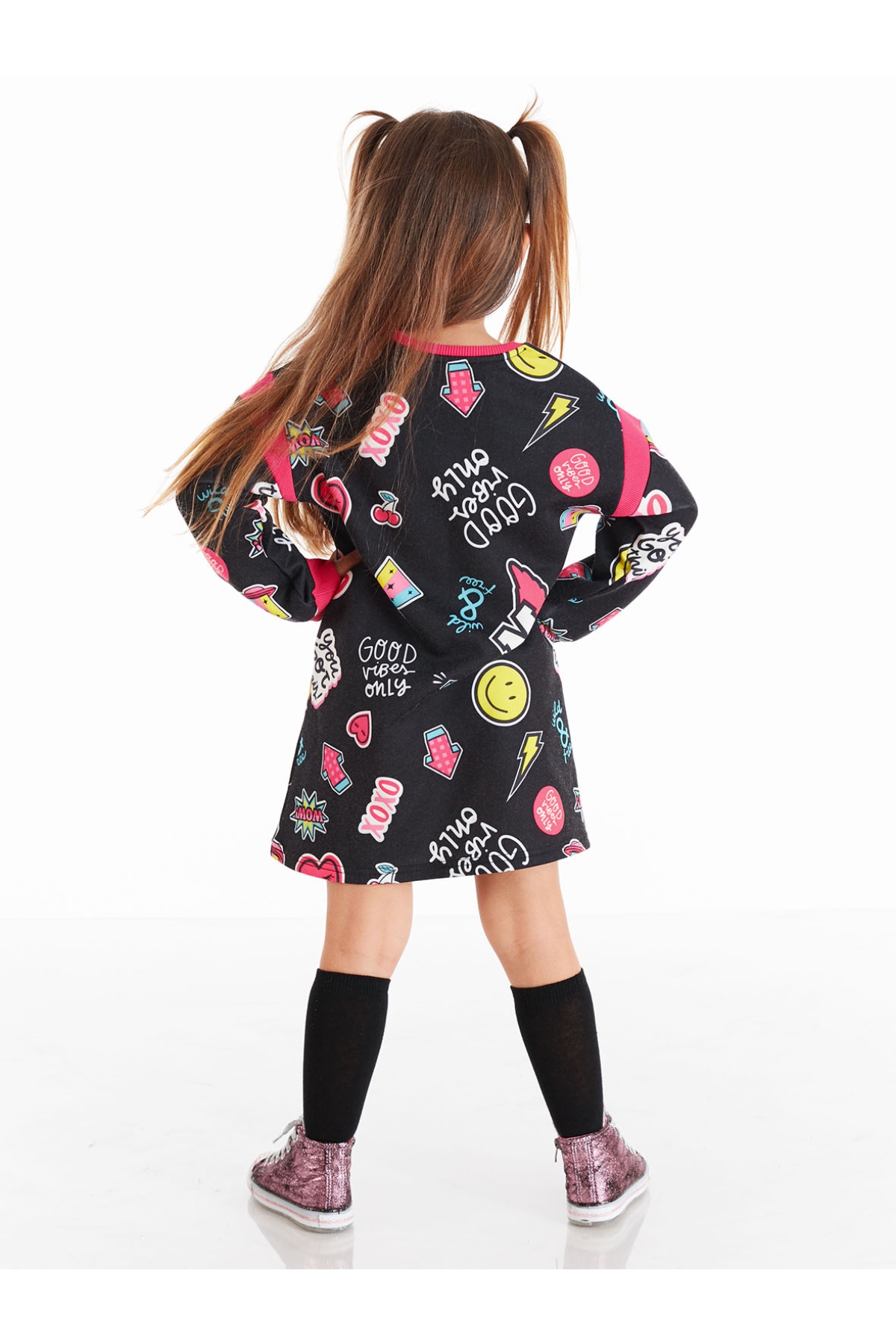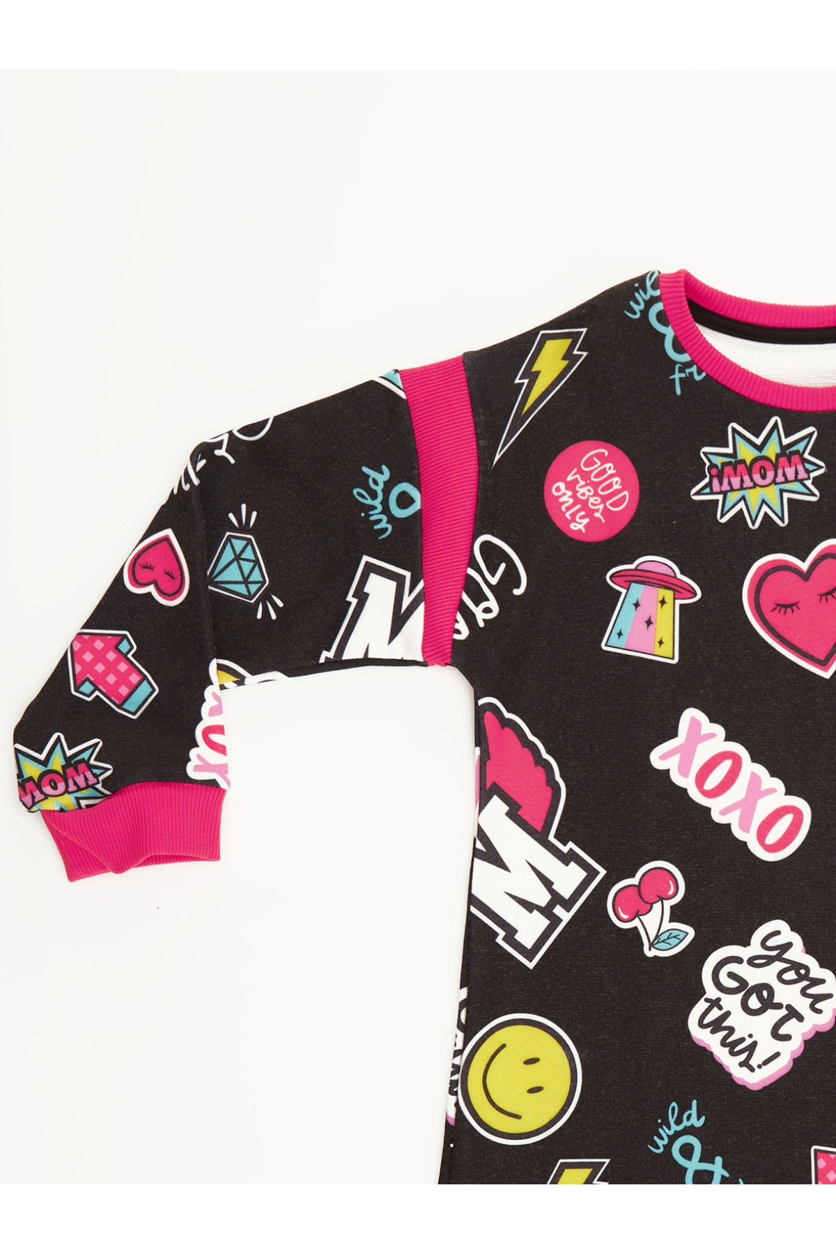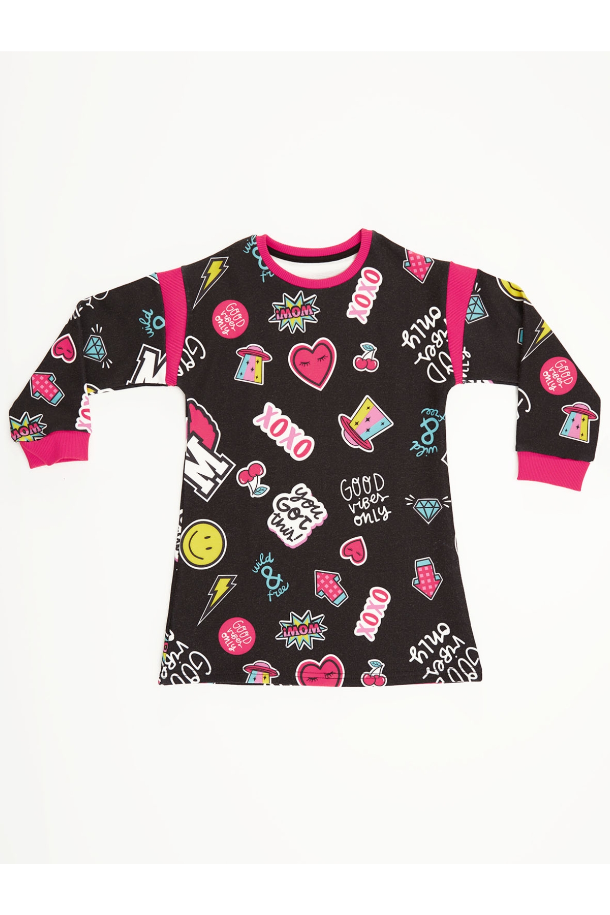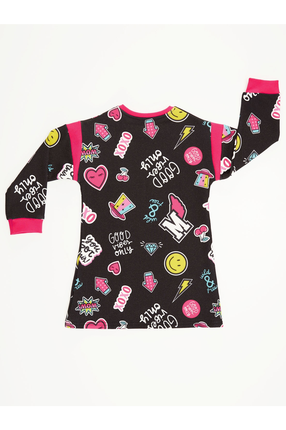 Sweat-shirt kumaşı üzerine her yeri baskılı, kol uçları lastikli elbise. %25 Pamuk %75 Polyester