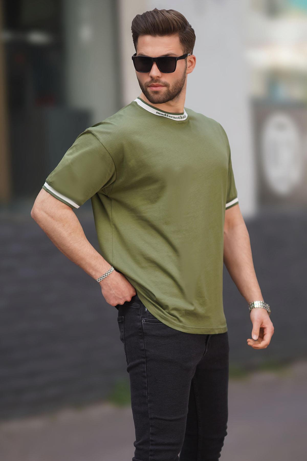 Madmext Haki Bisiklet Yaka ŞeritliTişört 7022