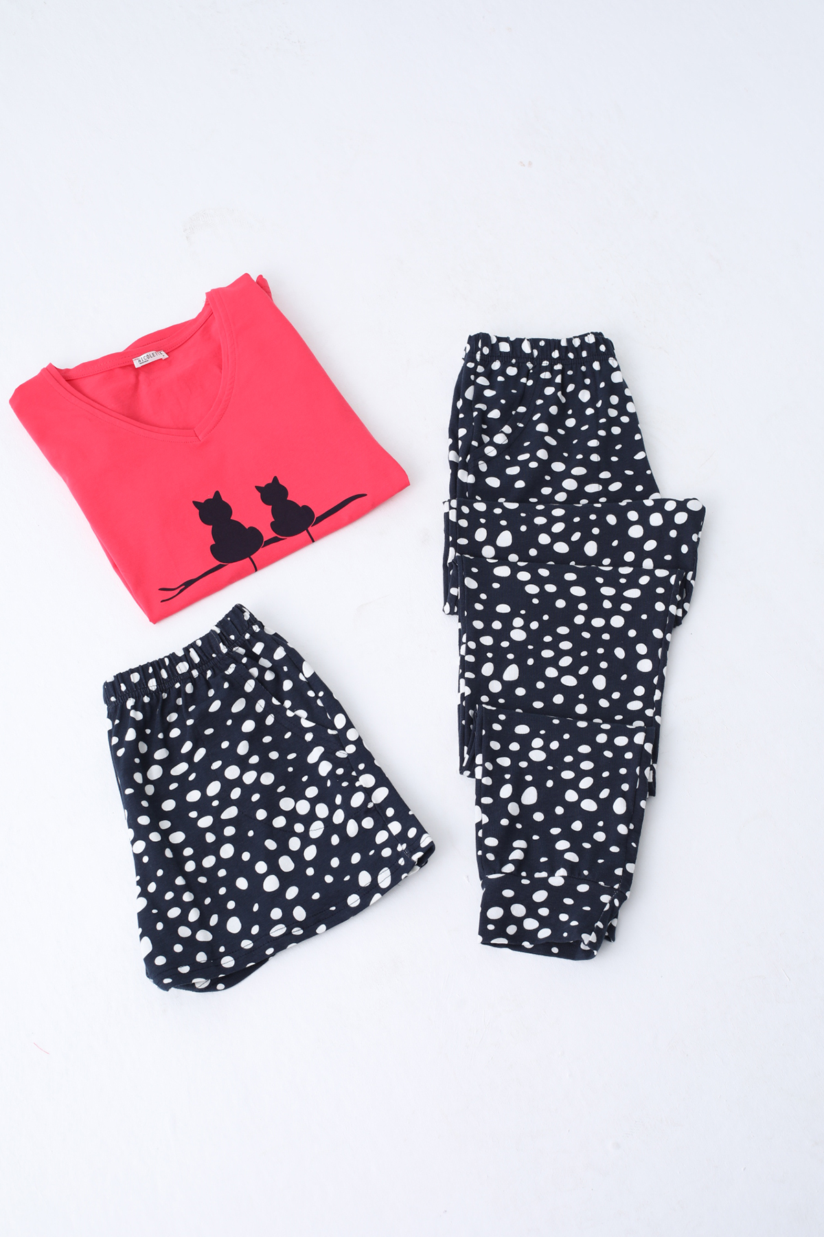 Kadın Şortlu Ve Uzun Pijama Takımı Kısa Kollu 3 Lü Set Likralı Cepli NIC1101 - %95 Pamuk %5 likradir. Ürün 30 derece de yıkanmalı ve kurutma makinasına atılmamalıdır. Urun 3 parçadır