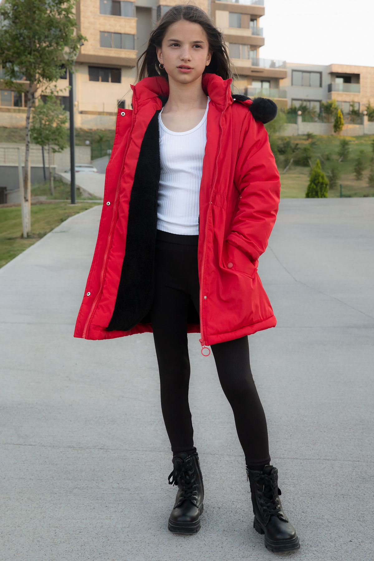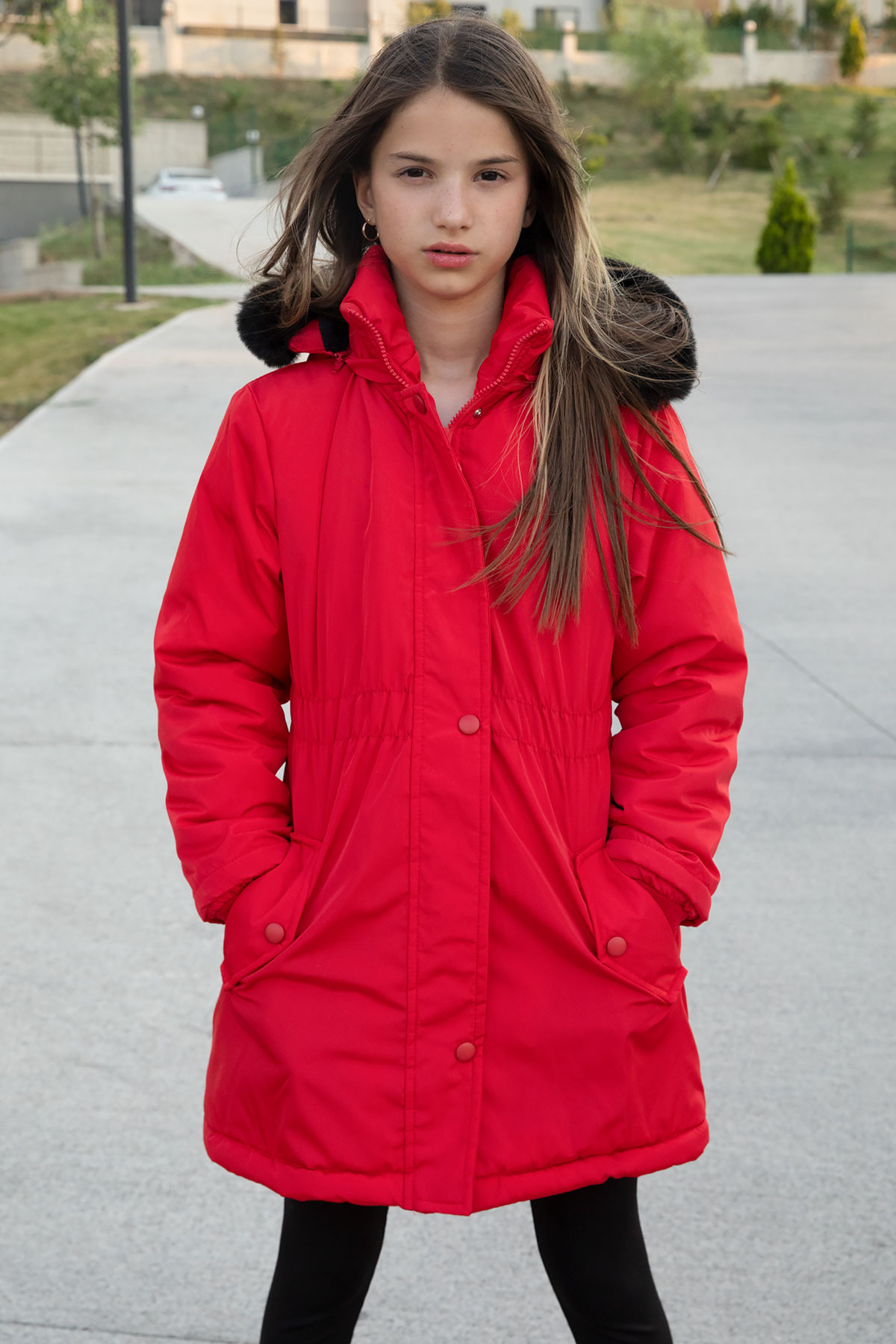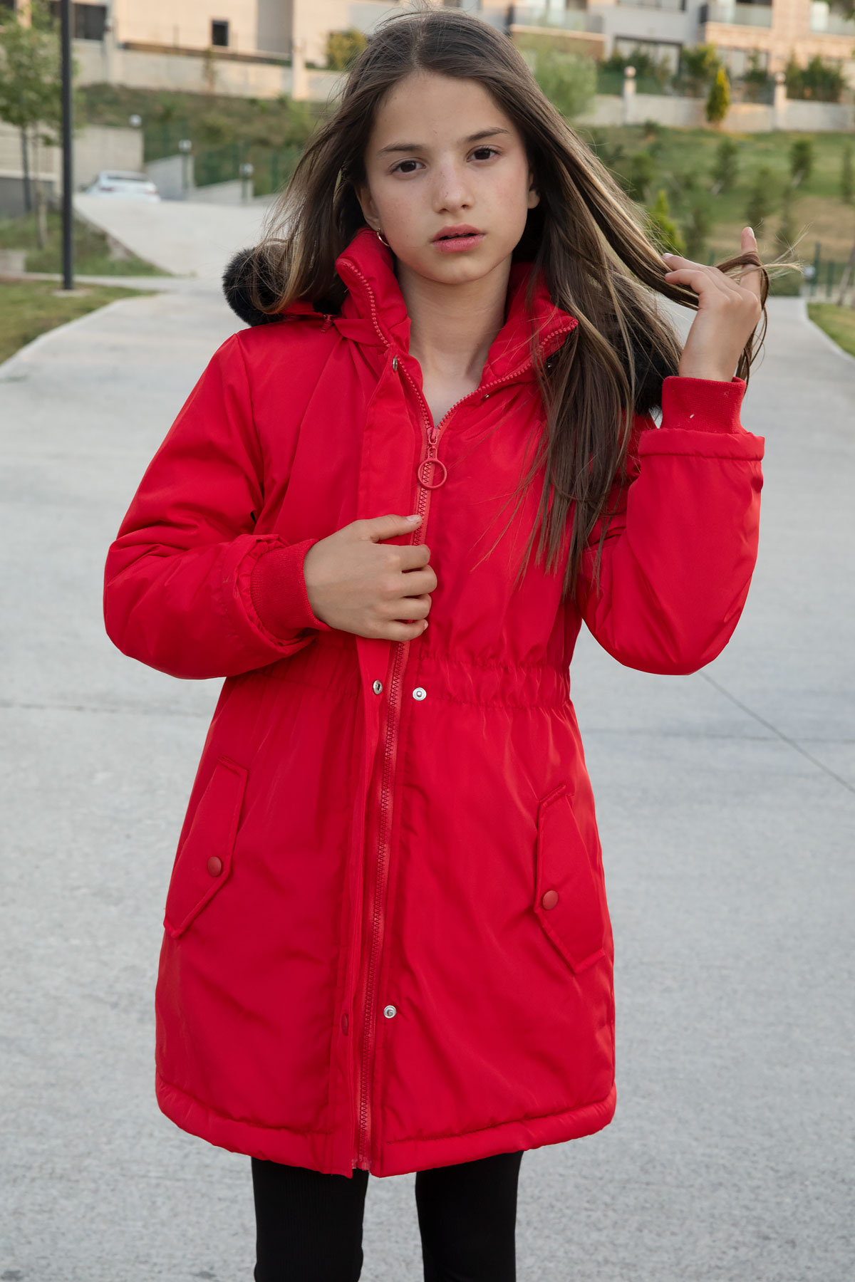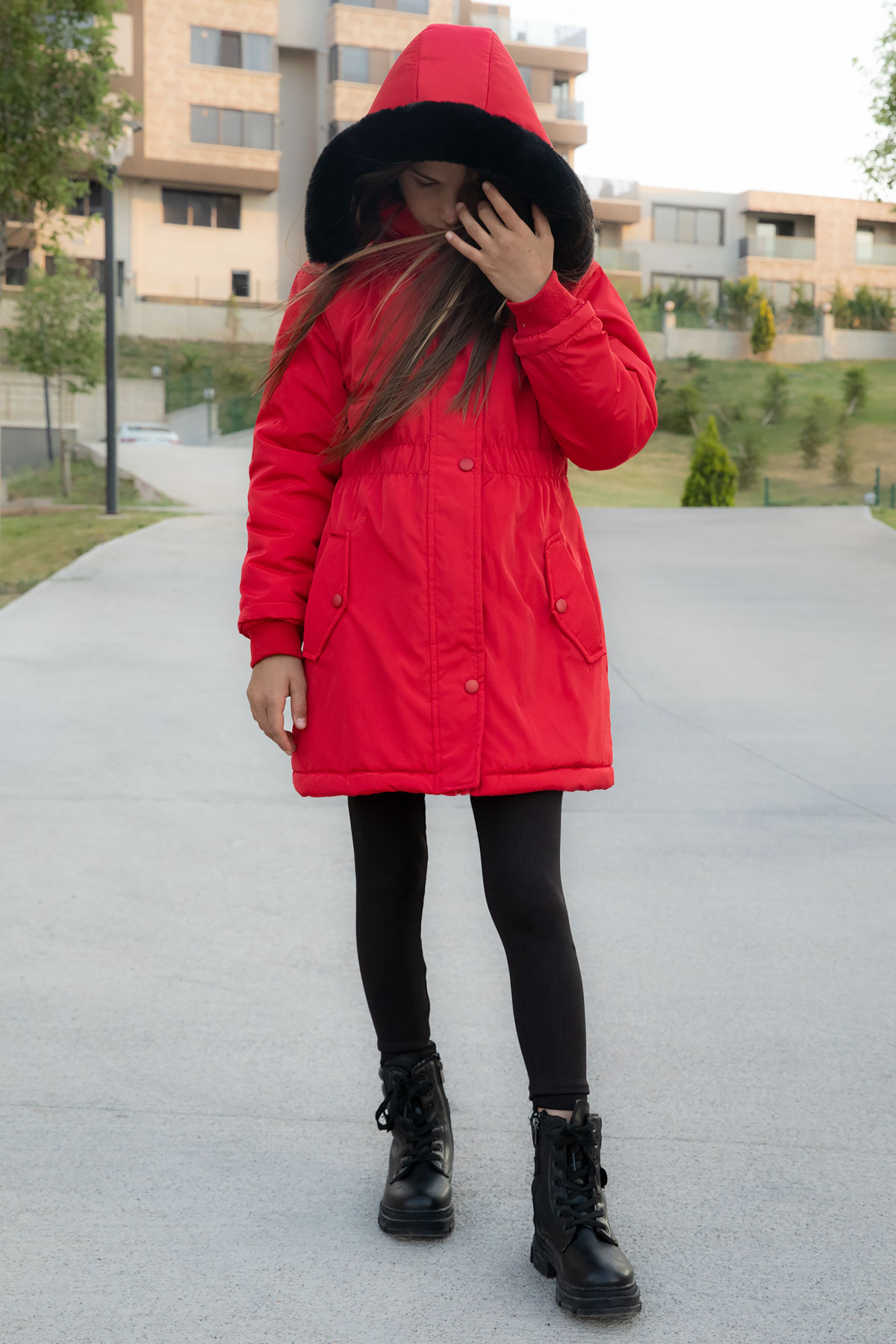 Cansın Mini Kırmızı Çıtçıtlı Cepli Esnek Bel İçi Kürklü Kız Çocuk Kapüşonlu Mont 21305