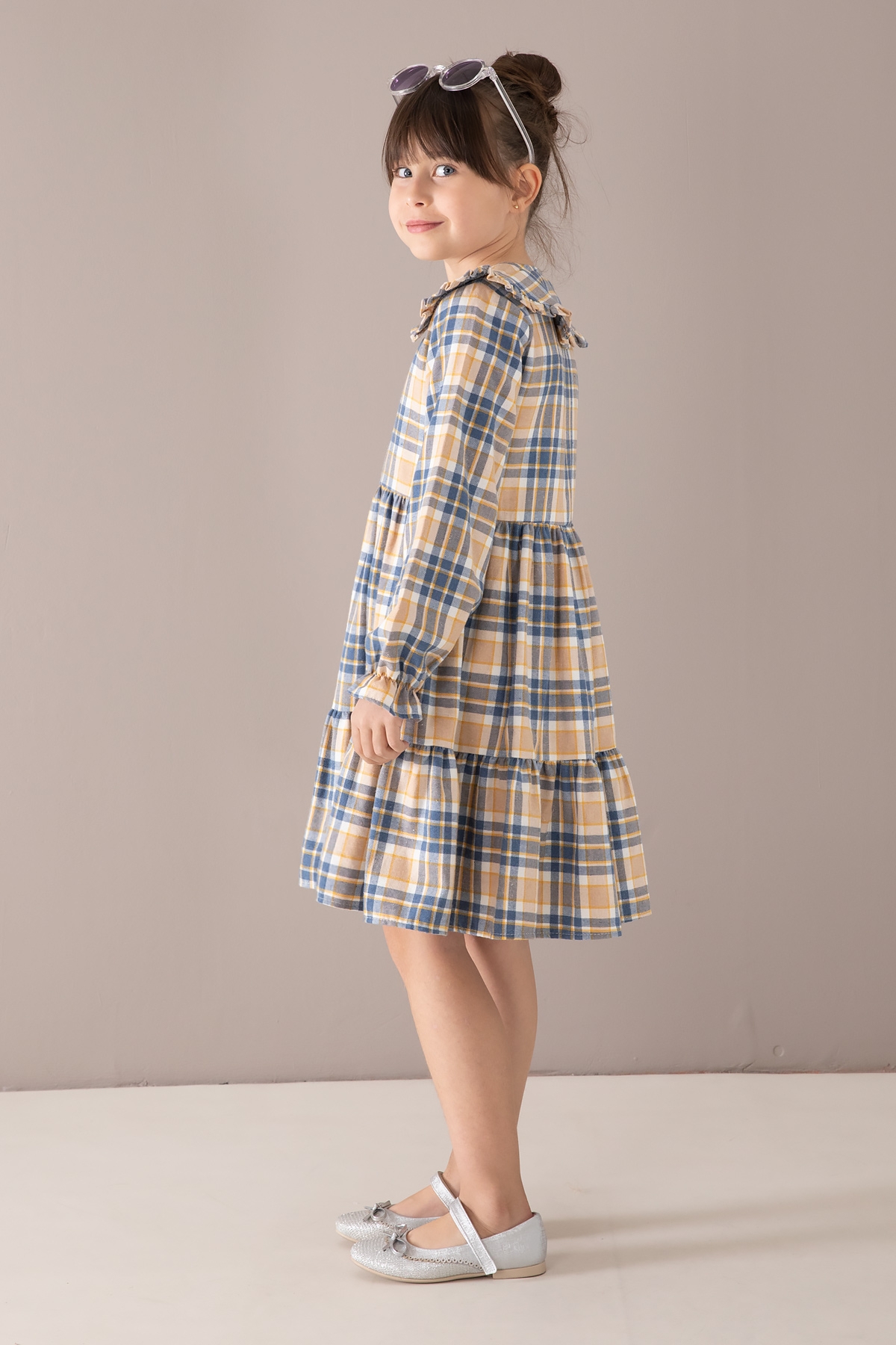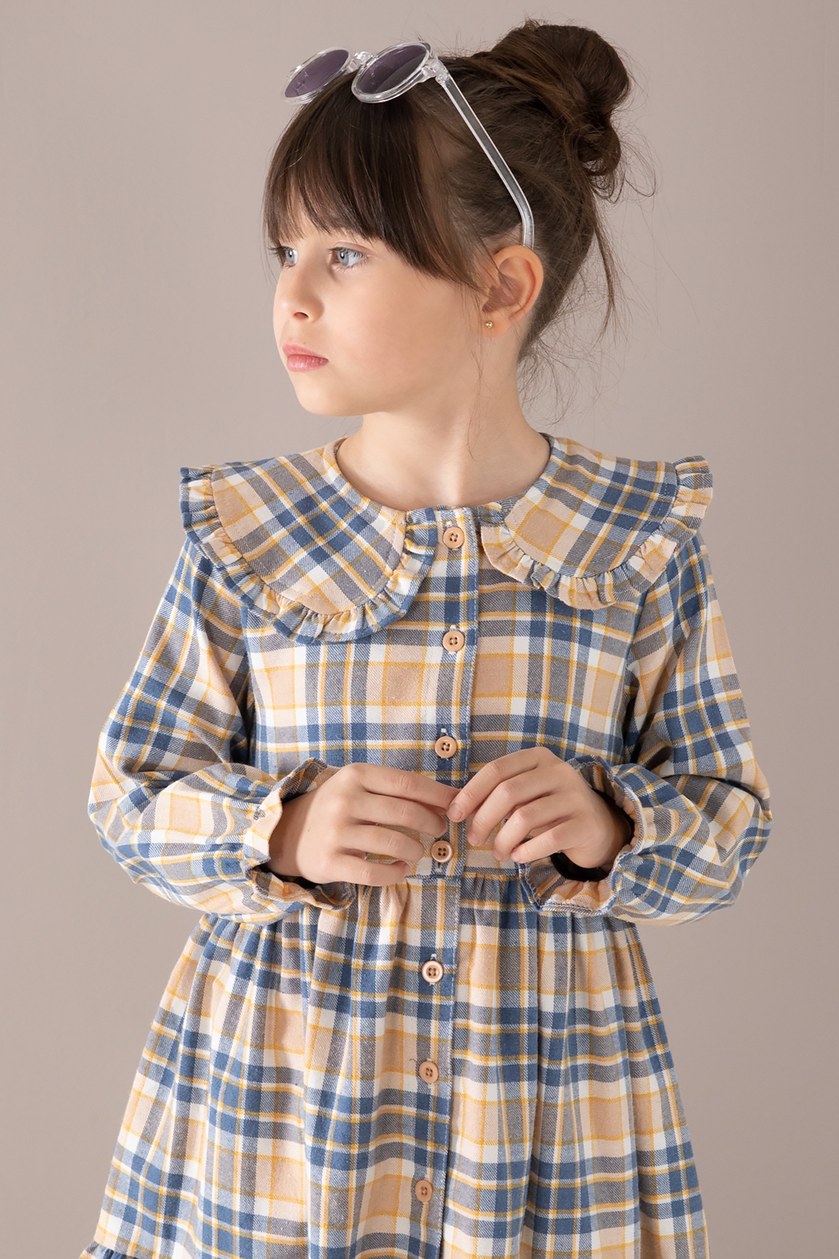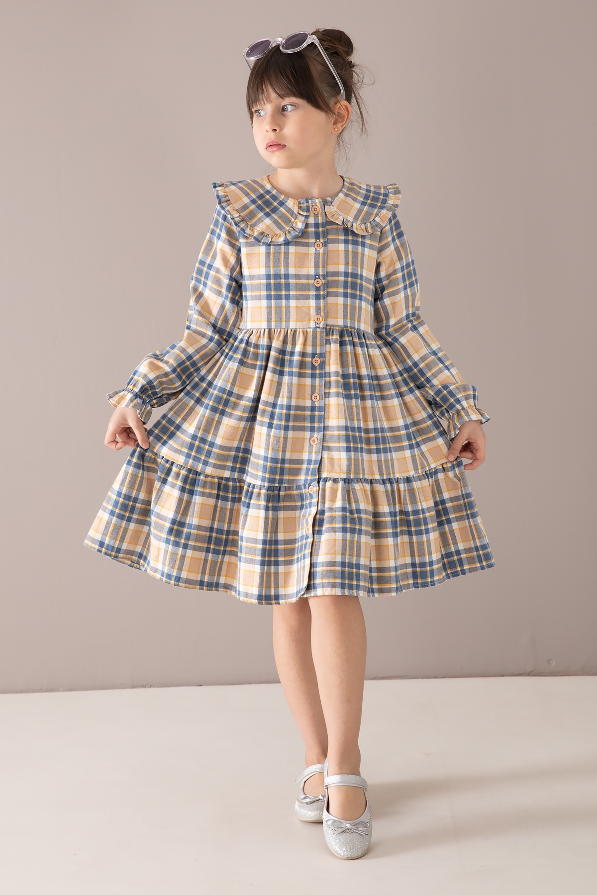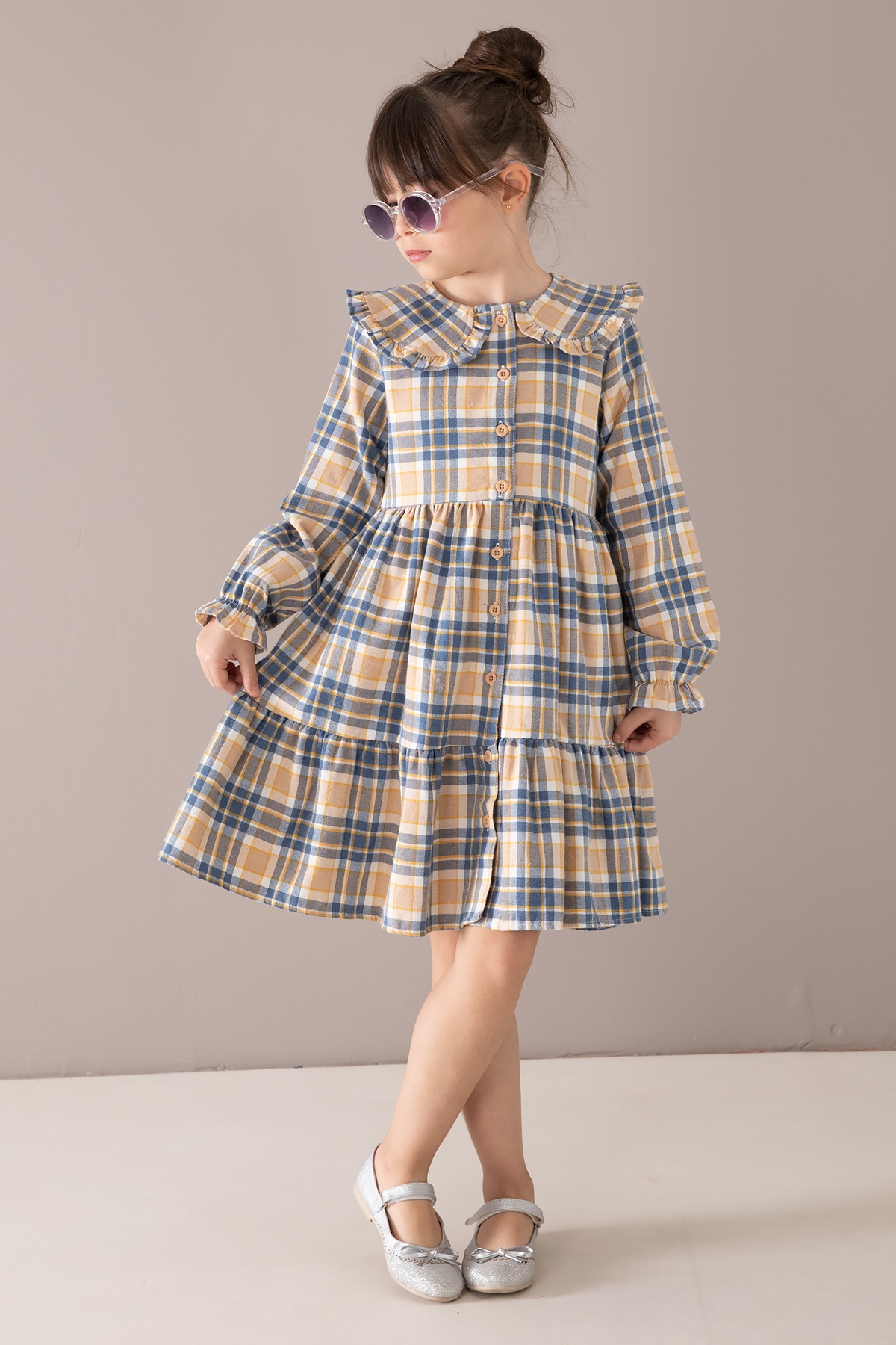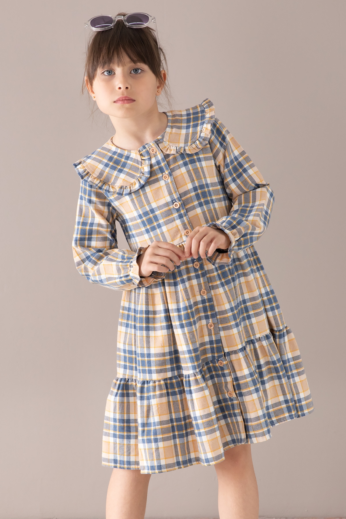 Kumaş İçeriği: %70 Pamuk %30 Polyester İçeriklidir. Türkiye'de Üretilmiştir. Şık Bebe Yaka ve Boydan Düğme Kapamalı Uzun Kol Kız Çocuk Elbise Modeli.
