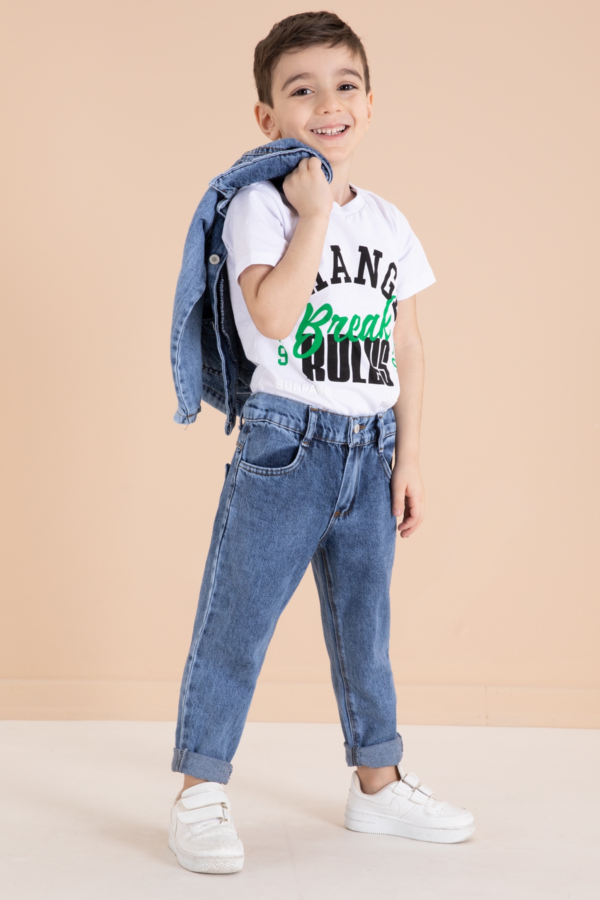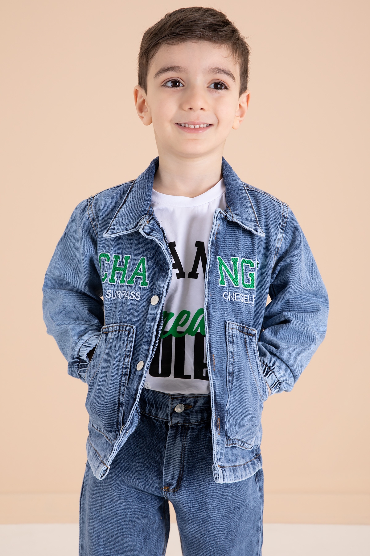 Kumaş İçeriği: %100 Cotton Kumaştır. Türkiye'de Üretilmiştir. Yazı Nakışlı 2 Adet Cebe Sahip Ceket, Jean Pantolon ve Bisiklet Yaka T-shirtten Oluşan Erkek Çocuk 3lü Jean Takım.