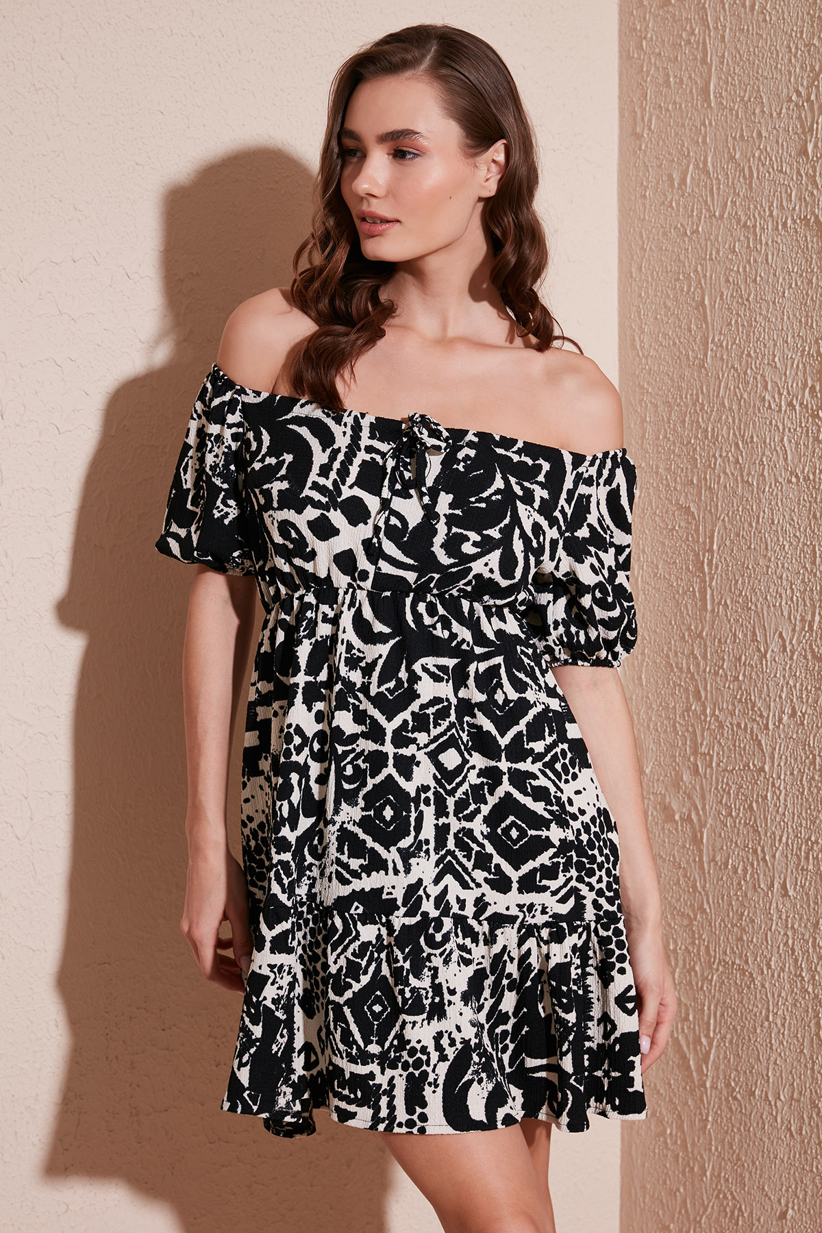 Marka : Lela Model : Mini Elbise Sezon : İlkbahar/YazDesen : Desenli Materyal : % 97 Polyester % 3 Elastan Yaka Bilgisi : Carmen YakaKol Bilgisi : Kısa Kol Kalıp Bilgisi : Slim FitManken Ölçüsü : Boy : 1.75 cm / Göğüs : 80 cm / Bel : 61 cm / Basen : 89 cm / Beden : MÜretim Yeri : Türkiye 2DY5865728.07
