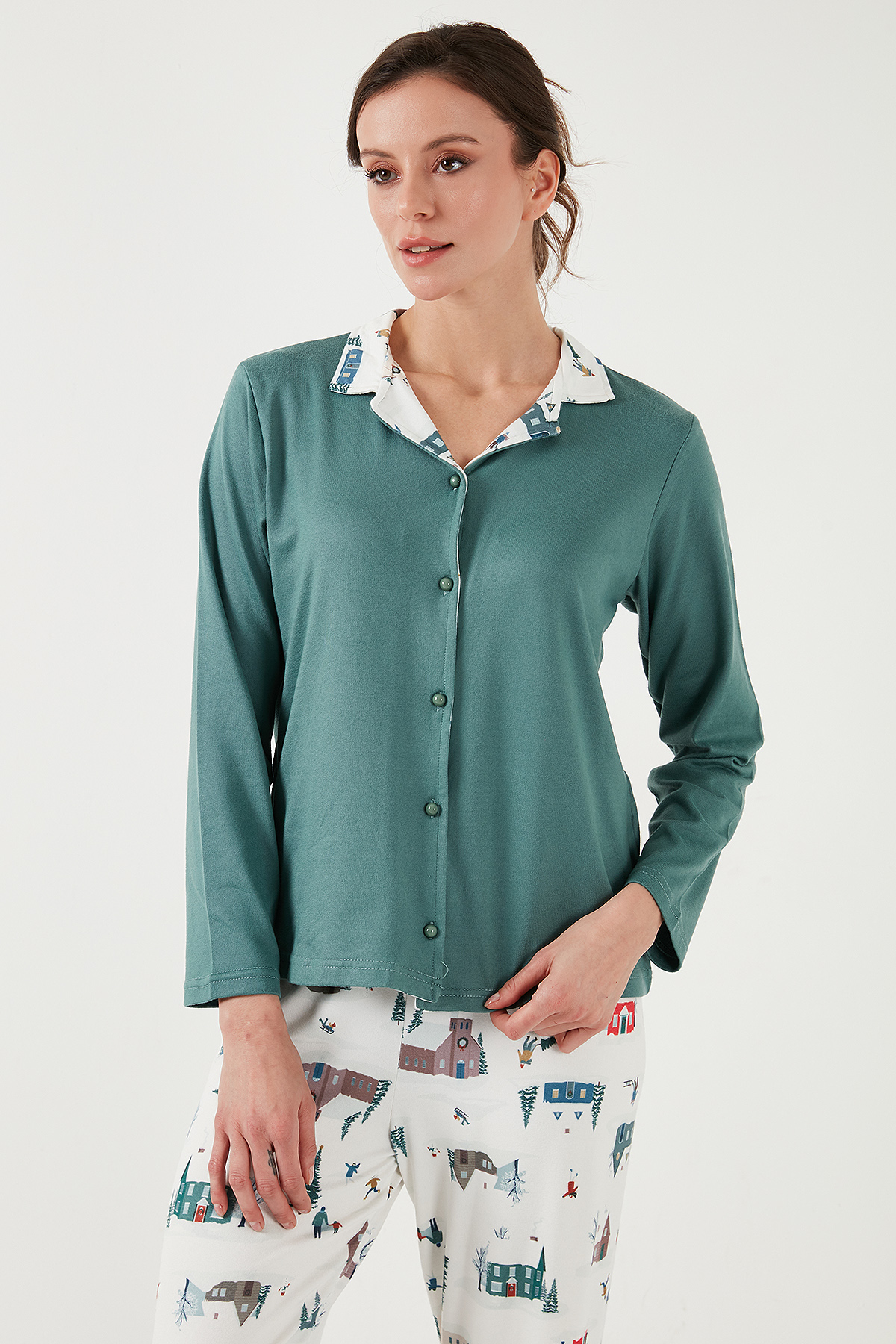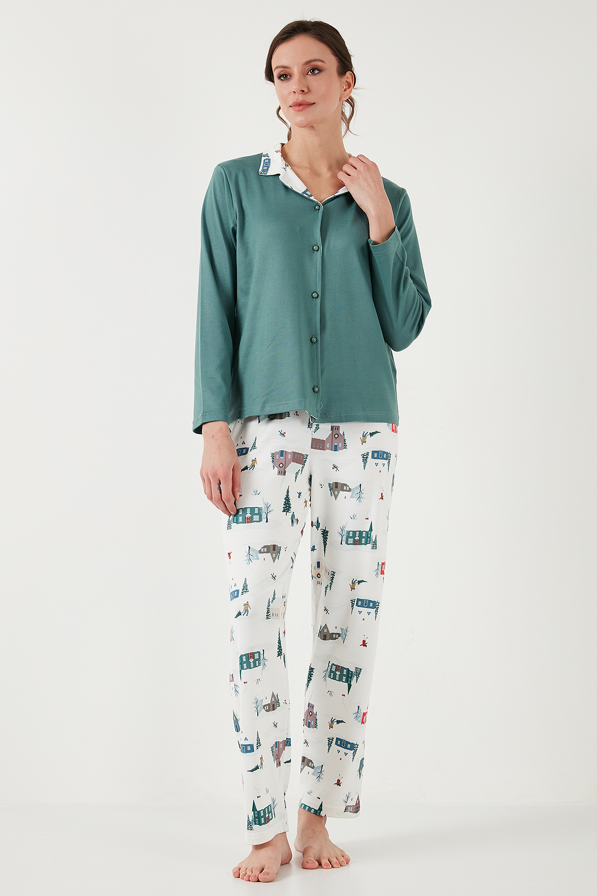 Marka : Lela Model : Pijama Takımı Giyim Tarzı : Ev Giyim/Gecelik Desen : Desenli Materyal : % 95 Polyester % 5 Elastan Yaka Bilgisi : Apaş Yaka Kapama Bilgisi : Düğme Kol Bilgisi : Uzun Kol Kalıp Bilgisi : Regular Fit,Normal Bel, Bol Paça Detay : -Beli Lastikli-Desenli Yaka detayı Manken Ölçüsü : Boy : 1.75 cm / Göğüs : 85 cm / Bel : 65 cm / Basen : 93 cm / Beden : M 2DK65714300.08