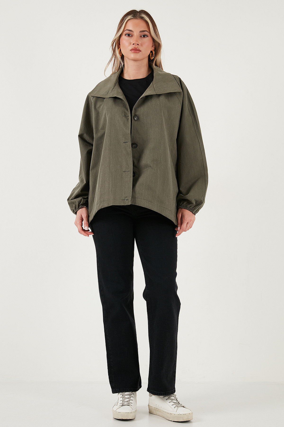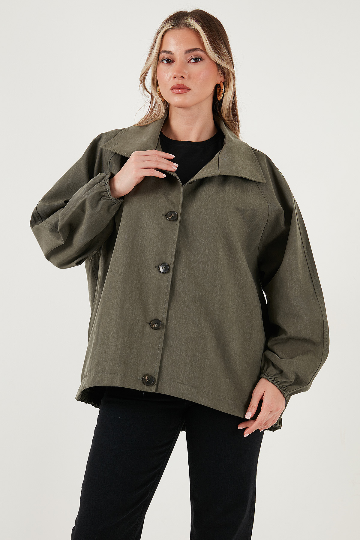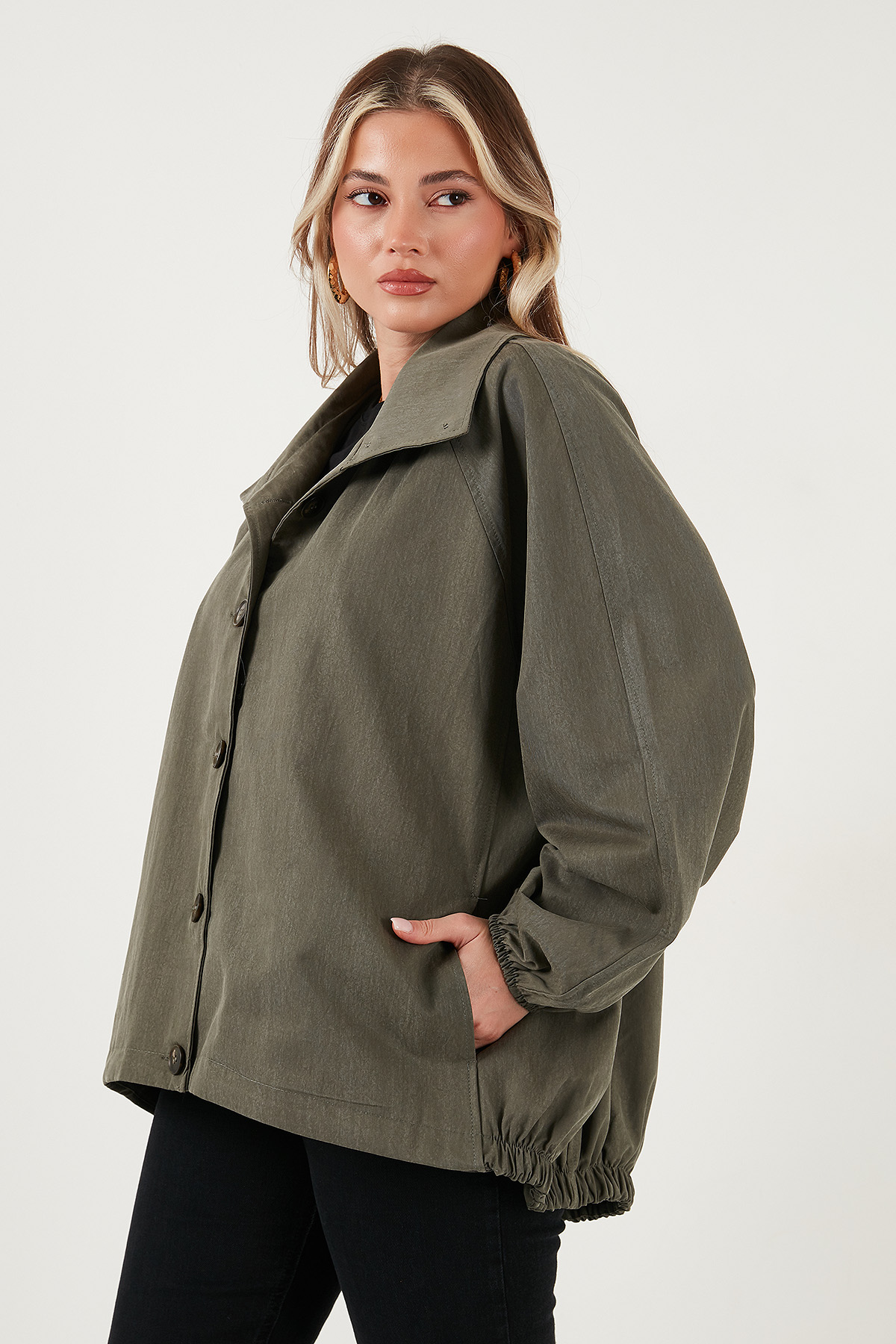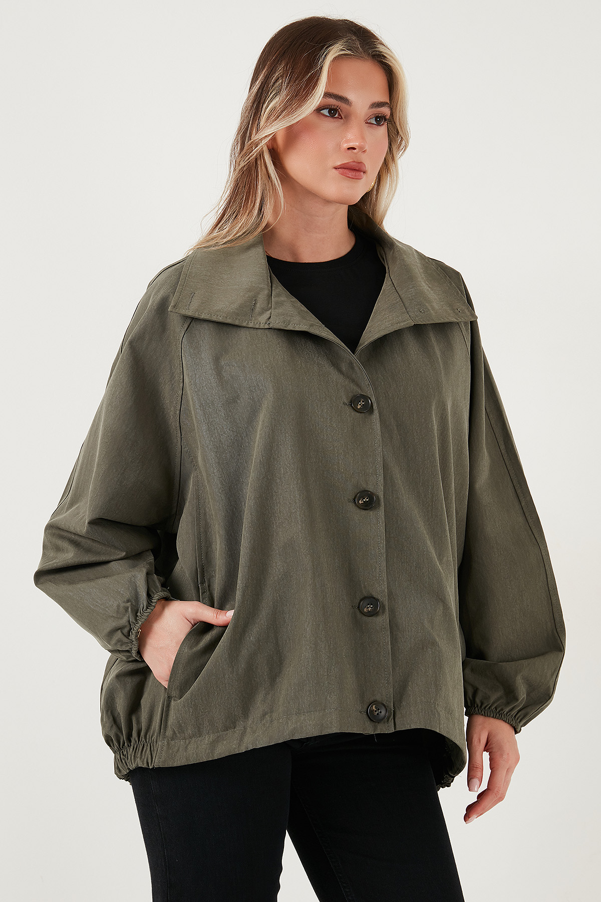Model: Trençkot Giyim Tarzı: Günlük/Casual Materyal: % 56 Liyosel % 44 Pamuk Yaka Tipi: Ceket Yaka Kapama Şekli: Düğmeli Kol Tipi: Uzun Kol Cep: Cepli Kumaş Tipi: Belirtilmemiş Boy: Standart Kalıp Bilgisi: Oversize Fit Manken Bedeni: Boy: 1.78 cm / Göğüs: 85 cm / Bel: 62 cm / Basen: 92 cm / Beden: Onesize Yaş Grubu: Yetişkin Menşei: Türkiye Detaylar: Sırt kısmı lastikli 2DK6839627.65