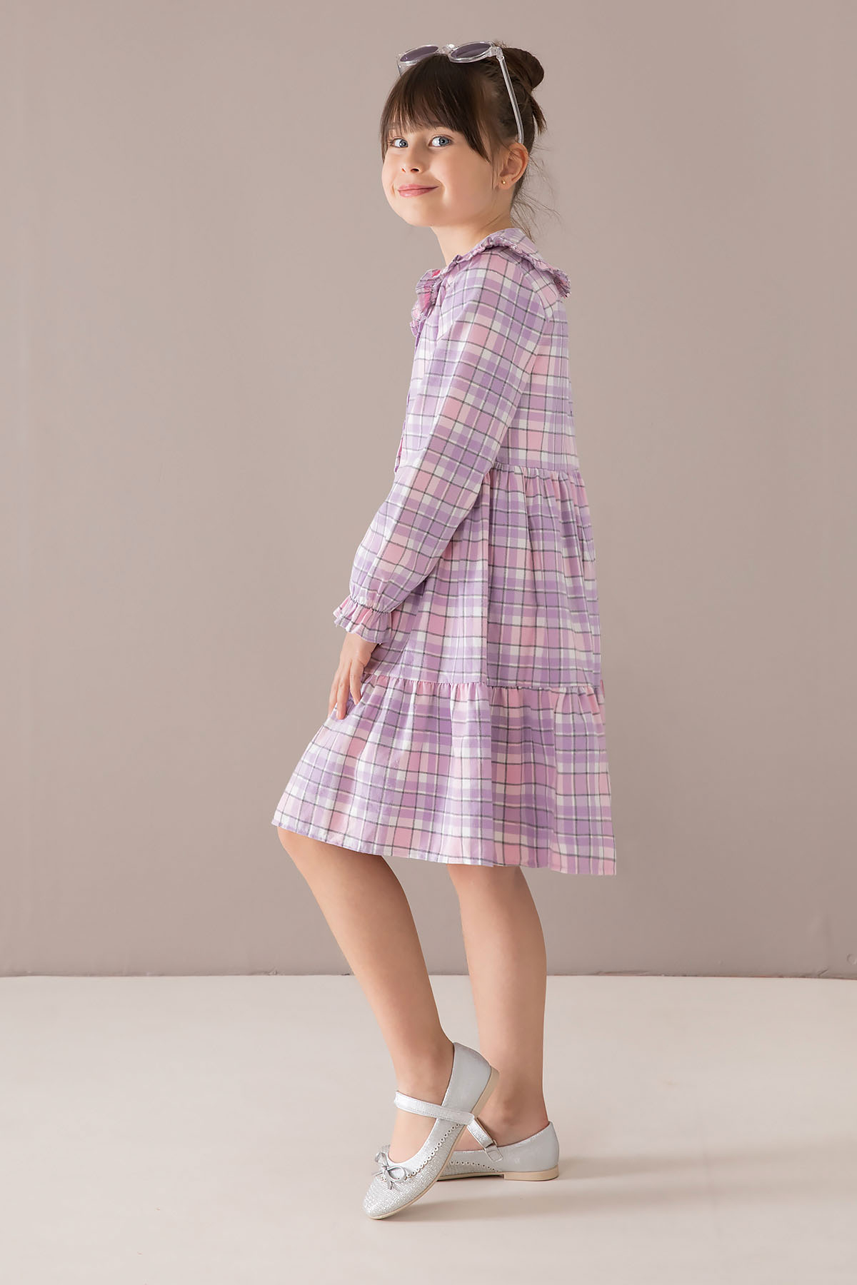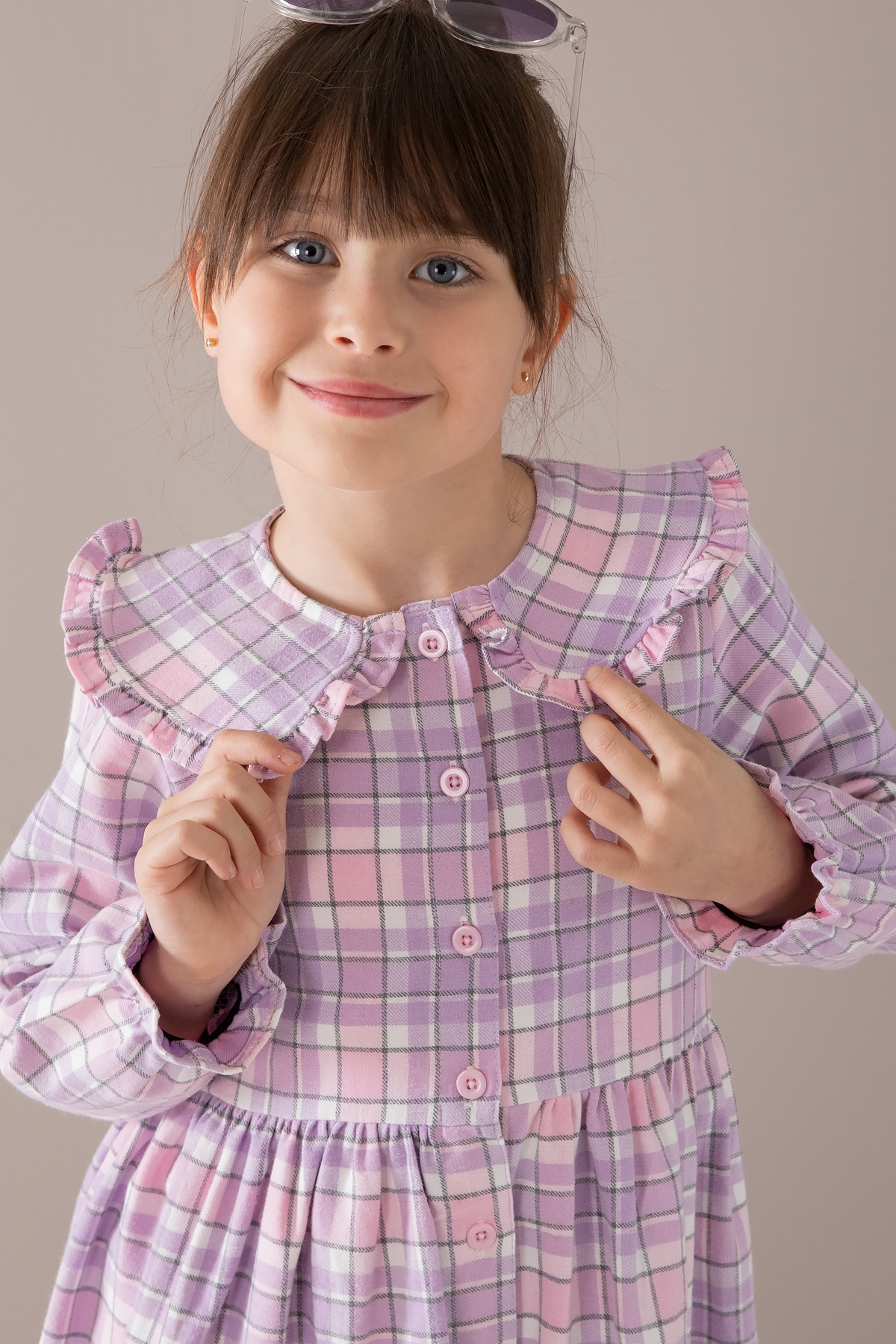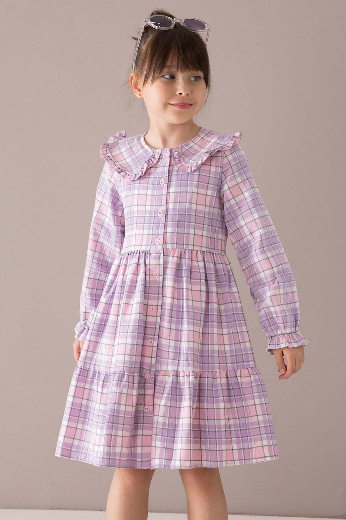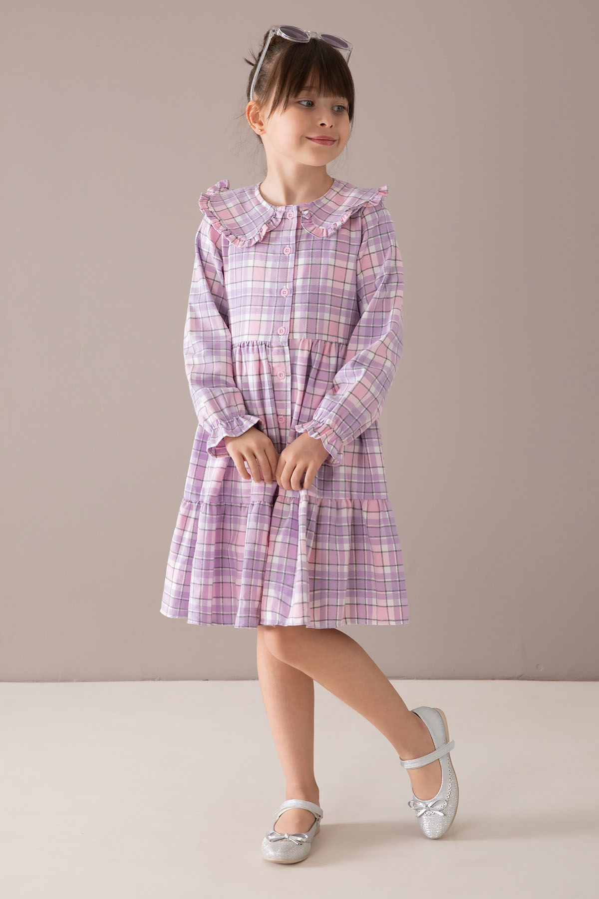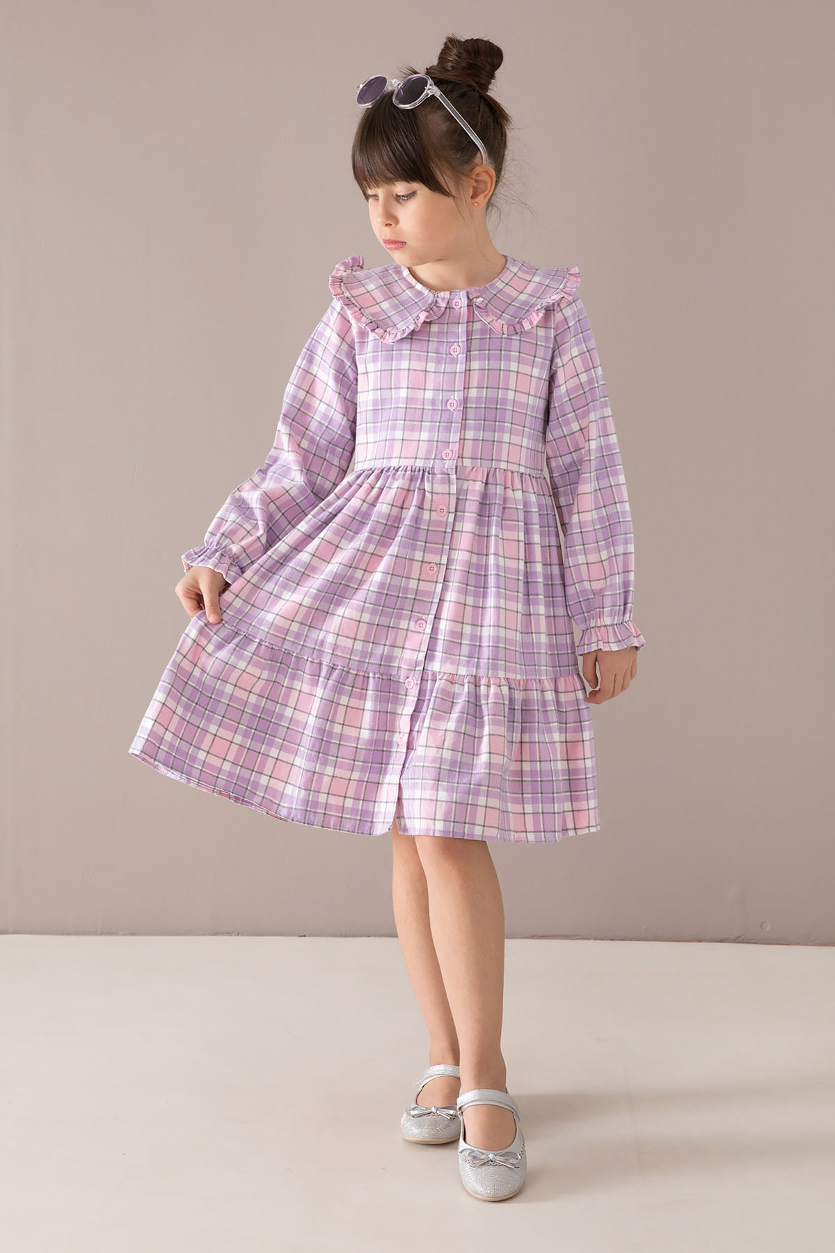 Kumaş İçeriği: %70 Pamuk %30 Polyester İçeriklidir. Türkiye'de Üretilmiştir. Şık Bebe Yaka ve Boydan Düğme Kapamalı Uzun Kol Kız Çocuk Elbise Modeli.
