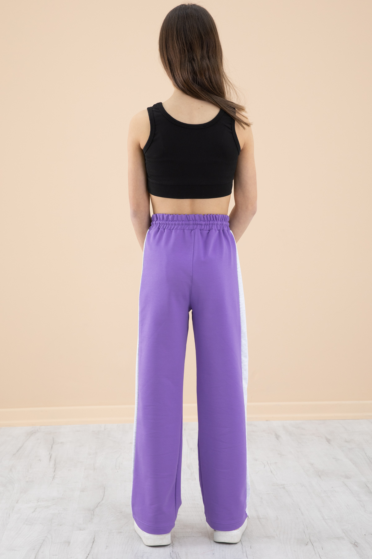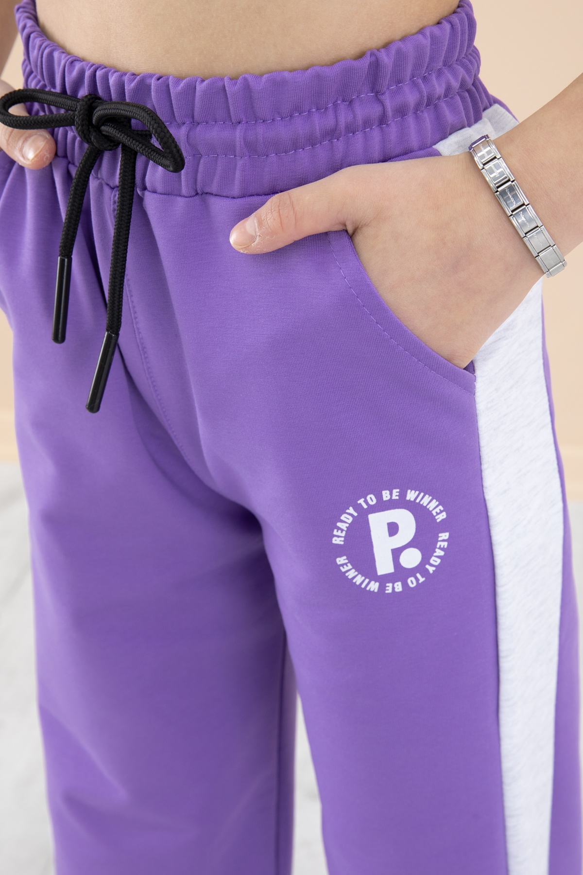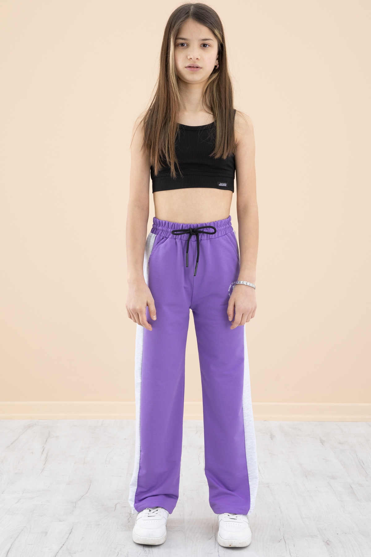 Kumaş İçeriği: %75 Pamuk %20 Polyester %5 Elastan İçeriklidir. Türkiye'de Üretilmiştir. Garnili Kumaş Detayı, Yazı Baskılı ve Geniş Paça Kesimi ile Beli Lastikli Kız Çocuk Eşofman Altı Modeli.