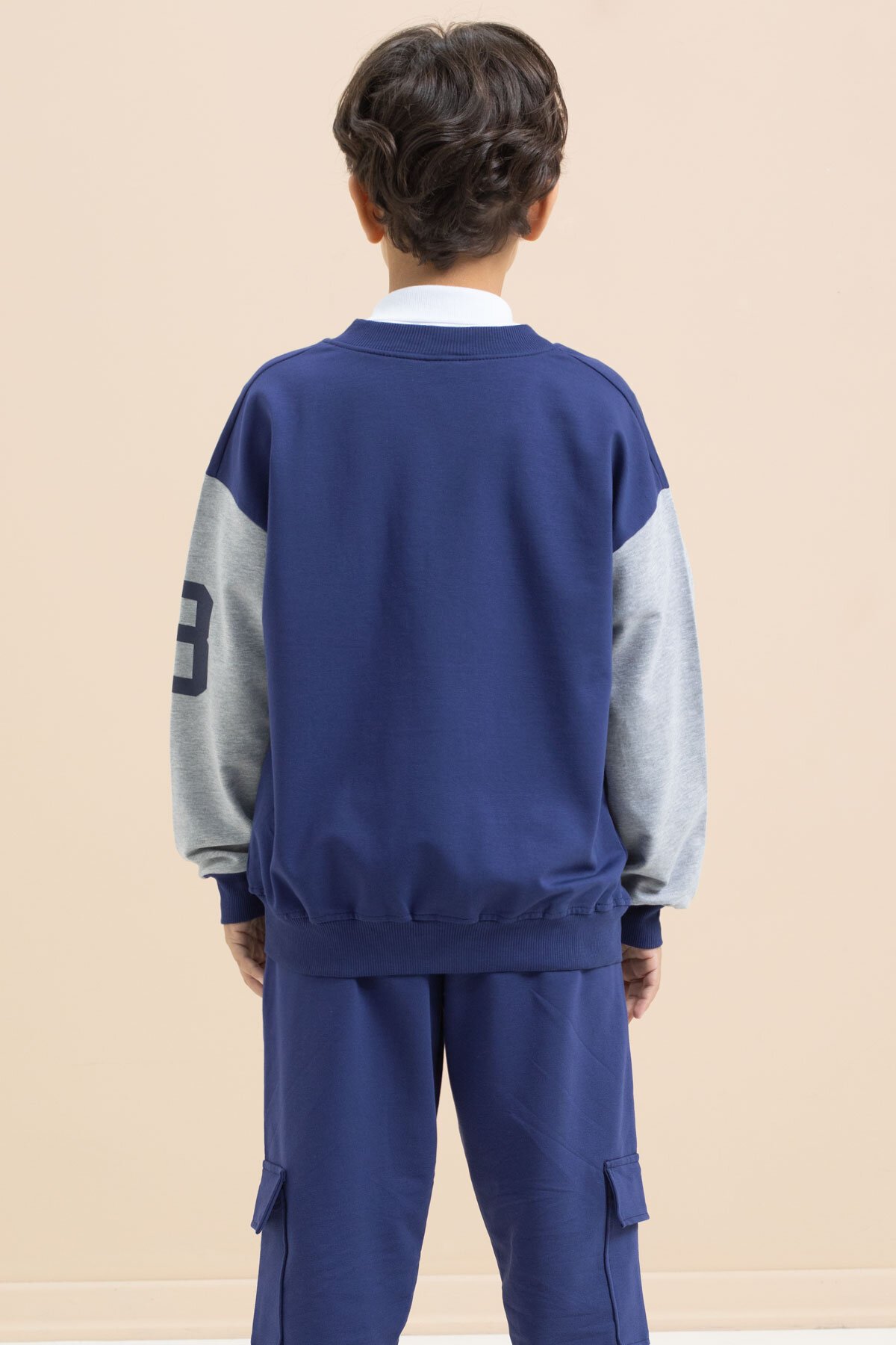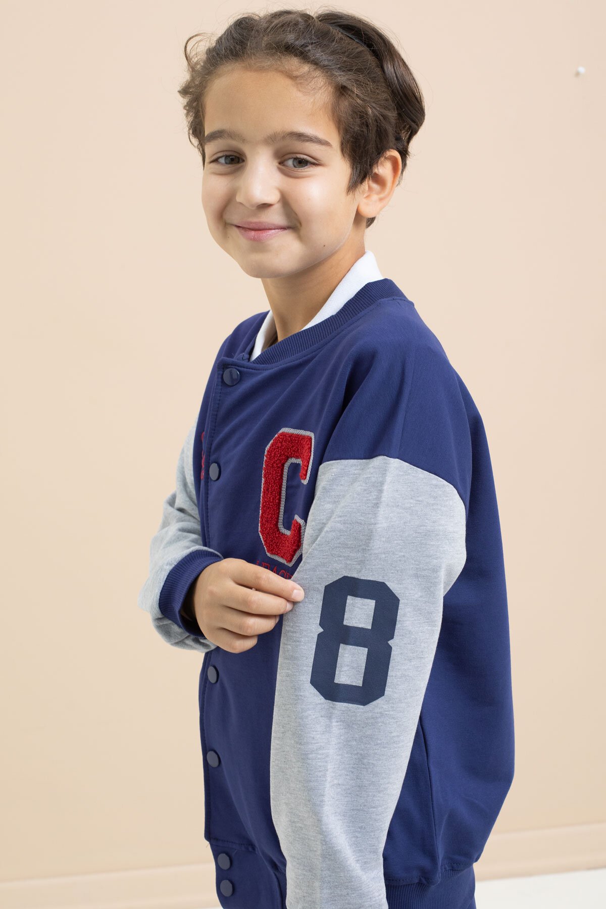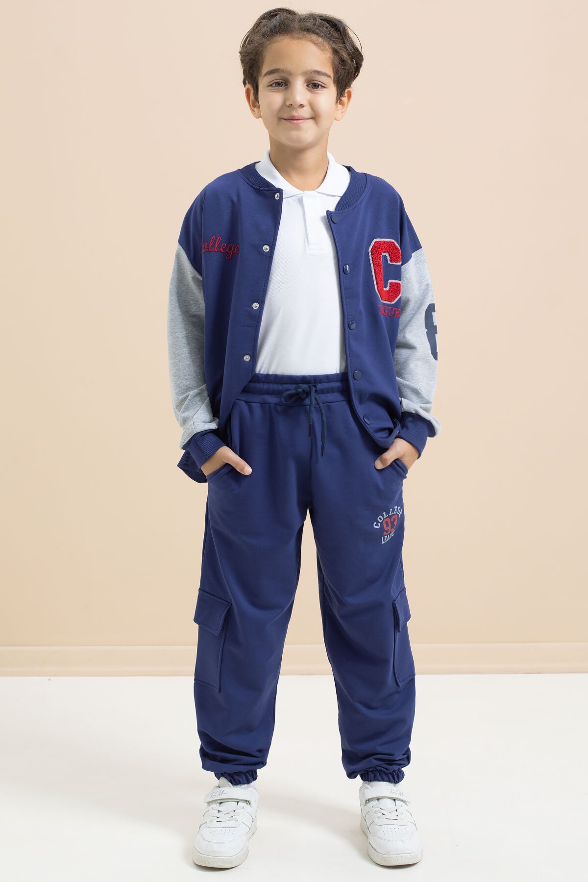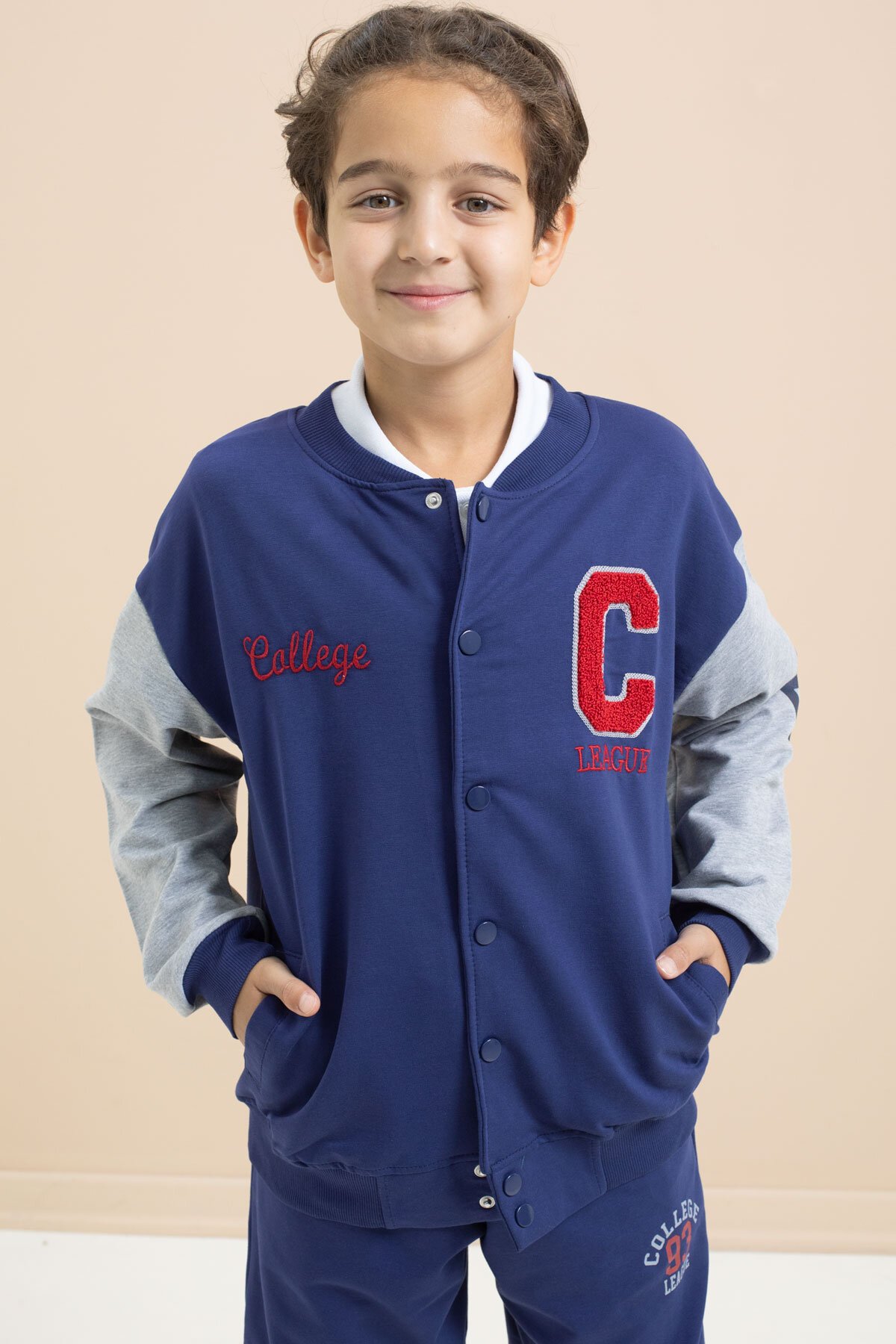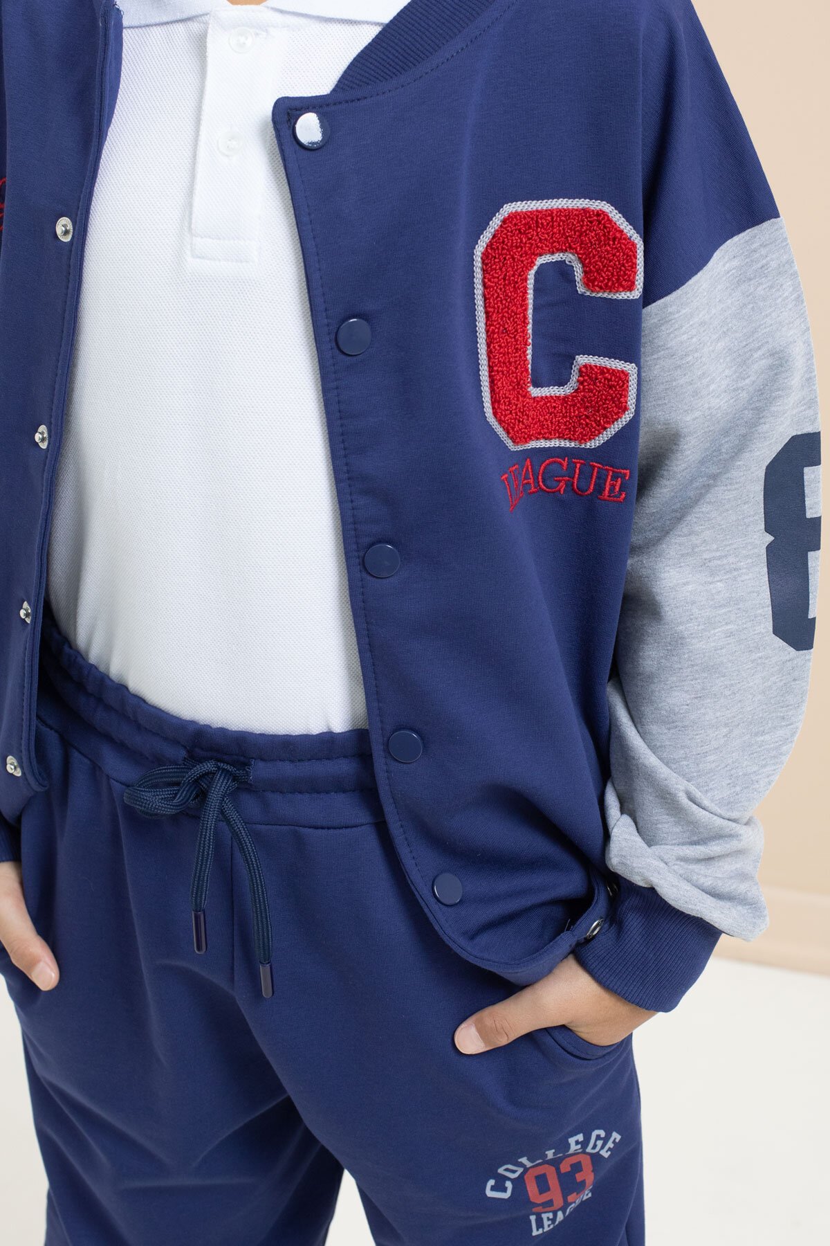 Yazı Nakışlı Çıtçıt Kapamalı Uzun Kolej Ceket ve Beli Lastikli Tek Alttan Oluşan Erkek Çocuk Kolej Eşofman Takımı