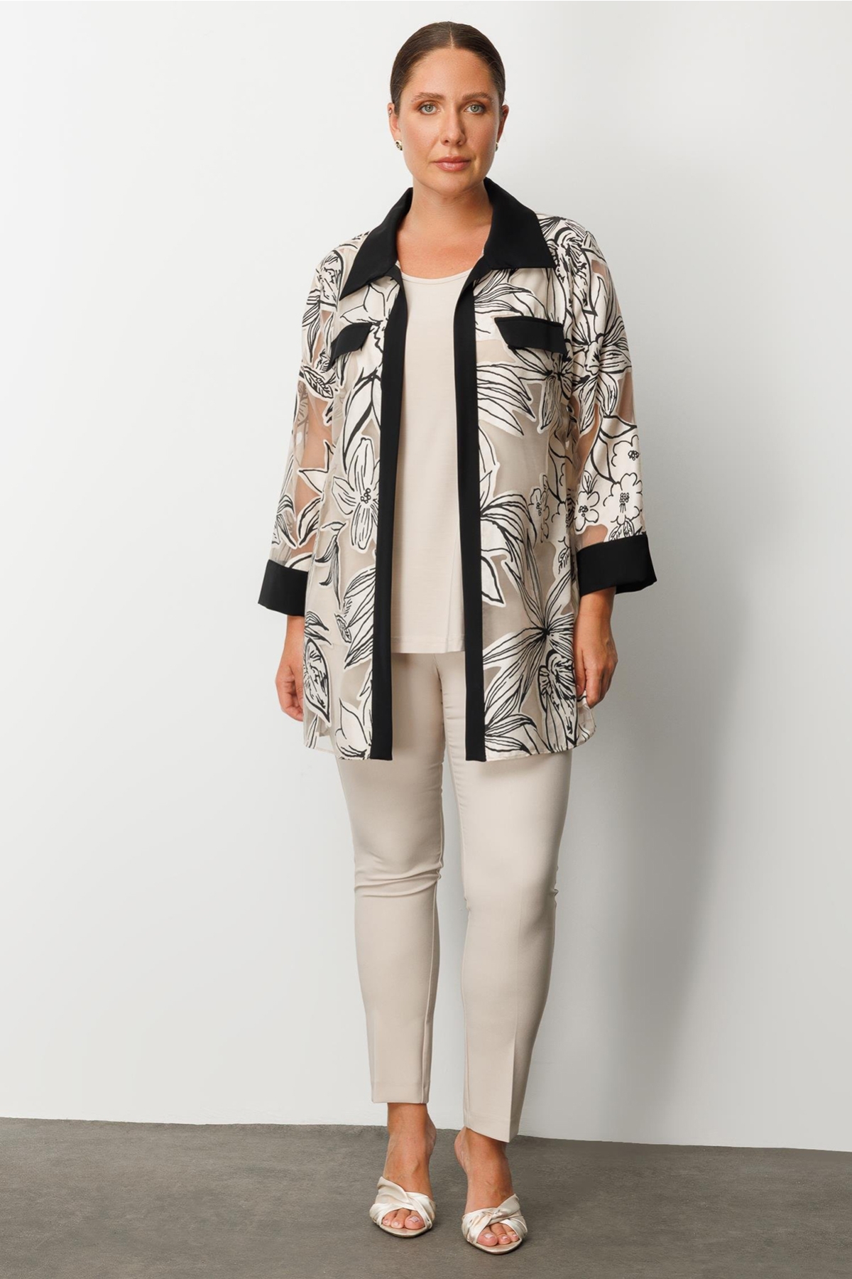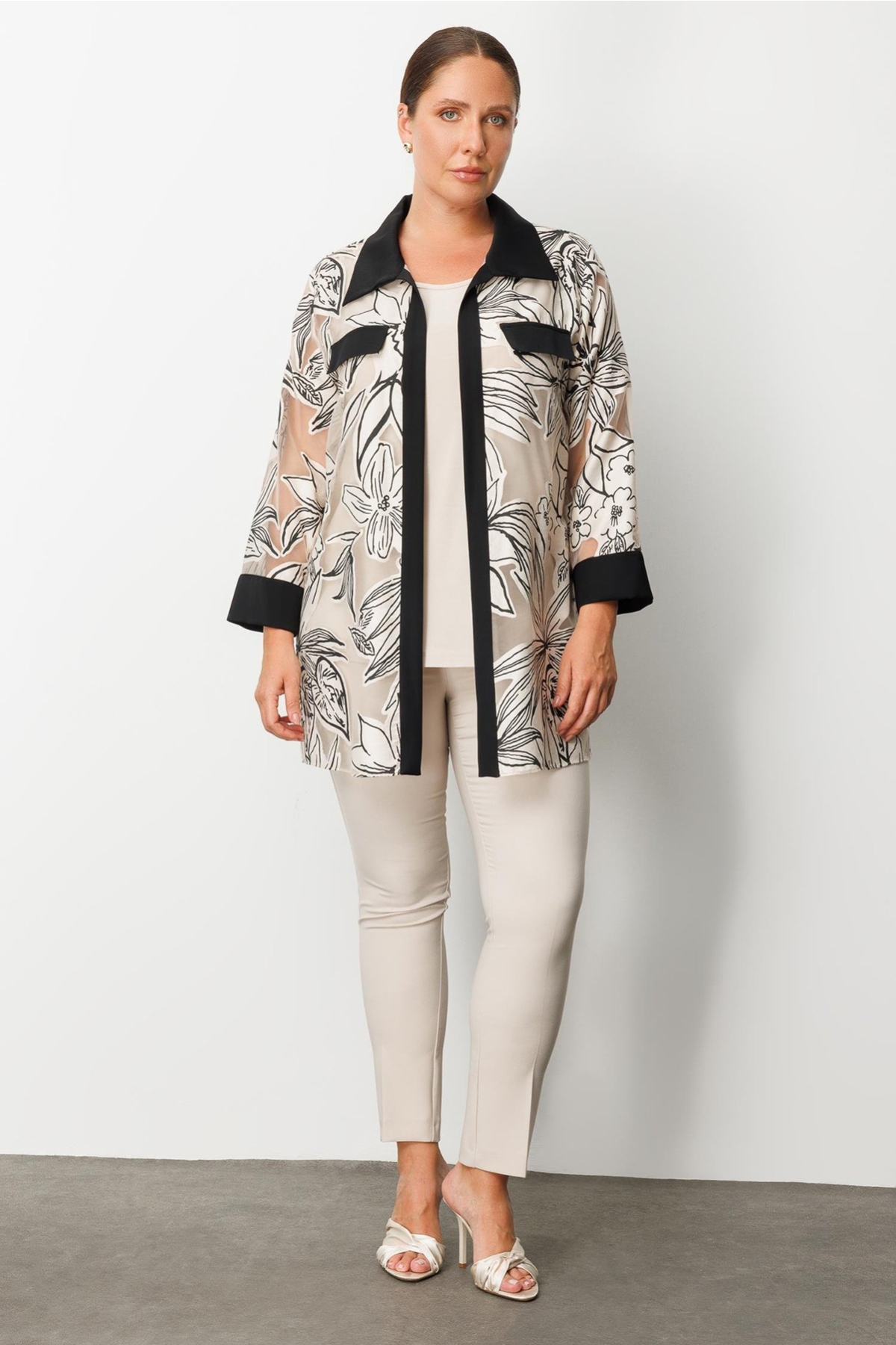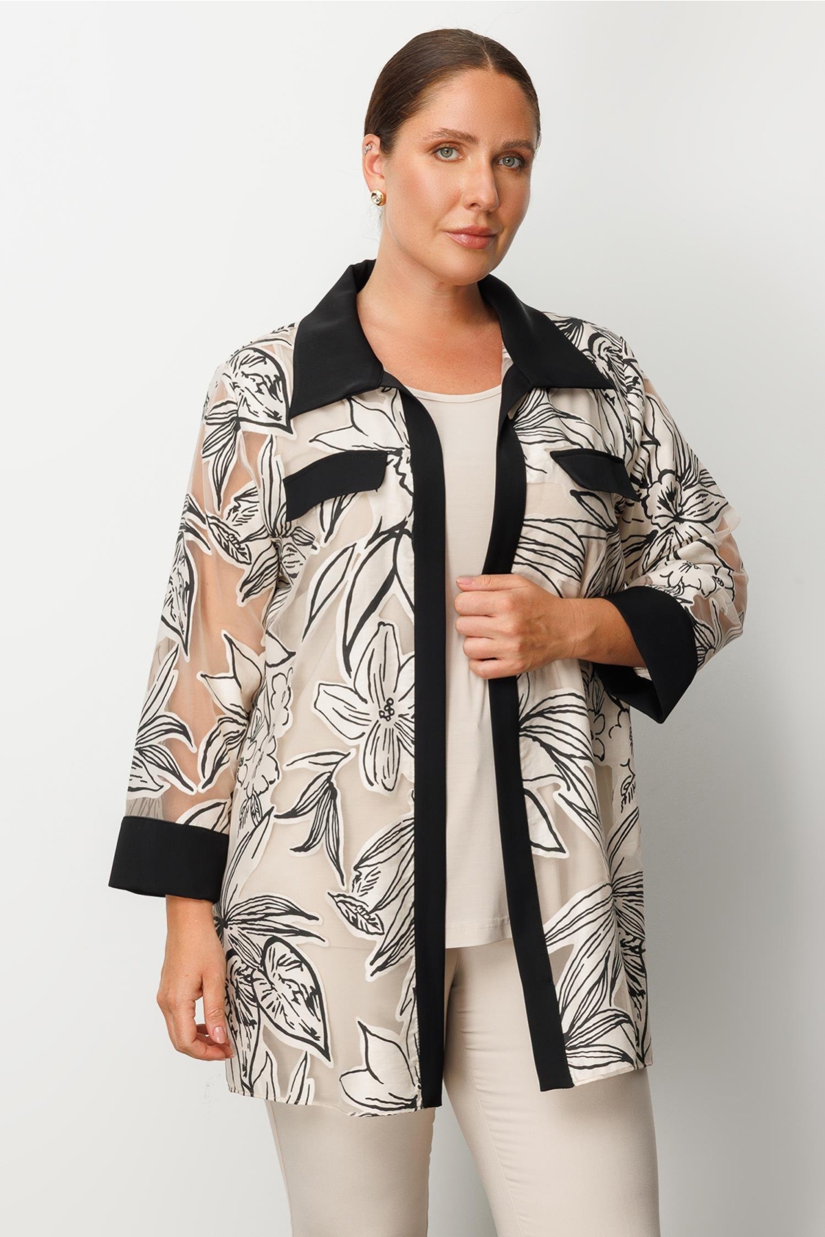 Ürün Tipi: İkili takım;Kalıp Bilgisi: Büyük beden;Materyal Bilgisi: 100% Polyester;Menşei : Türkiye (TR);Detay: Bu model, çiçek desenli organze detaylarıyla zarif ve romantik bir görünüm sunar. Uzun kollu tasarımı sayesinde hem şık hem de mevsim geçişlerine uygun bir kullanım sağlar. İkili takım formuyla uyumlu ve bütüncül bir stil oluşturarak özel günlerde dikkat çekici bir tercih haline gelir;Model Ölçüleri(cm) : Boy - 176, Göğüs - 102, Bel – 82, Kalça - 113;Numune Beden: Modelimiz ürünün en küçük bedenini denemiştir.