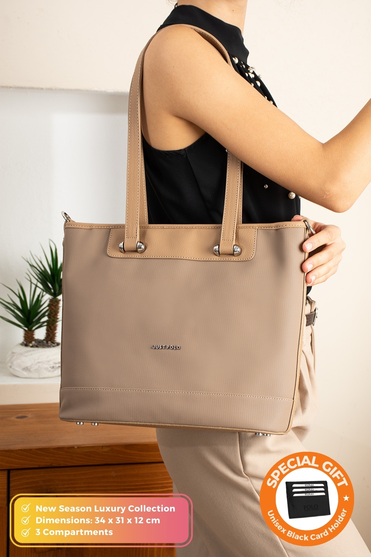 Orijinal Just Polo Collection Yeni Sezon Lüks Kadın Omuz Çantası ; Zarif tasarım ve kaliteli detaylarla stilinizi tamamlar.; ; Geniş Hacimli - 3 Bölmeli ; Ebatlar: 34 x 31 x 12 cm ; Lüks Yumuşak Deri ; Şıklığı ve zerafeti bir arada sunan özel tasarım ; Kullanım: El ve Omuz Çantası ; Ayarlanabilir Çapraz Askılı ; Askı Uzunluğu: 140 cm ; Çıkarılabilir omuz askısı ile El Çantası olarak da kullanılabilir.; ; %100 Doğa Dostu Vegan Deri ; Yırtılma ve kopmalara karşı dayanıklıdır.; ; Deforme olmaz.; ; Üstün kalitesi ve işçiliğiyle hayatınızın her anında yanınızdan ayıramayacağınız Orijinal Just Polo çanta, cüzdan ve aksesuarları keşfedin.; ; Sık tercih edilen Orijinal Just Polo markalı çanta, cüzdan ve aksesuarlara sadece mağazamızdan ulaşabilirsiniz.; ;