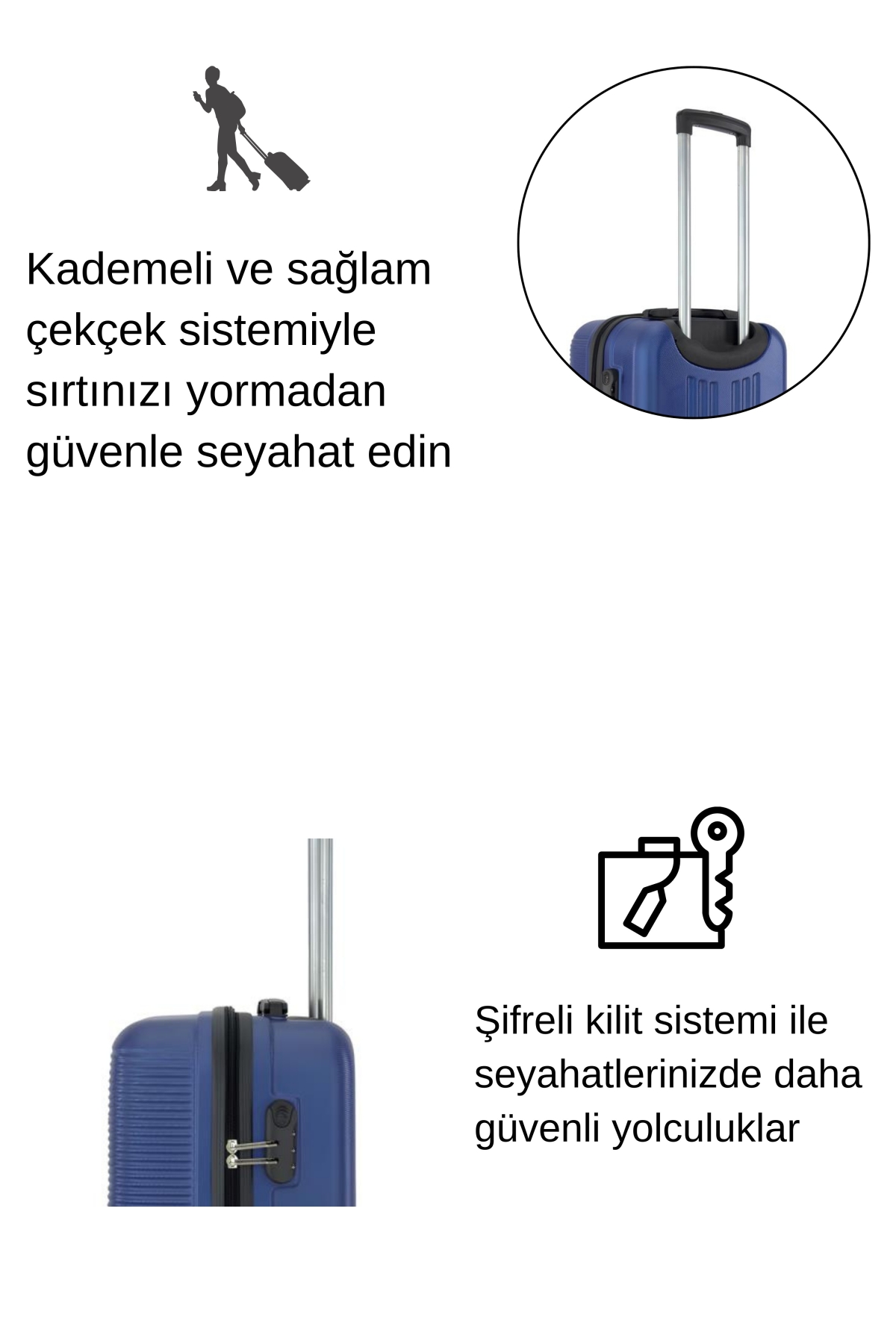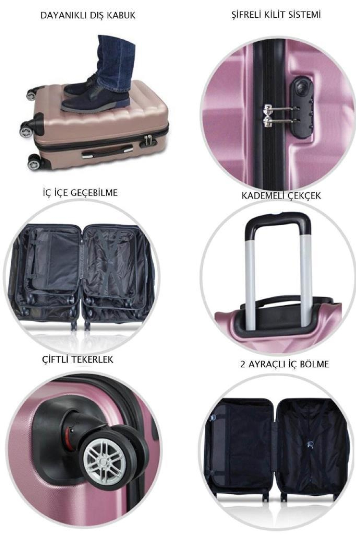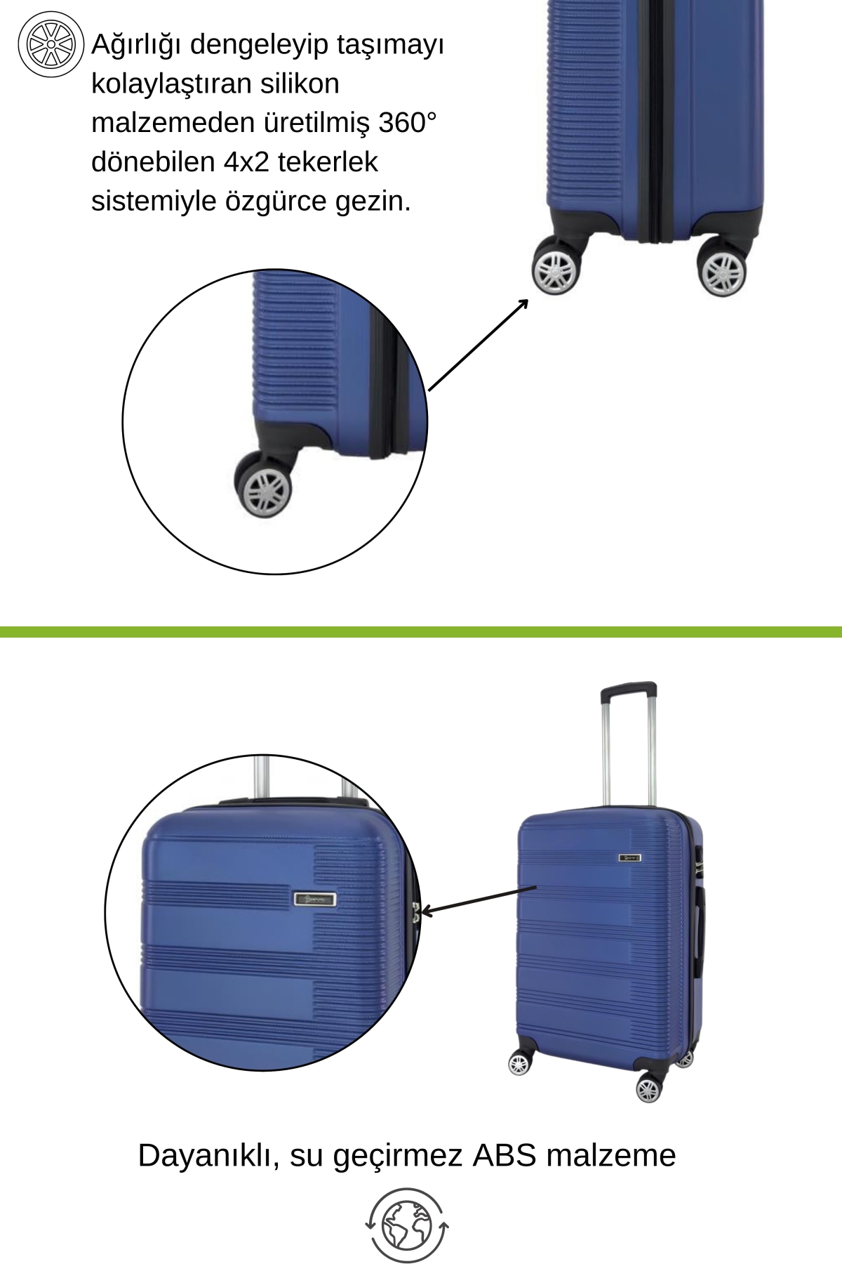 EBATLAR: Orta Boy: 65 cm En: 43 cm Derinlik: 28 cm 3,2 kg 70 Lt Ürün Ayrıntıları: Güçlü ve daha dayanıklı %100 ABS hammadde malzemesi ile üretilmiştir . Darbelere karşı son derece dayanıklı ve güçlüdür. Gövde üzerine monte edilen tüm aksesuarlar, perçin yerine çelik vida ile tutturulmuştur. Böylelikle hem sağlamlık ve uzun ömür sağlanır, hem de olası parça değişimleri kolay bir şekilde sorunsuz gerçekleştirilebilir. Mat pütürlü yüzeyi sayesinde çizilmelere karşı dayanıklıdır. Ağırlık merkezi odaklı kademeli çek çek 'e sahiptir. Eşyalarınızı ayırabiliceğiniz ayraçlı iki ayrı bölmesi bulunan iç donanım ile eşyalarınız valiz içinde dağılmaz. Silikon kaplı elinizi acıtmayan yumuşak ergonomik tutma sapı ile valizinizi daha rahat taşırsınız. Ağırlığı dengeleyip taşımayı kolaylaştıran, kauçuk-silikon malzemeden üretilmiş 360 derece dönebilen 4x2 tekerlek sistemi Sık dişli kalın fermuarlar Muadillerine göre daha hafif gövde yapısı ile bagaj kotası dostudur. Ürünler iç içe geçebildiği için kullanmadığınızda yer kaplamaz.(Büyük-Orta-Kabin) Ayarlanabilir şifreli kilit sistemi Tüm donanımıyla yerli ve orijinal üretim. Değiştirilebilir bütün parçalar, işçilik ve üretim hatalarına karşı 1 yıl garantilidir.
