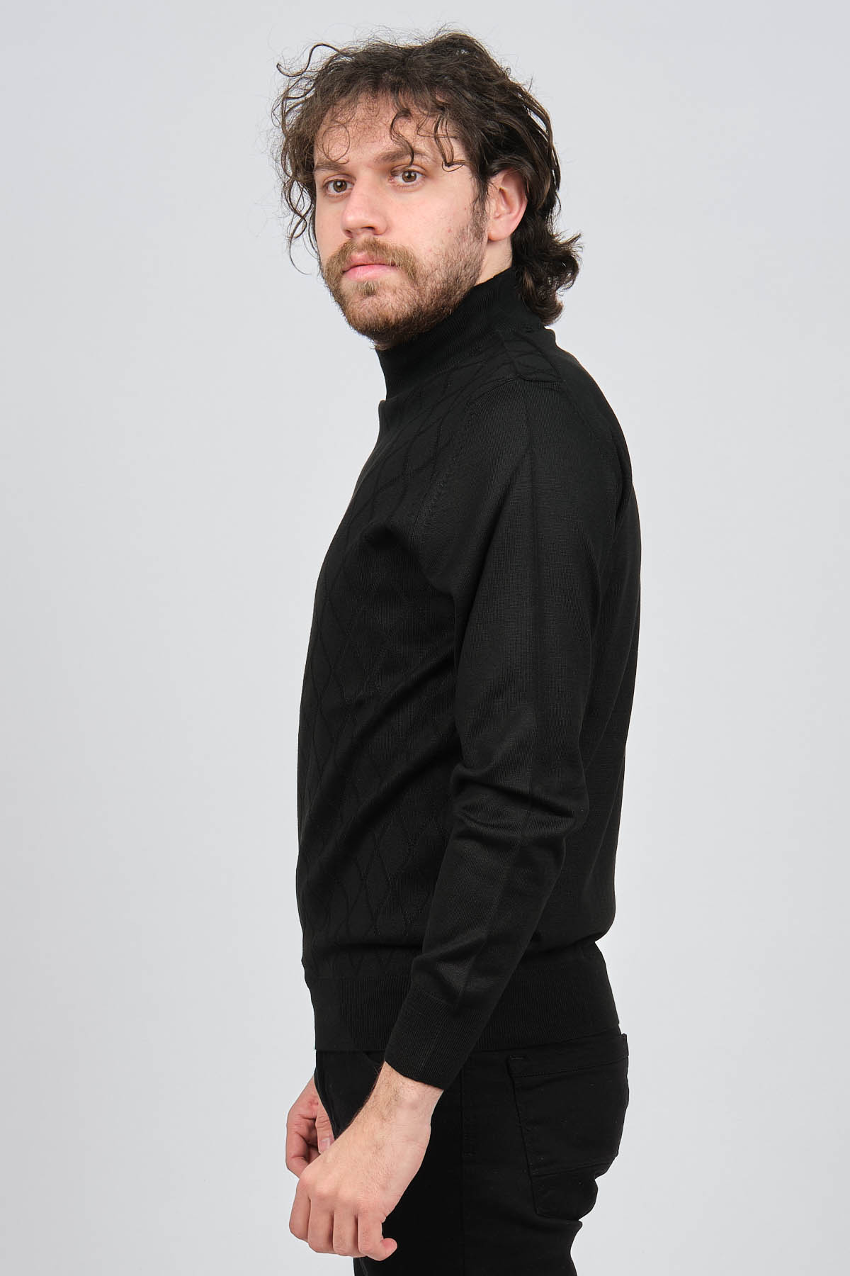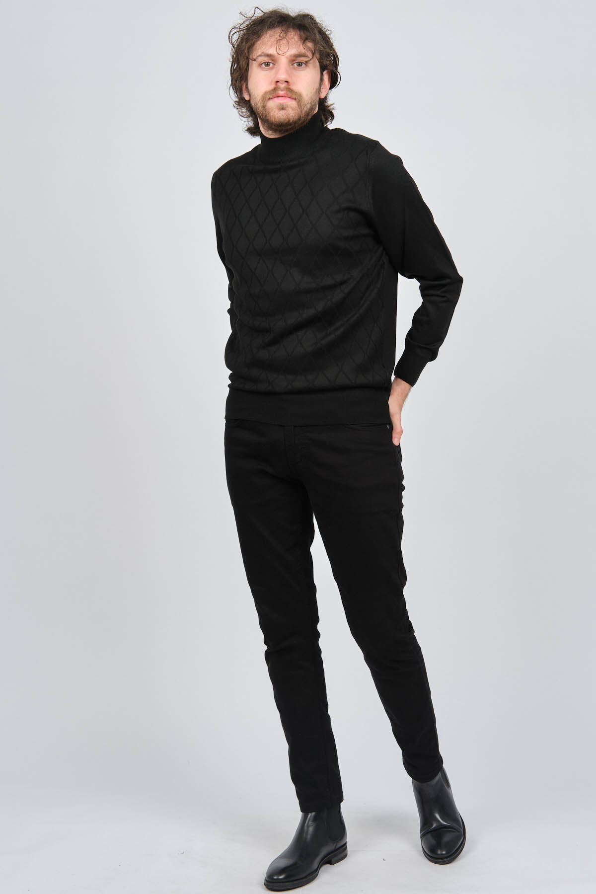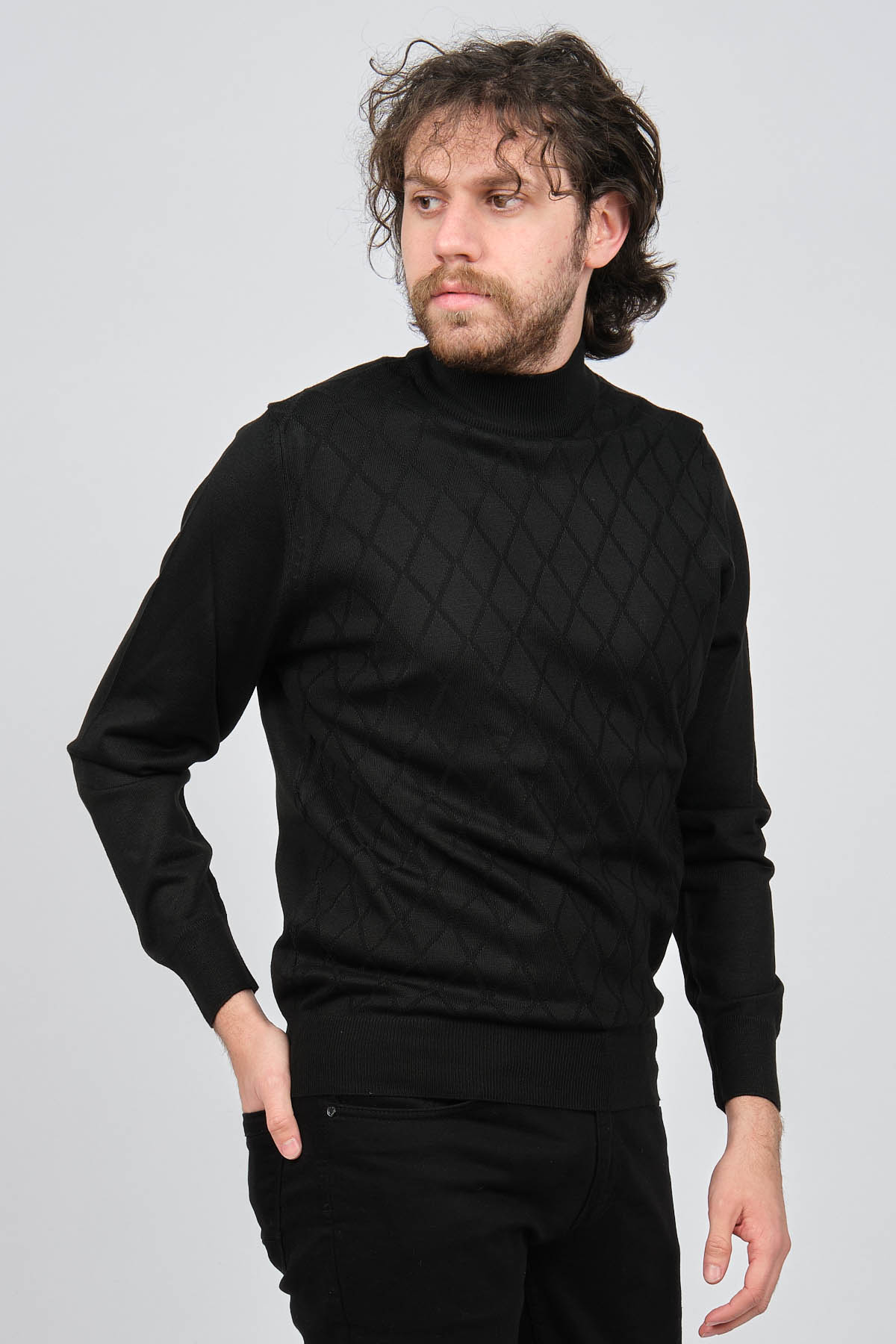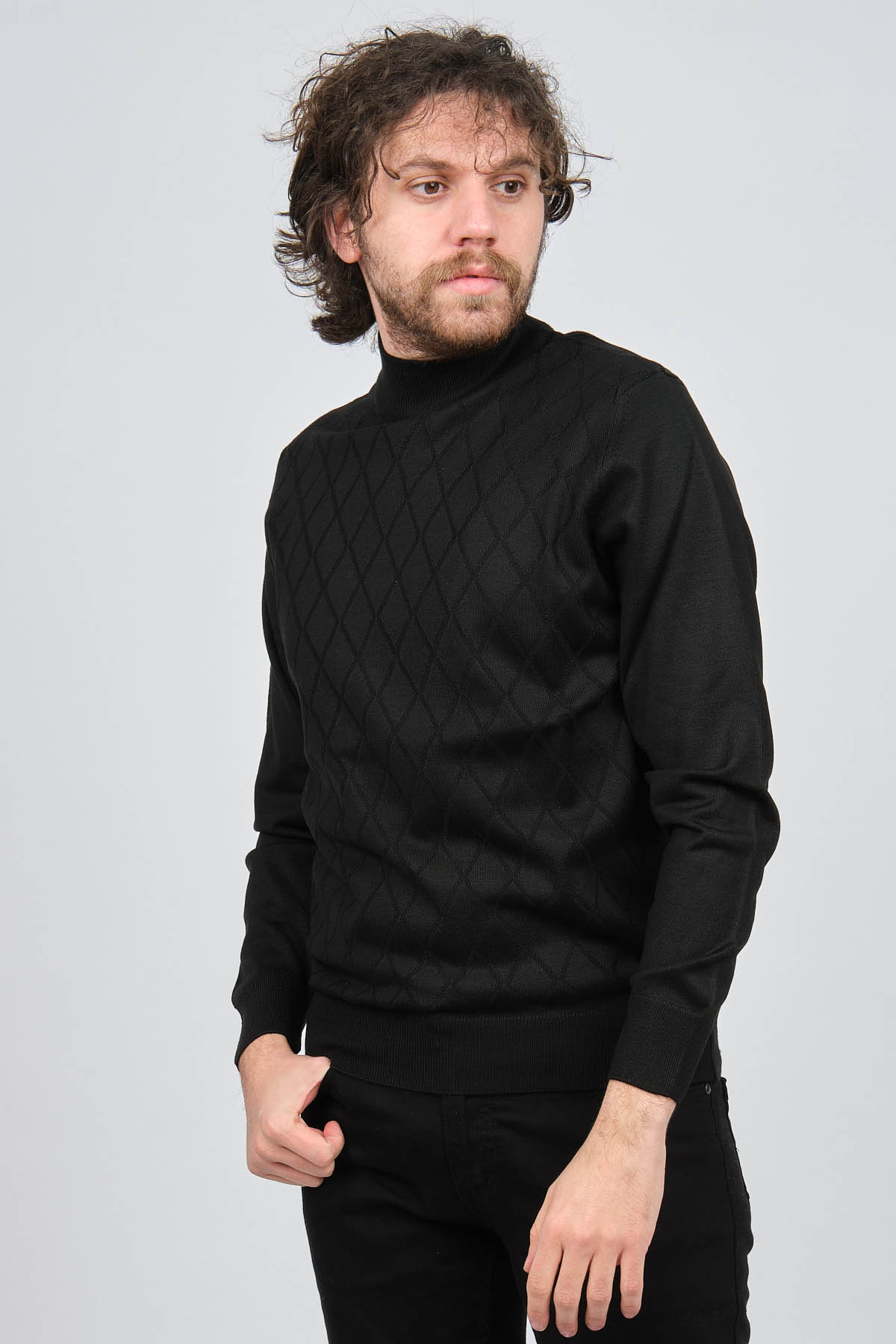 Ürün Tipi: Kazak;Materyal Bilgisi: %30 Yün, %70 Akrilik;Kalıp Bilgisi: Standart;Detay: Yarım balıkçı yaka, Baklava desenli, Uzun kollu, Yün kazak;Model Ölçüleri(cm) / Üzerindeki Ürün: Boy - 188, Göğüs - 102, Bel - 90, Kalça - 103, / M Beden