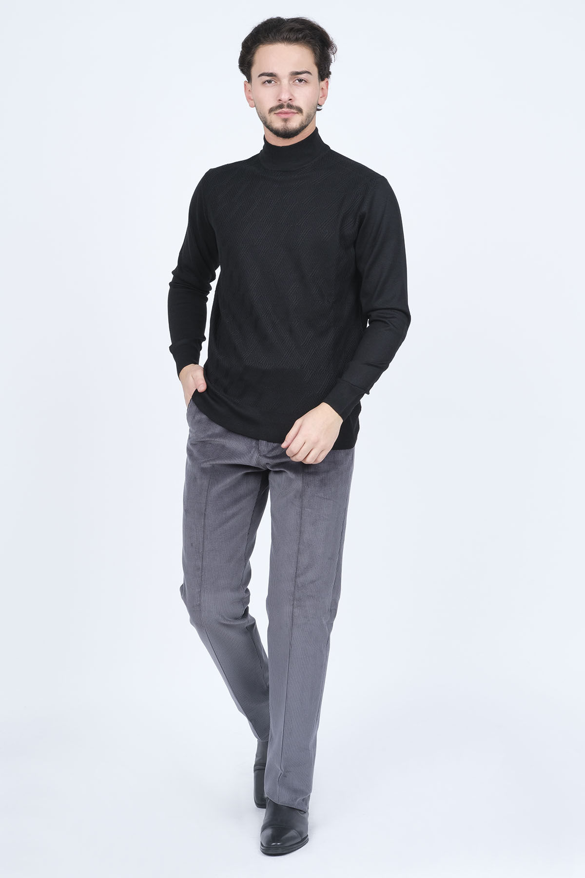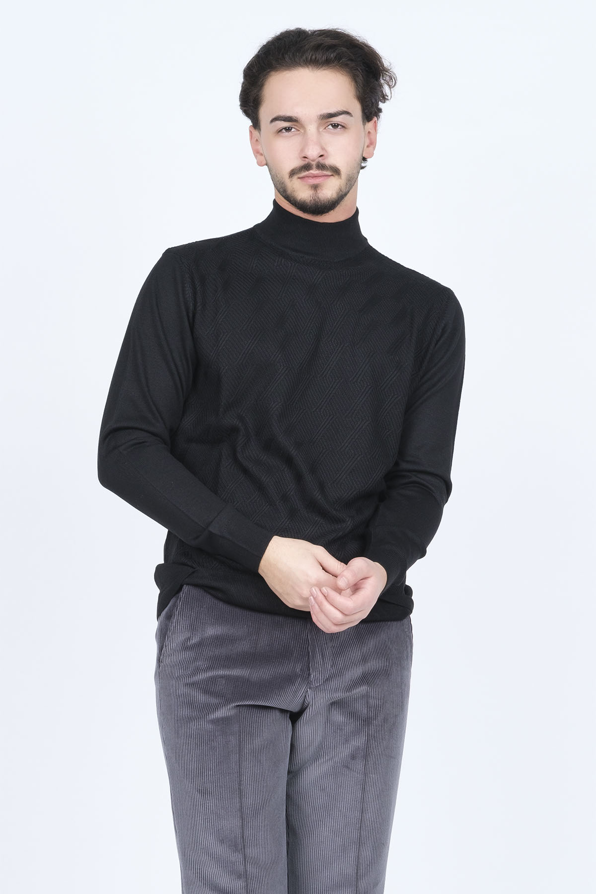 Ürün Tipi: Kazak;Materyal Bilgisi : %30 Yün, %70 Akrilik;Kalıp Bilgisi: Standart;Detay: Yarım balıkçı yaka, desenli yün triko kazak;Model Ölçüleri(cm) / Üzerindeki Ürün: Boy - 188, Göğüs - 96, Bel - 82, Kalça - 96, / L Beden;