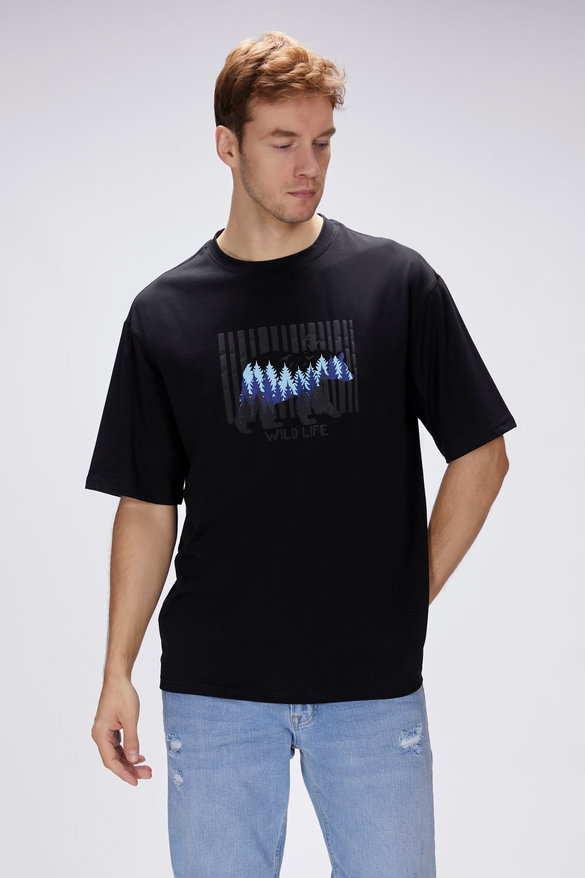 Baskı detaylı bisiklet yaka rahat kesim erkek tişört