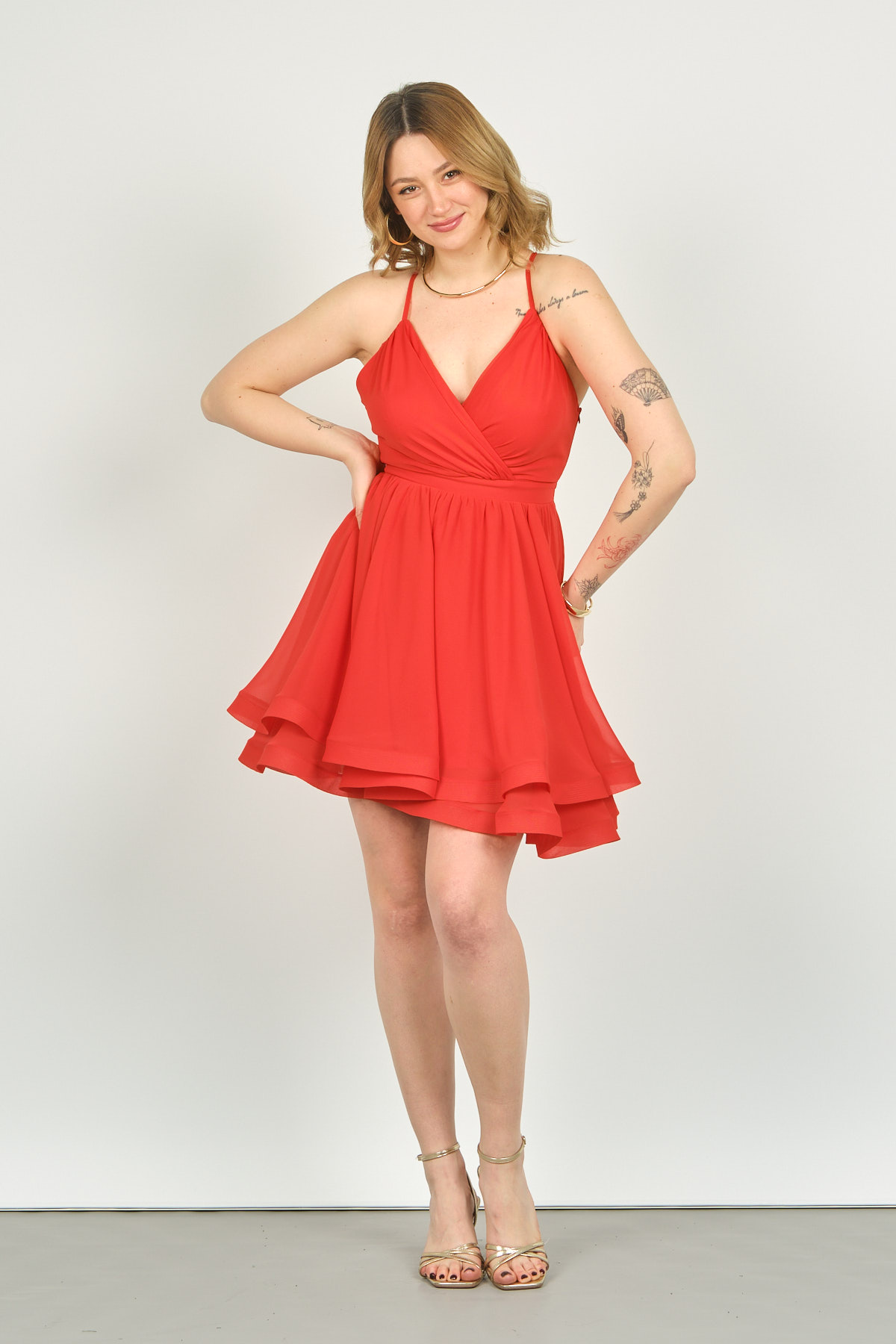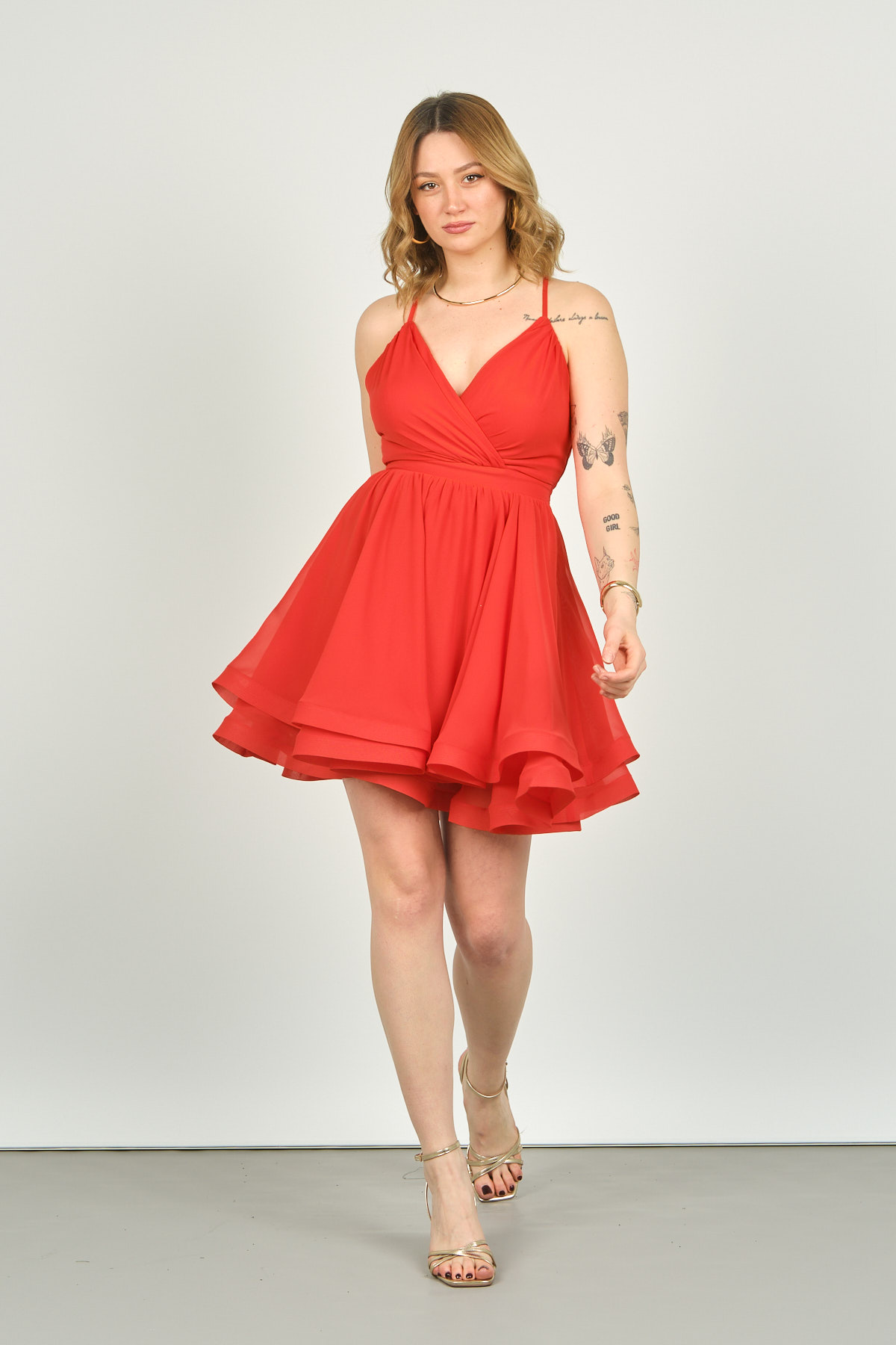 Ürün Tipi: Abiye Elbise;Materyal Bilgisi: Şifon;Kalıp Bilgisi: Tam kalıp;Detay: İp askılı, sırt detaylı, kloş, astarlı abiye elbise;Model Ölçüleri(cm) / Üzerindeki Ürün: Boy - 173, Göğüs - 86, Bel - 67, Kalça –92 / 38 beden;