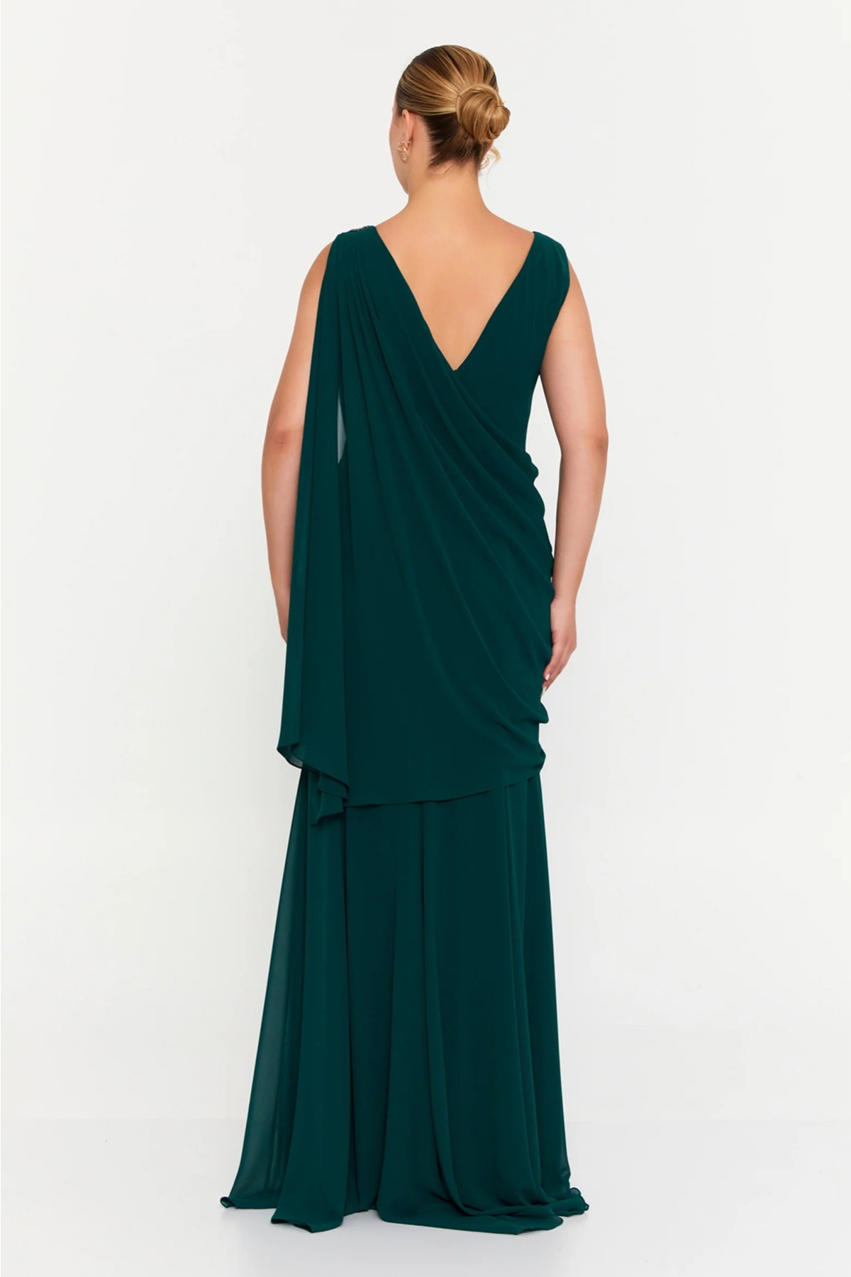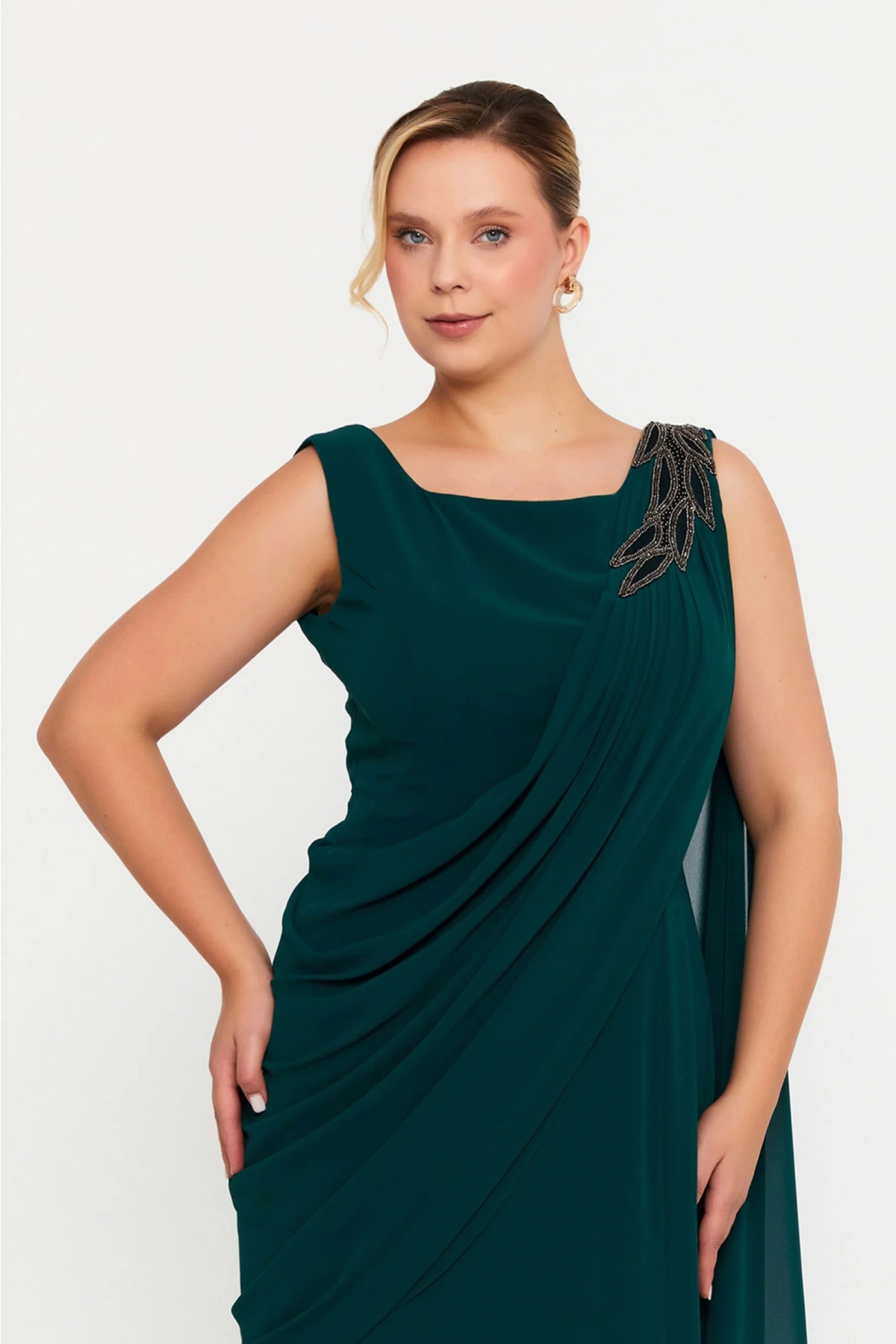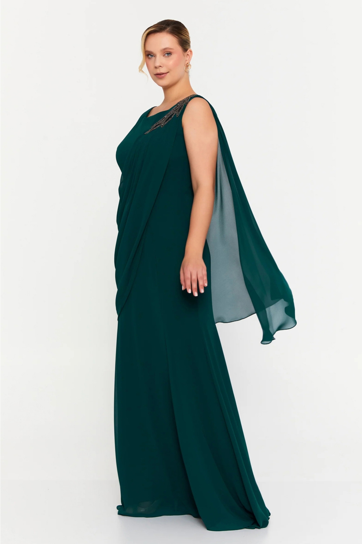 Ürün Tipi: Abiye Elbise;Kalıp Bilgisi: Büyük beden;Materyal Bilgisi: 100% Polyester;Menşei : Türkiye (TR);Detay: Tek omuz işlemeli tasarımıyla zarafeti ön plana çıkaran bu maxi abiye elbise, viskon kumaşın yumuşak ve dökümlü yapısıyla vücuda doğal bir uyum sağlar. Kolsuz kesimiyle sade bir şıklık sunarken, tek kol pelerin detayı elbiseye dramatik ve etkileyici bir hava katar. Astarlı iç yapısı sayesinde konforlu bir kullanım sağlayan bu model, özel davetlerde sofistike bir stil arayanlar için ideal bir tercihtir;Model Ölçüleri(cm) / Üzerindeki Ürün: Boy - 175, Göğüs - 105, Bel – 80, Kalça - 108;Numune Beden: Modelimiz ürünün en küçük bedenini denemiştir;Ürün Boyu(cm): 190;