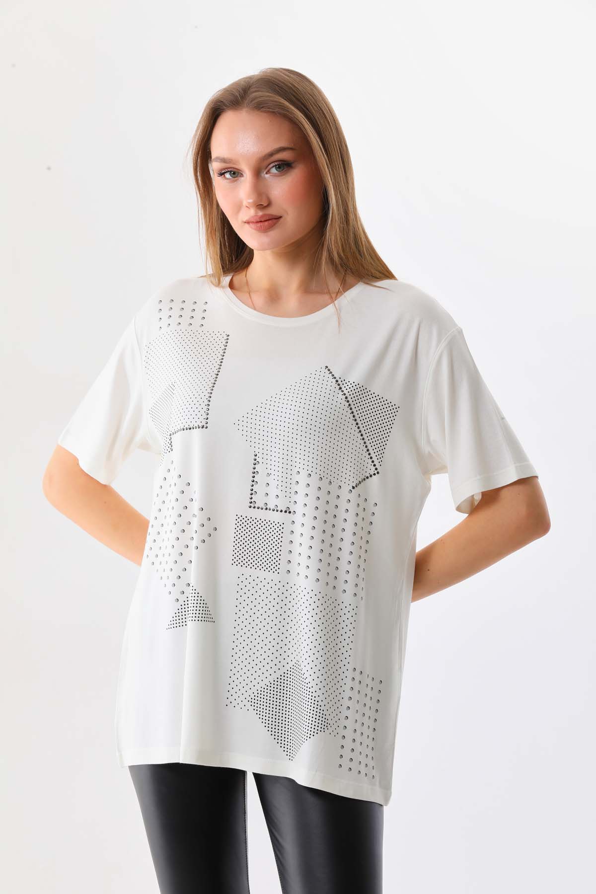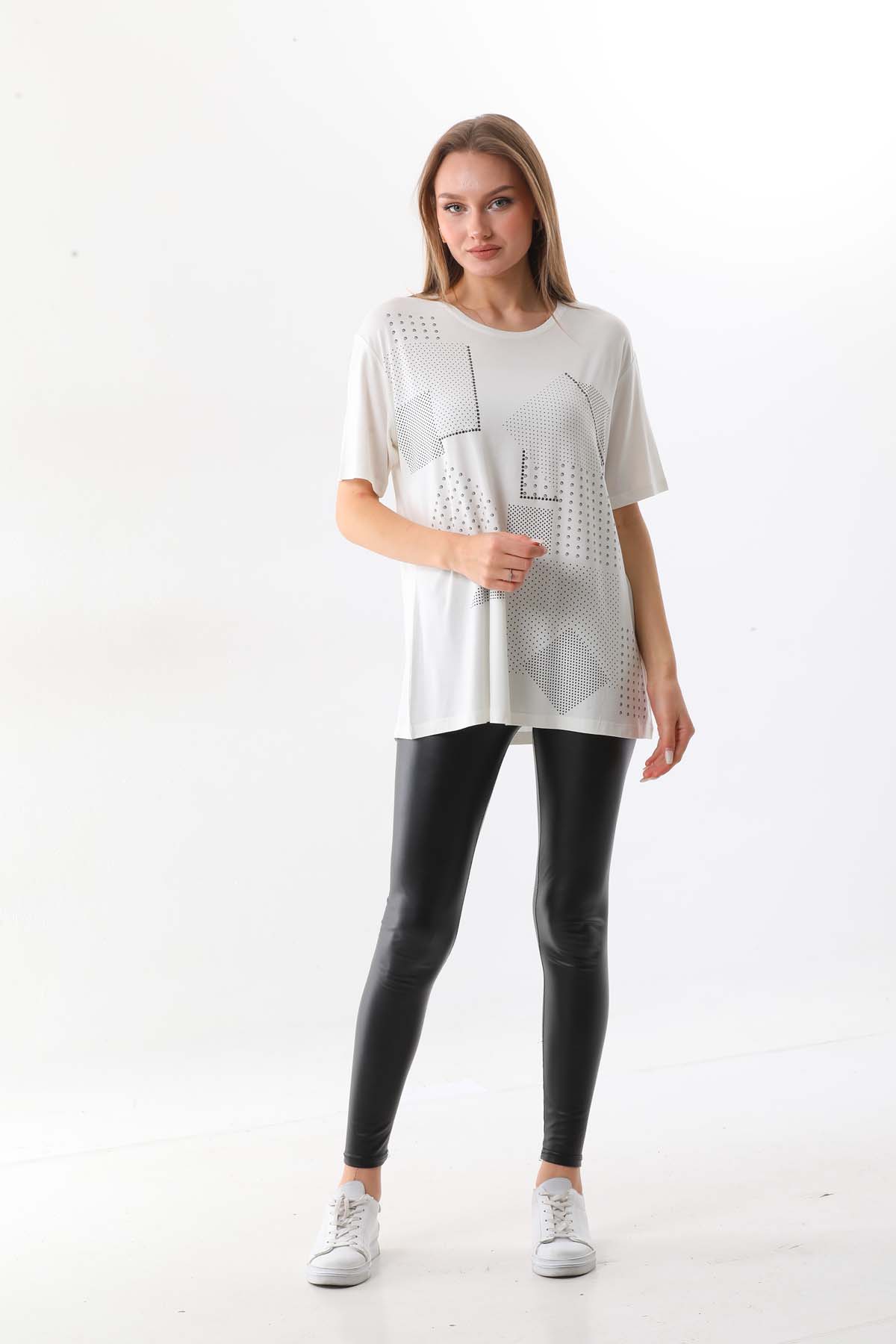 Ürün Tipi: Bluz;Kalıp Bilgisi: Standart;Materyal Bilgisi: %95 Viskon %5 Elestan;Detay: Desenli, kısa kol, bisiklet yaka bluz;Model Ölçüleri(cm) / Üzerindeki Ürün: Boy - 174, Göğüs - 87, Bel – 64, Kalça - 95 / 1-S beden;