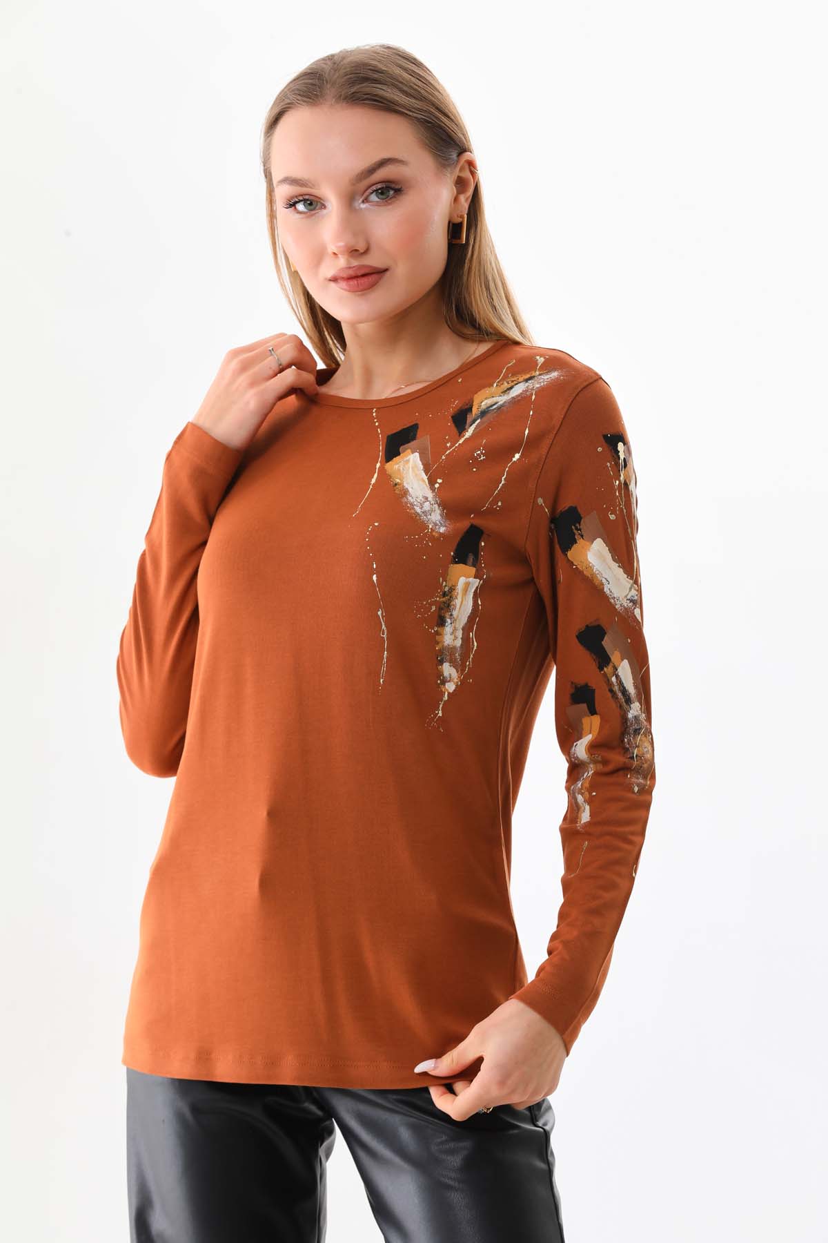 Ürün Tipi: Bluz;Kalıp Bilgisi: Standart;Materyal Bilgisi: %93 Viskon %7 Elestan;Detay: Desenli, uzun kol, bisiklet yaka bluz;odel Ölçüleri(cm) / Üzerindeki Ürün: Boy - 171, Göğüs - 86, Bel – 63, Kalça - 95 / S beden;